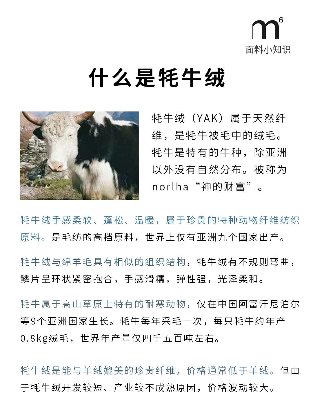 •牦牛绒保暖系数比羊绒高出30%,透气性是羊绒的1.2倍,牦牛绒产量稀少,一头牦牛一年的产量只有250克细绒。
