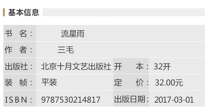 她以一支笔坚持看守个人文字上的简单和朴素;从遥远的撒哈拉到敦煌戈壁,她不随波逐流,也不诠释人生,只做生活的见证者;她是我们心中浪漫、洒脱、真性情的永远的三毛,永恒的传奇。《流星雨》是三毛的演讲精选集,亦收录她的两篇说书和三段采访,展现了读者所熟悉的“三毛”之外不一样的人生。