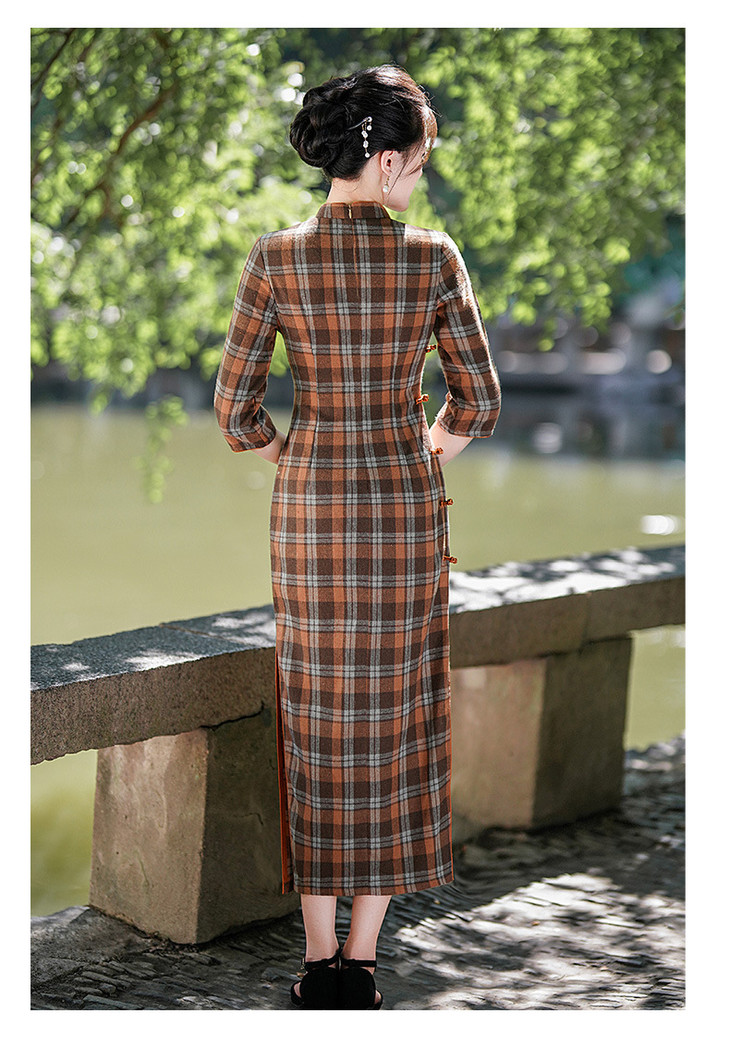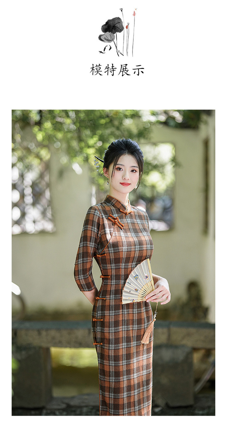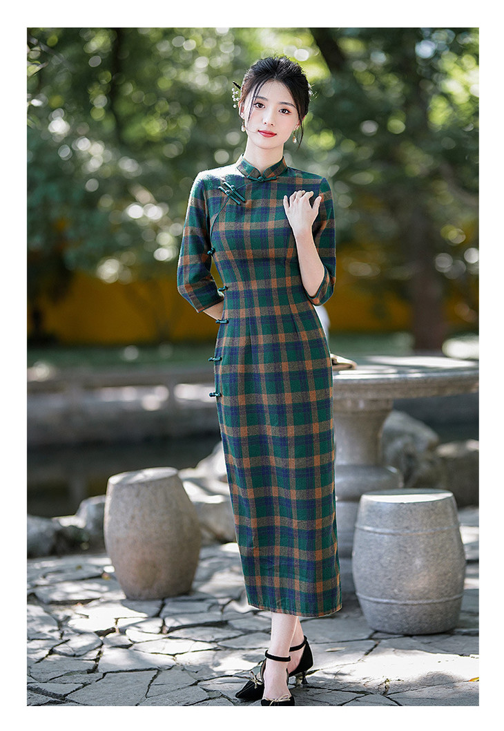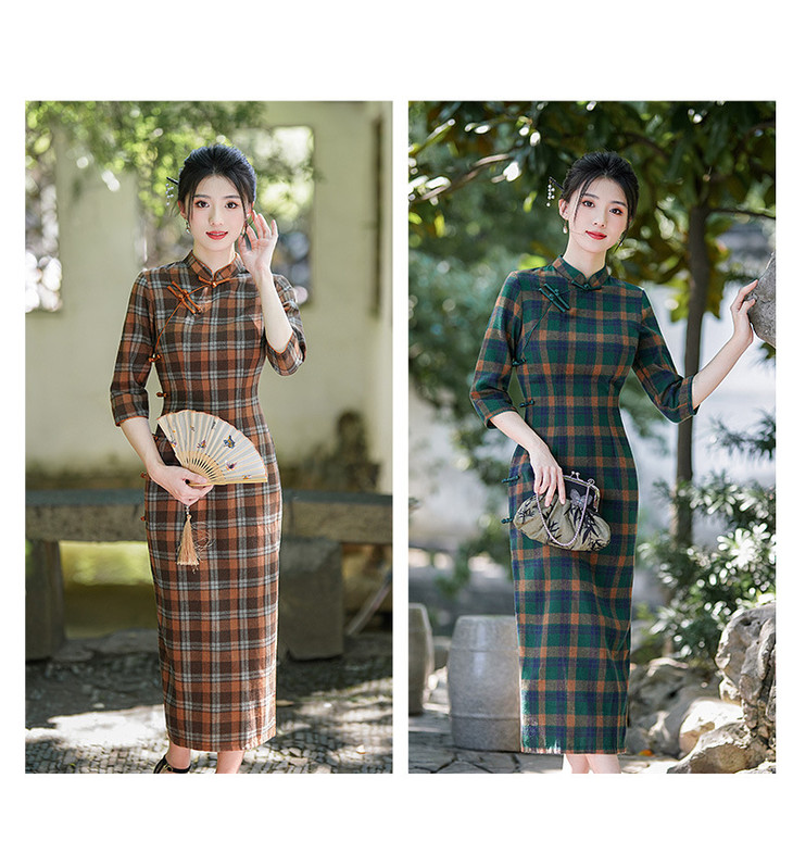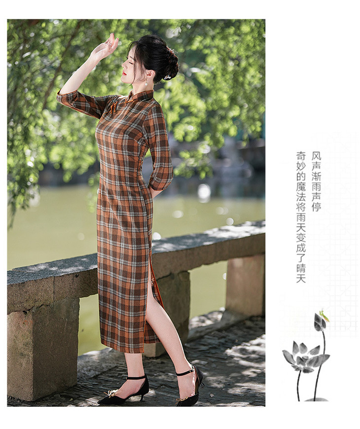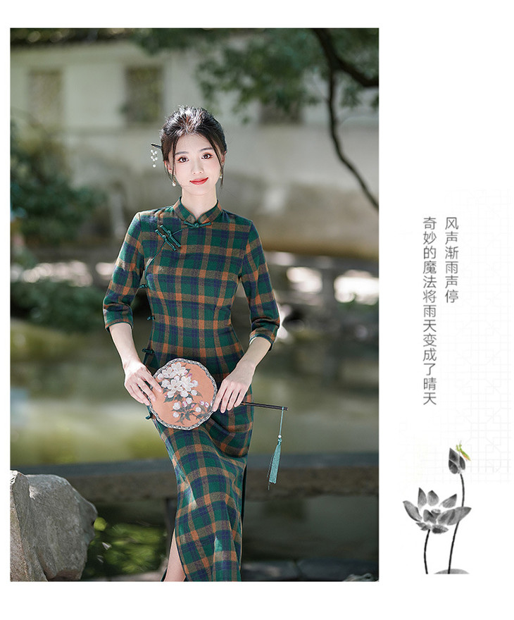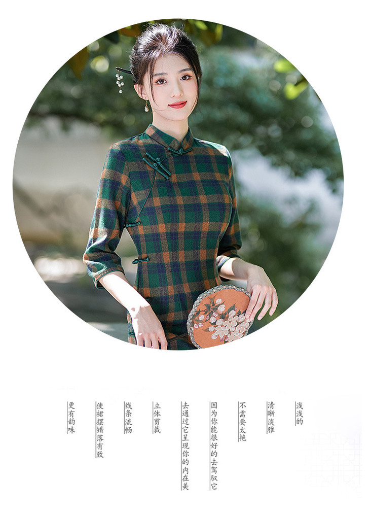 新款民国风,格子旗袍七分袖文艺气质修身优雅连衣裙GSJ-3394
