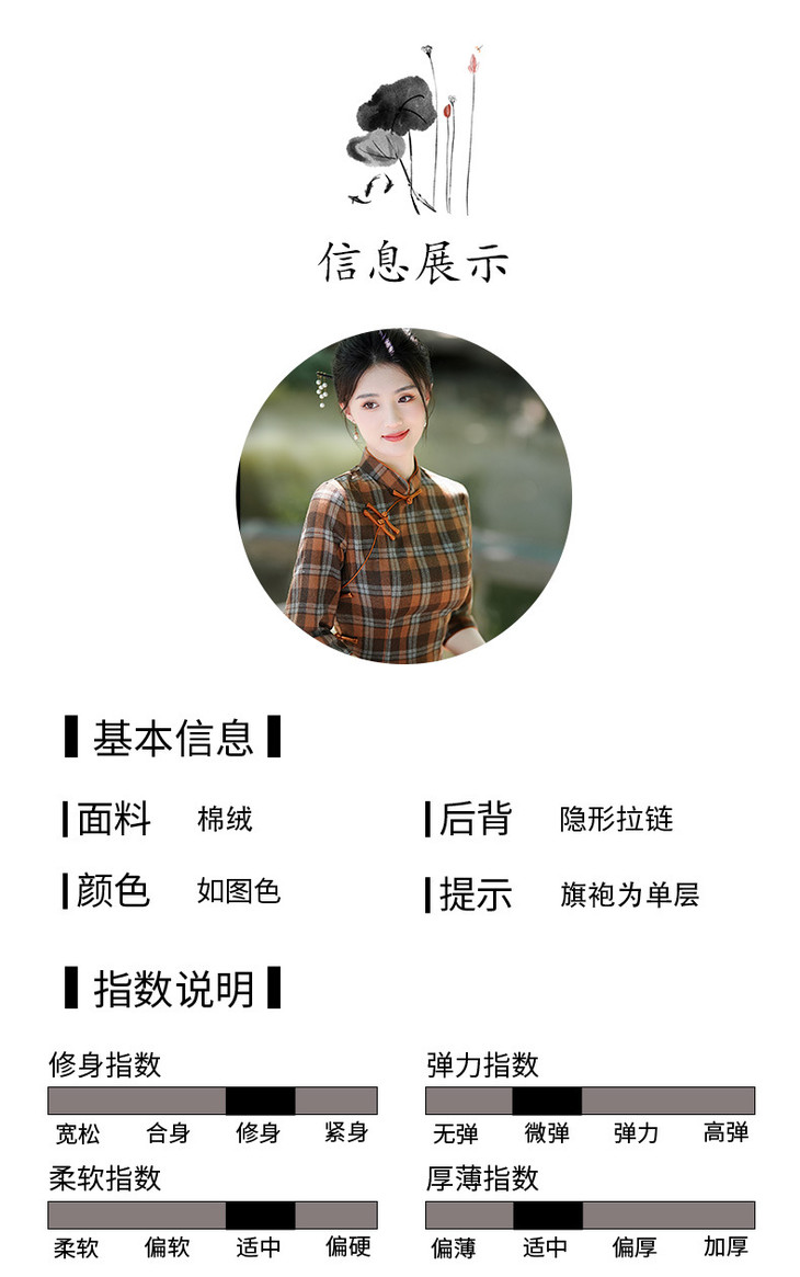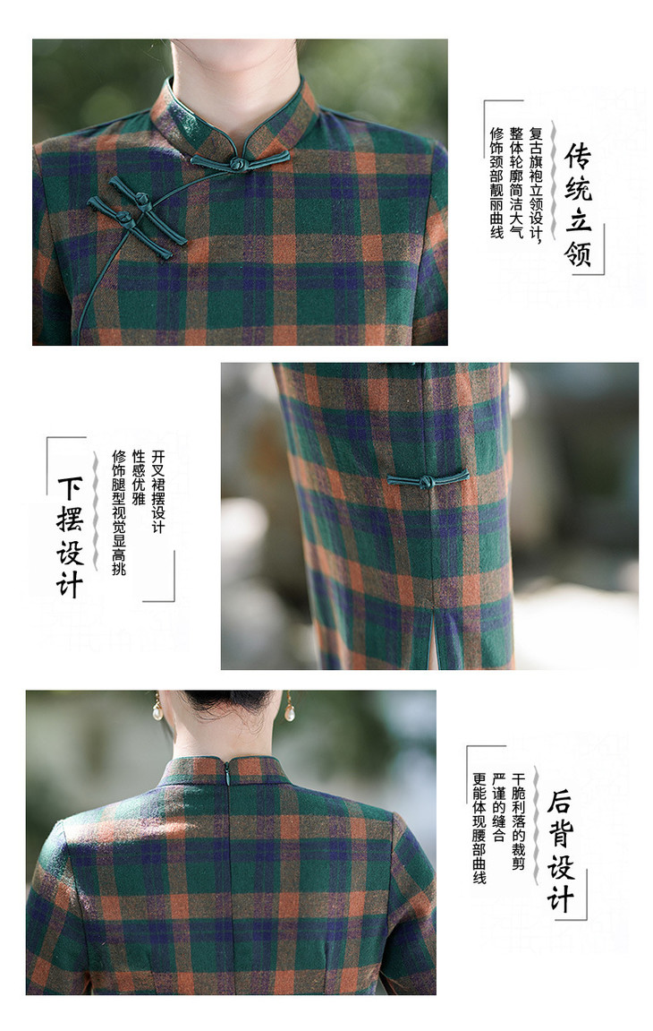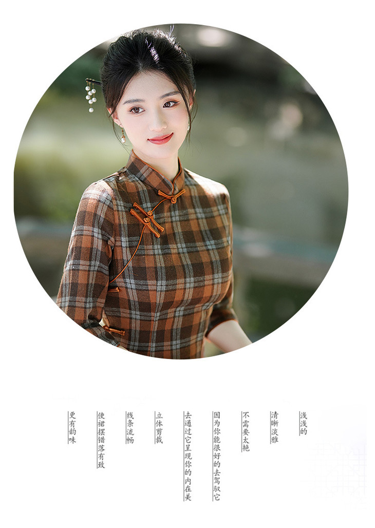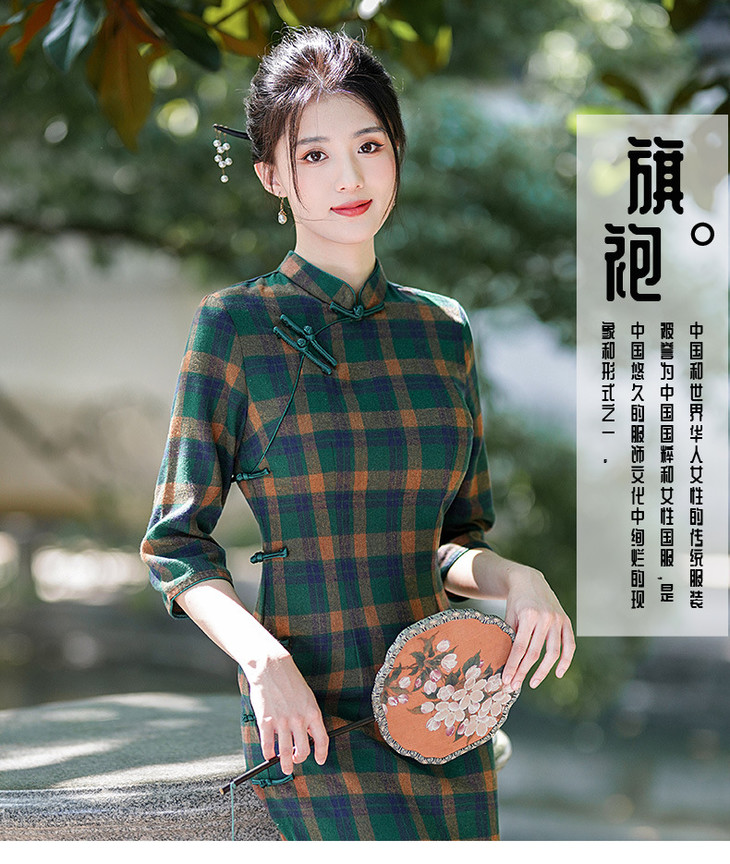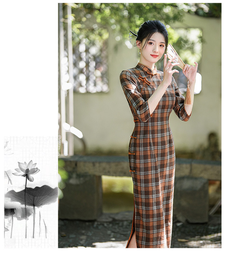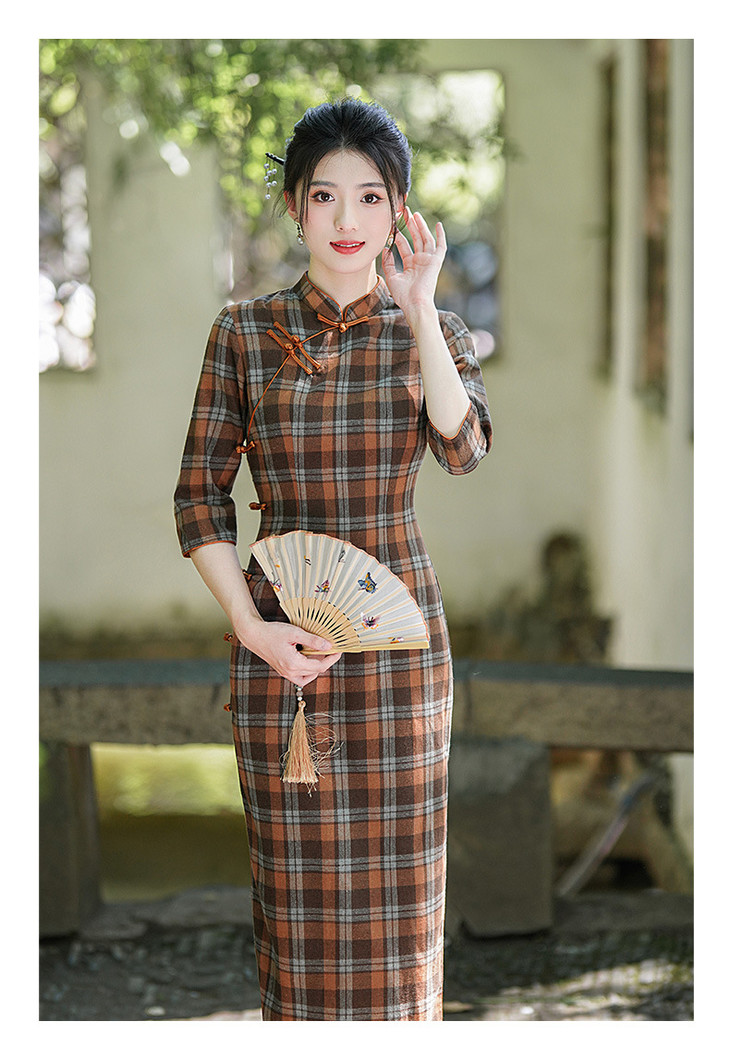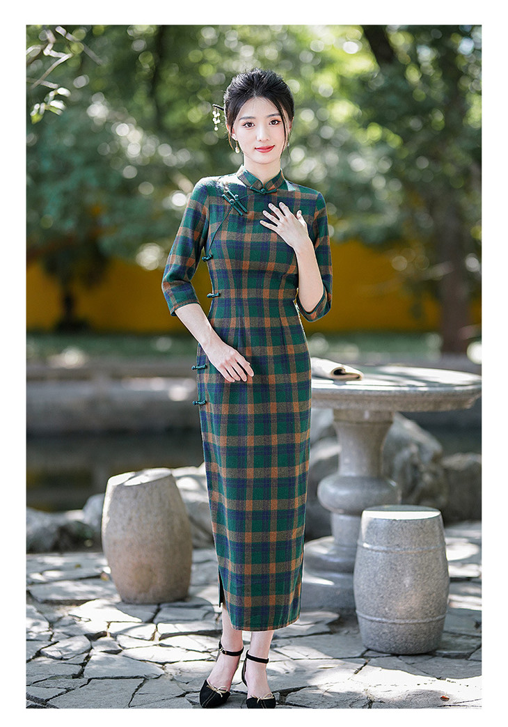 新款民国风,格子旗袍七分袖文艺气质修身优雅连衣裙GSJ-3394