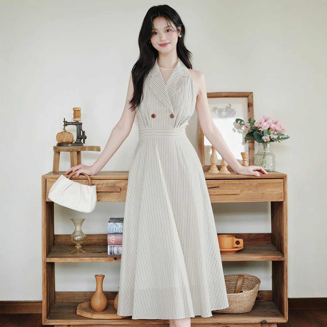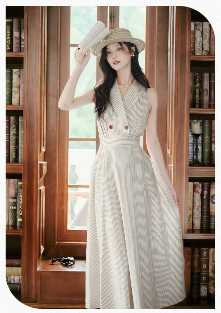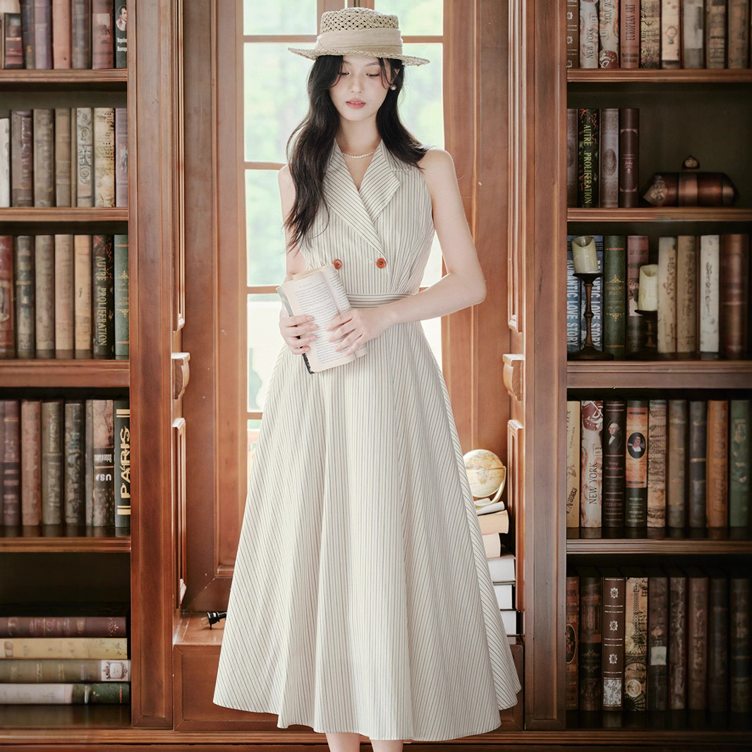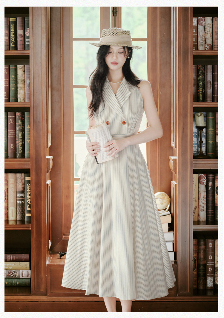2025夏季新款气质优雅时尚条纹无袖西装领长款宽松显瘦收腰连衣裙