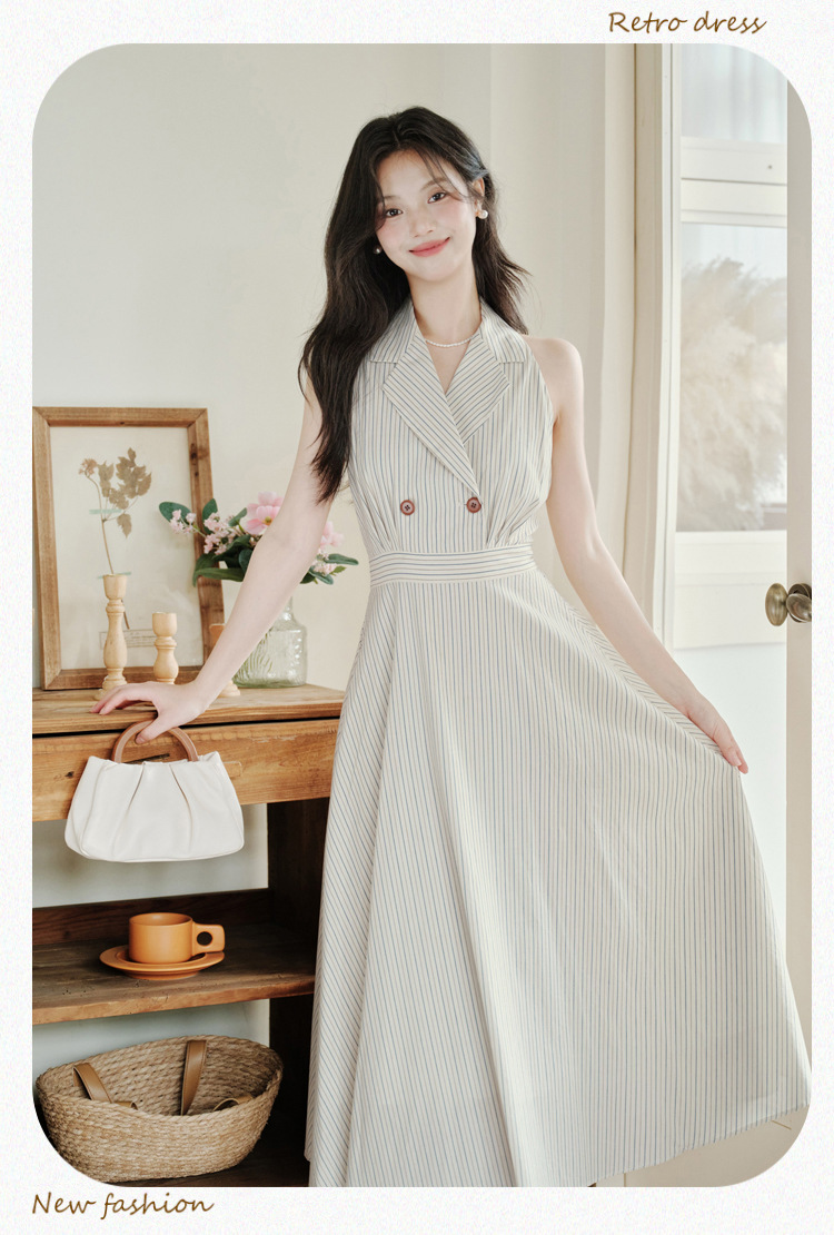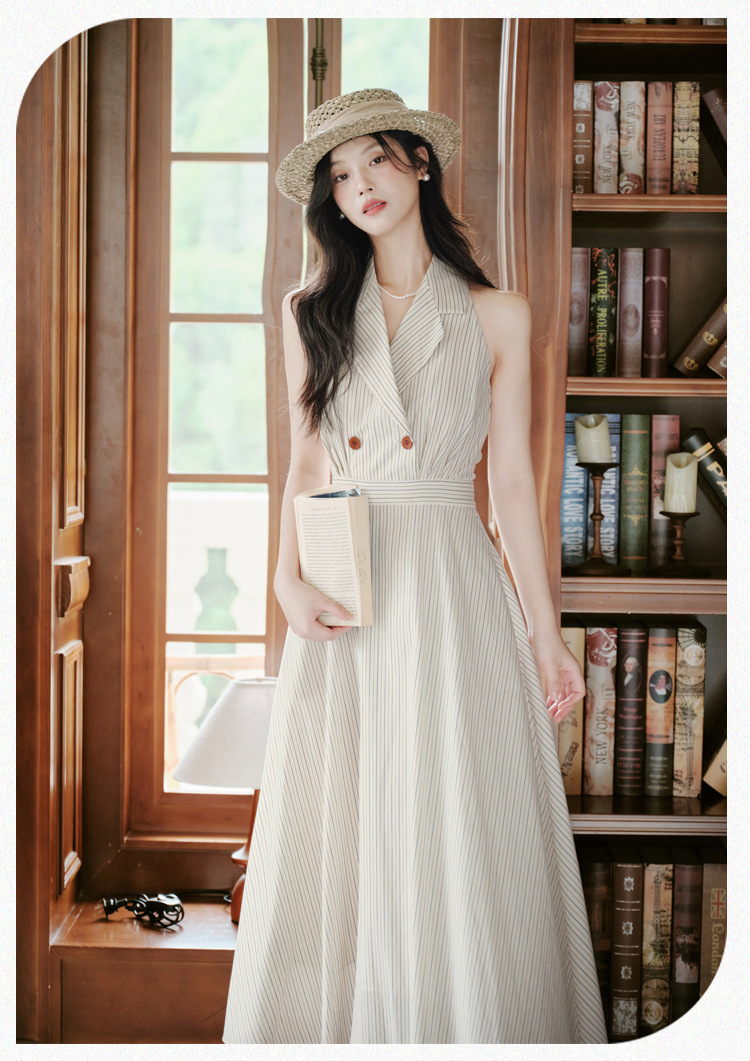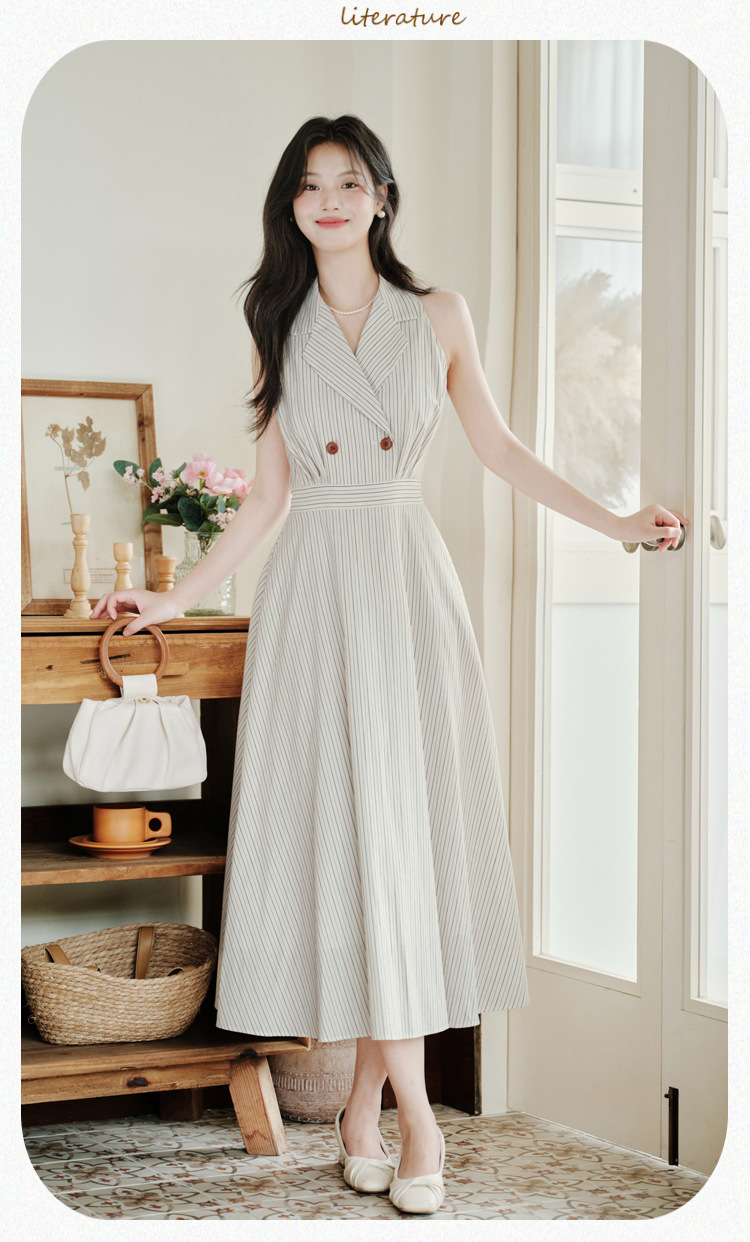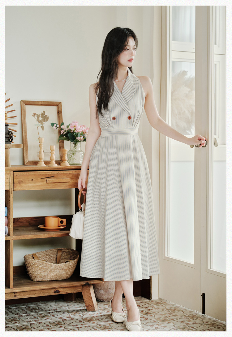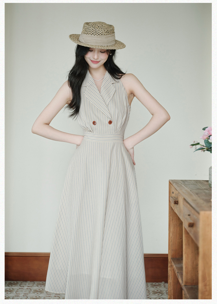 2025夏季新款气质优雅时尚条纹无袖西装领长款宽松显瘦收腰连衣裙