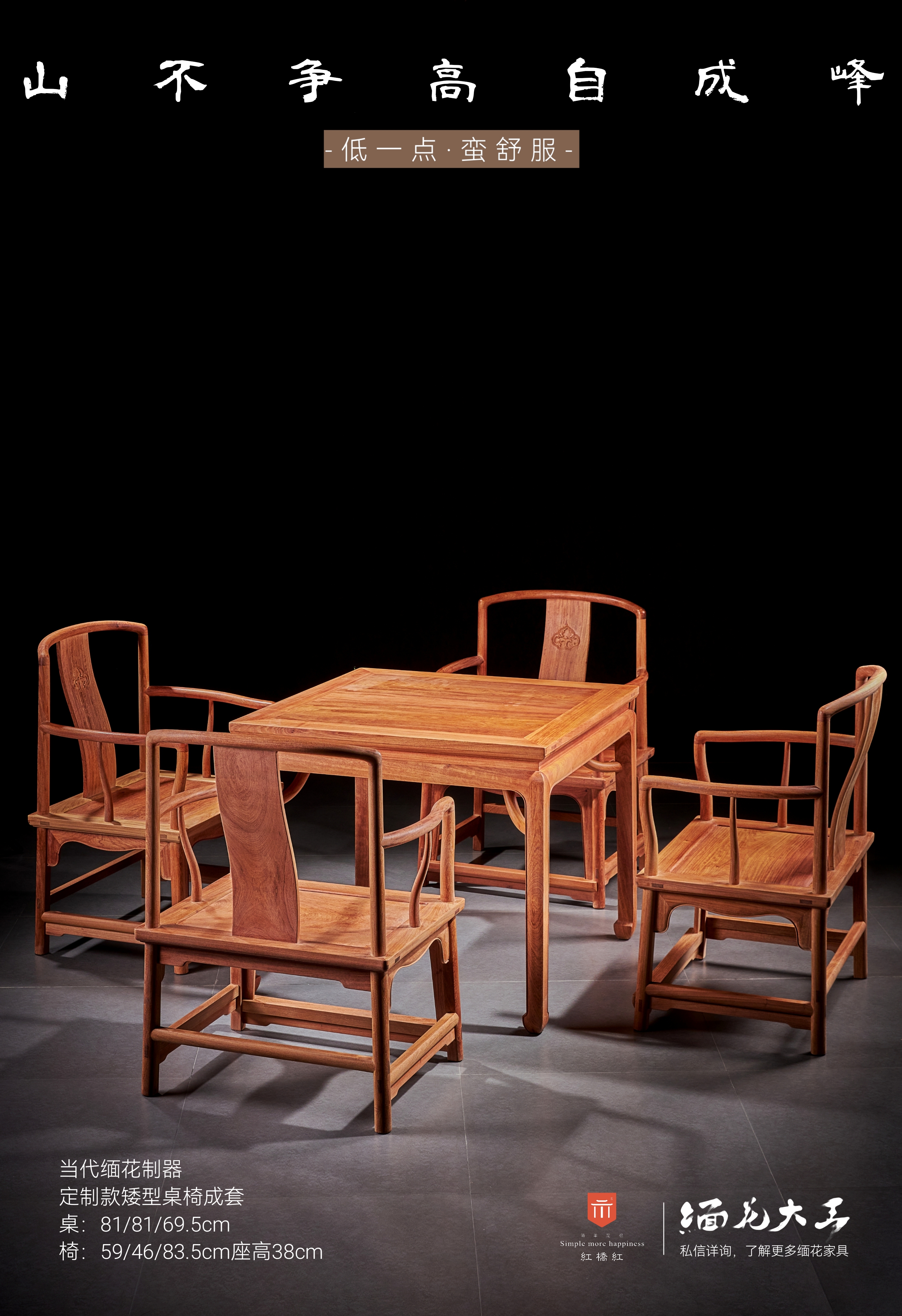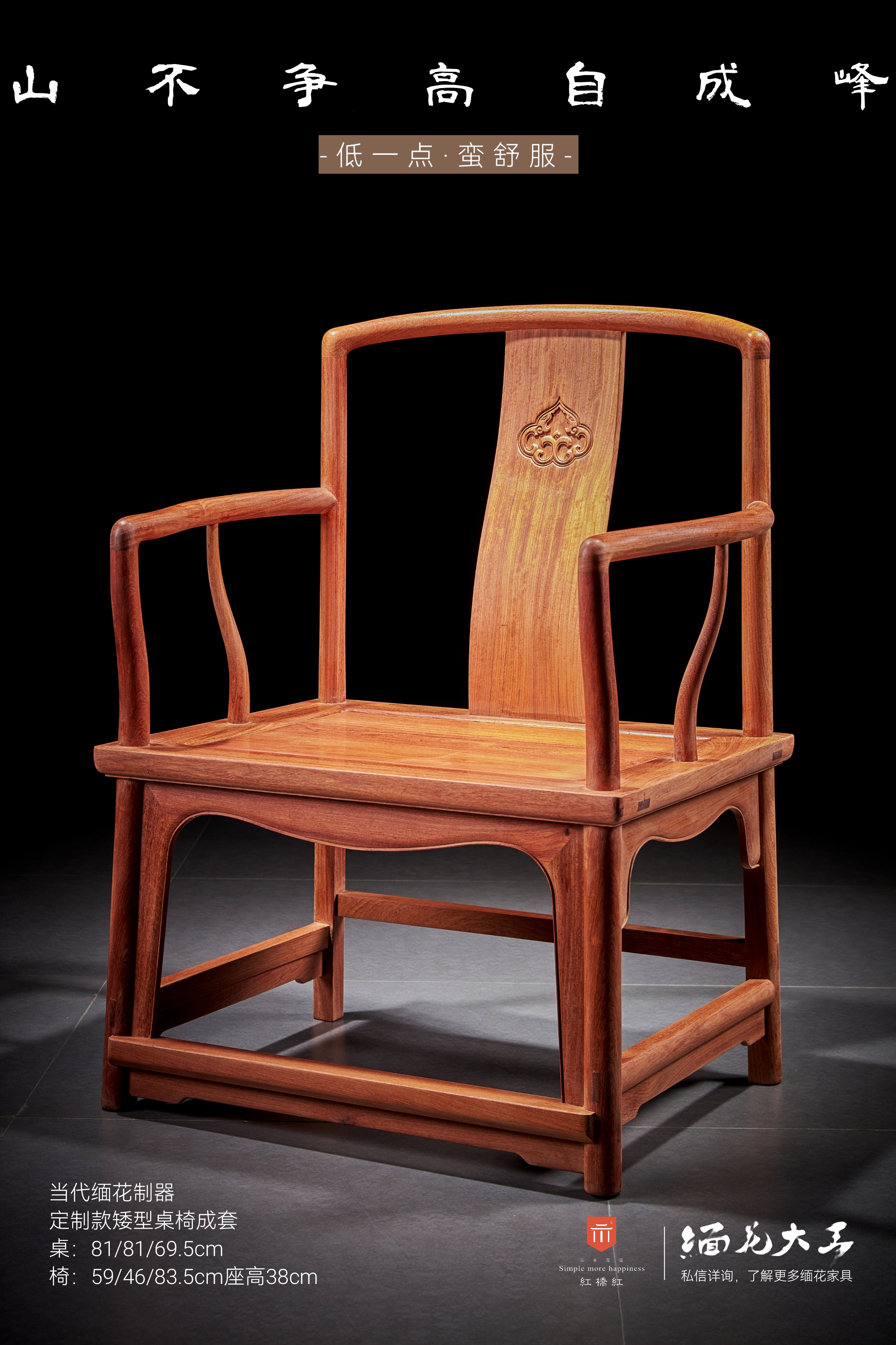 搭配南官帽椅,在追求高器型的前提下,制作比传统椅类家具高度低,与桌子高度比例适宜,也是符合当代人体工学,坐感舒舒适。椅子搭脑与扶手以“挖烟袋锅榫”和后腿上截与前腿上截鹅脖连接,三弯靠背板浮雕花纹一朵,椅盘下素牙子,采用微微下垂“洼堂肚”式,此椅可视为矮型南官帽椅基本式,扶手后部能达到与圈椅异曲同工的效果,令坐者不仅肘部有所倚托,腋下一段膀臂也得到支承。