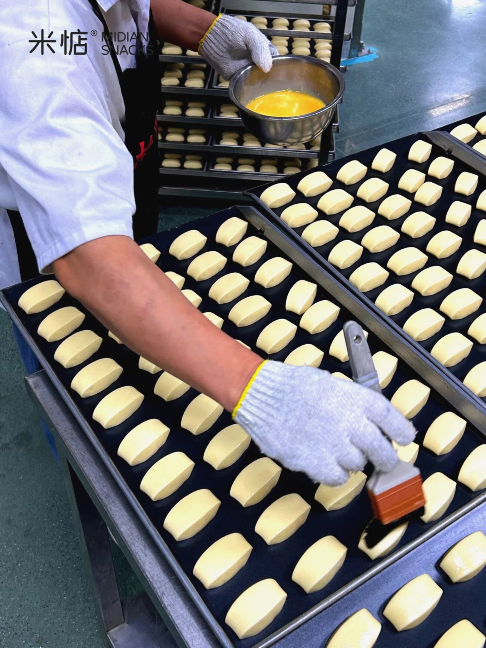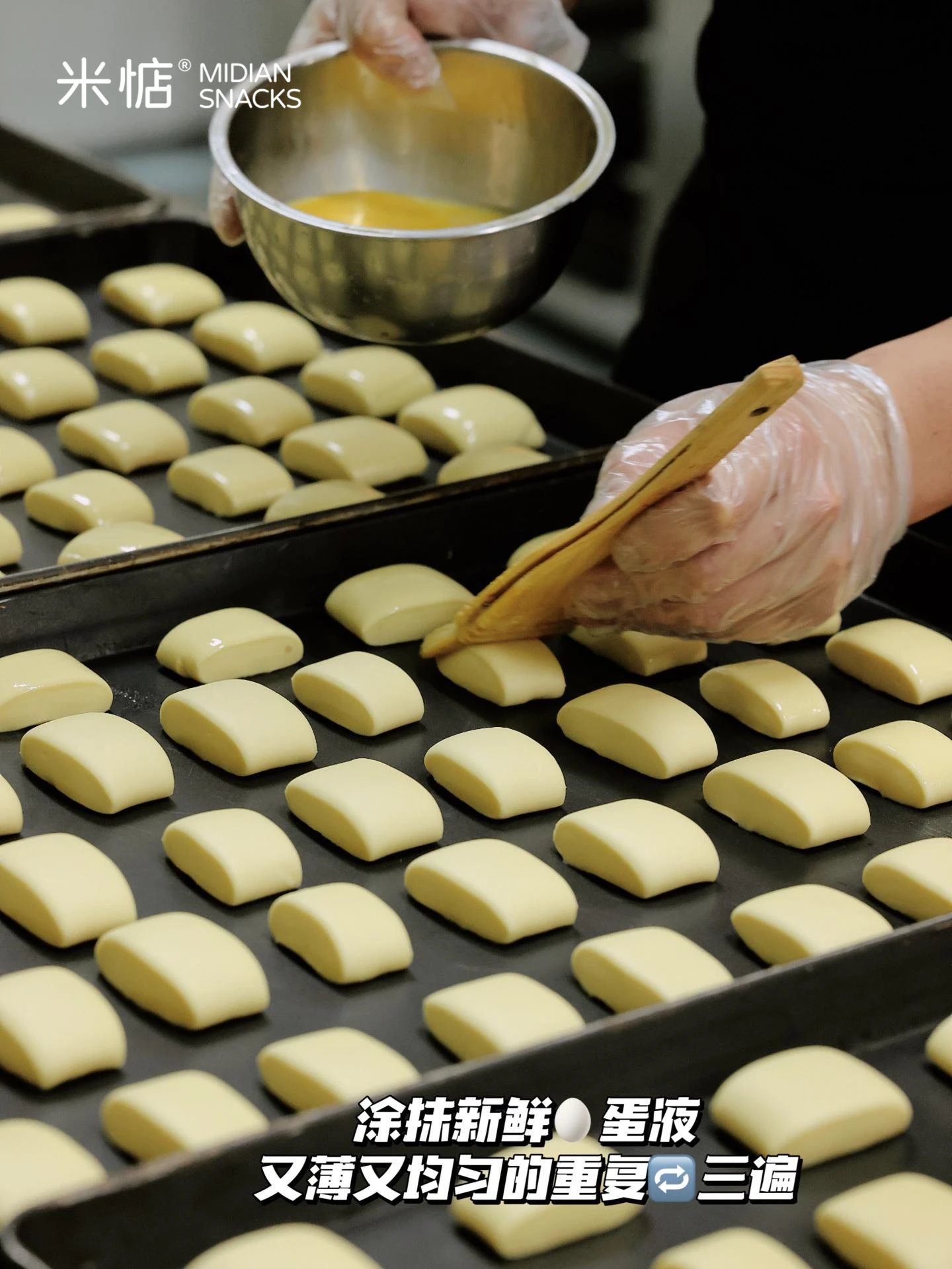 人工薄凃三遍蛋液才能达到的均匀 完成后进行12分钟的🏅黄金烘烤时长 如此才成就了厚实有嚼劲、回味无穷的口感