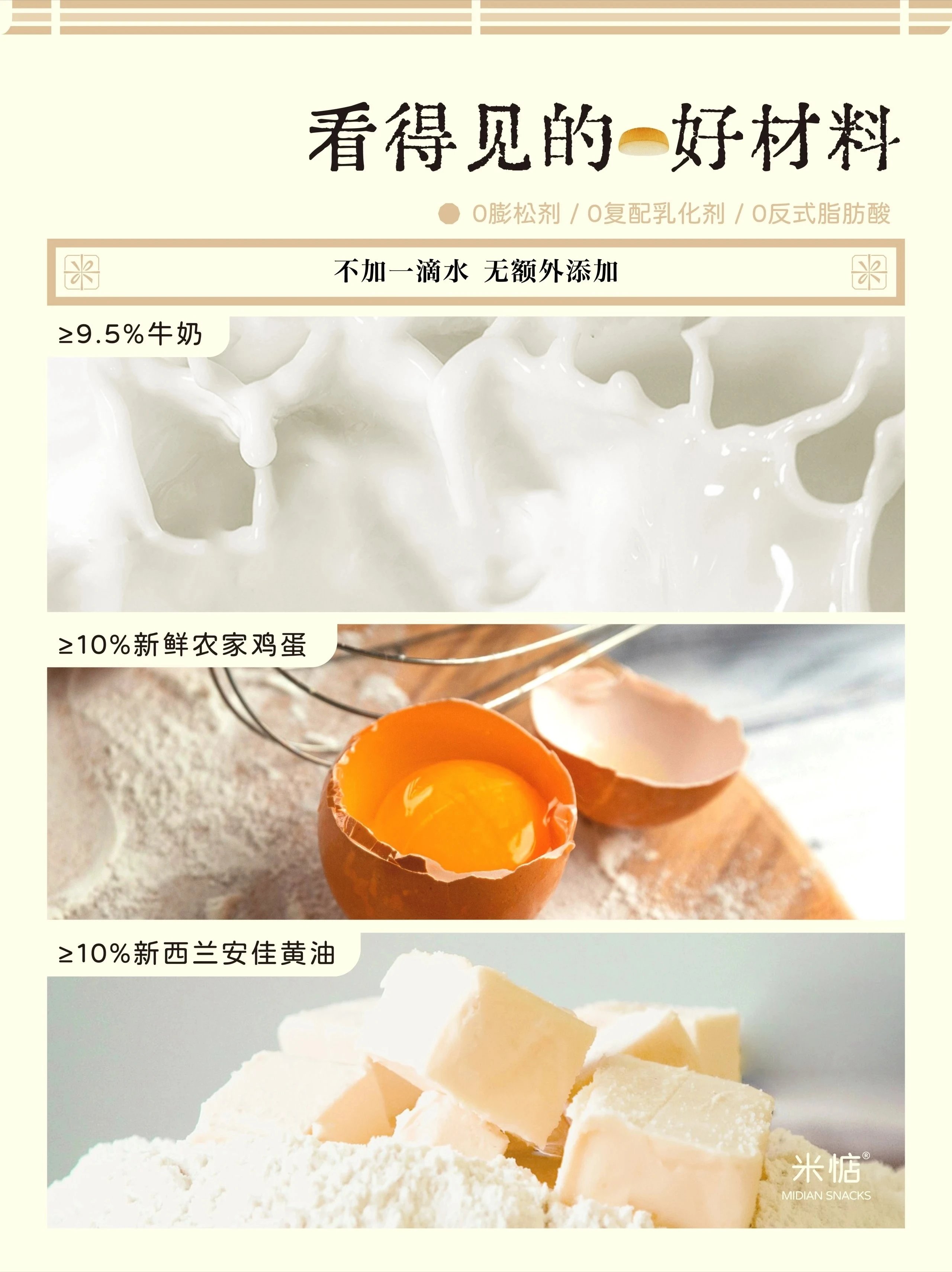 🟡看得见的干净配料 有的味道正因为简单,才耐人寻味 市面上在制作面包🥯糕点🥮的时候 通常会用膨松剂来提升柔软的口感 但是我们米惦并不随波逐流🐟 在选料上,深入👦👧童年记忆 不断探索并呈现出最本真的味道 ❌无添加膨松剂和复配乳化剂 依靠好食材本身给产品带来的绵密口感 21天的短保质期,新鲜的才是好味道✅ 0香精色素防腐剂,“三无添加”才更安心