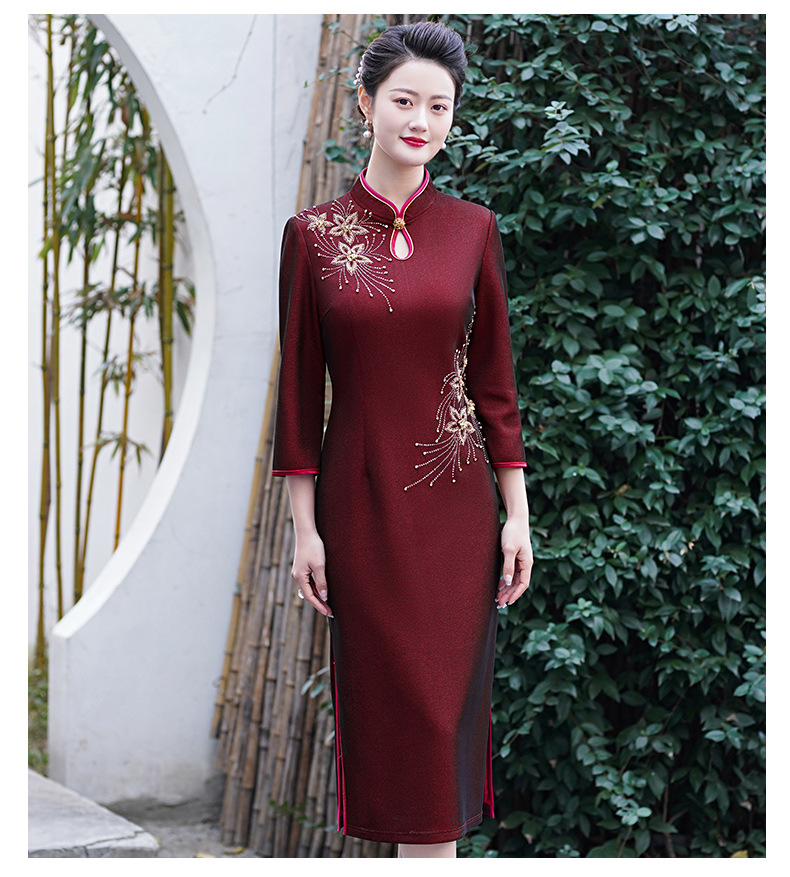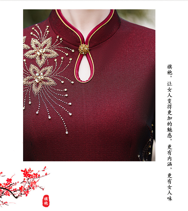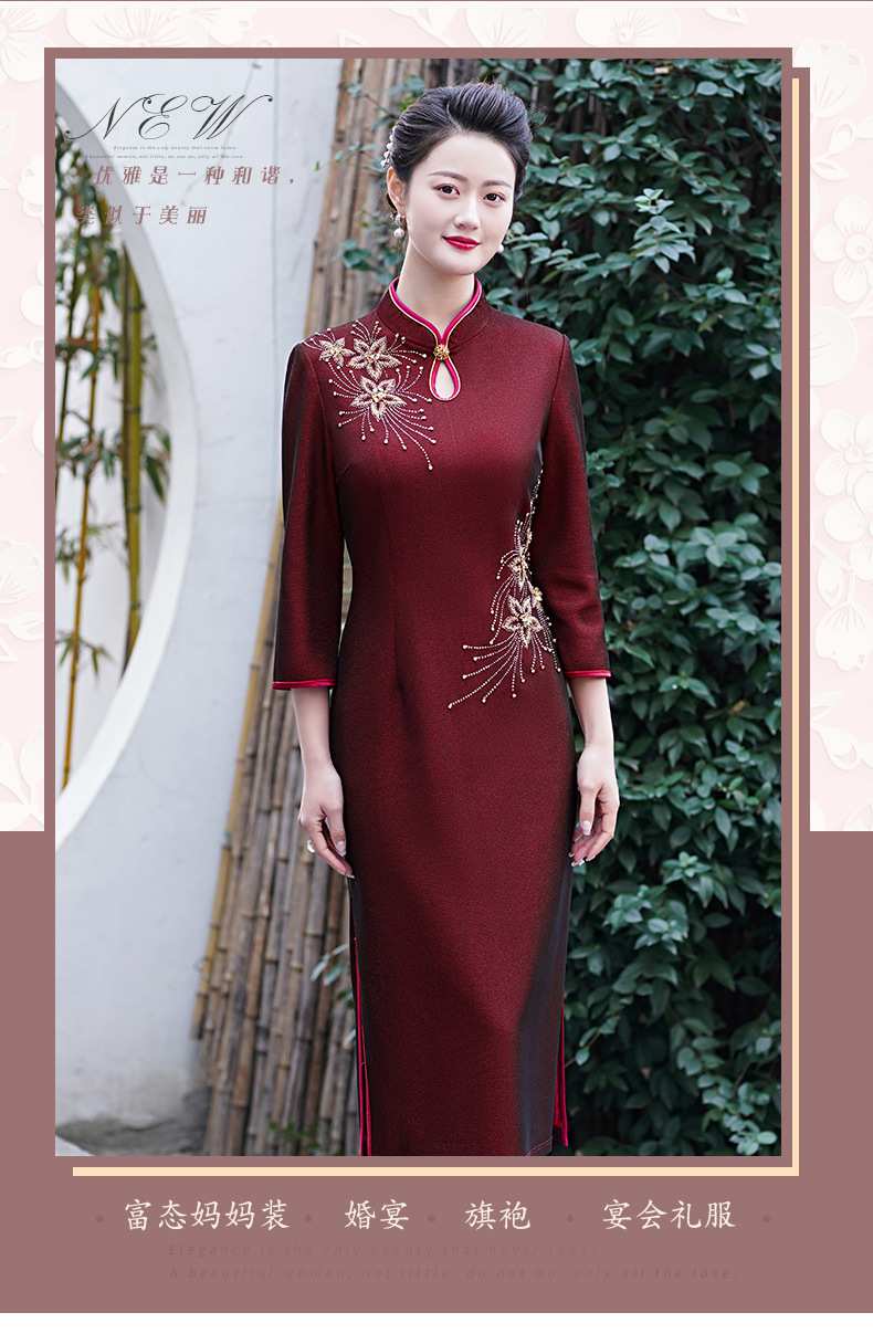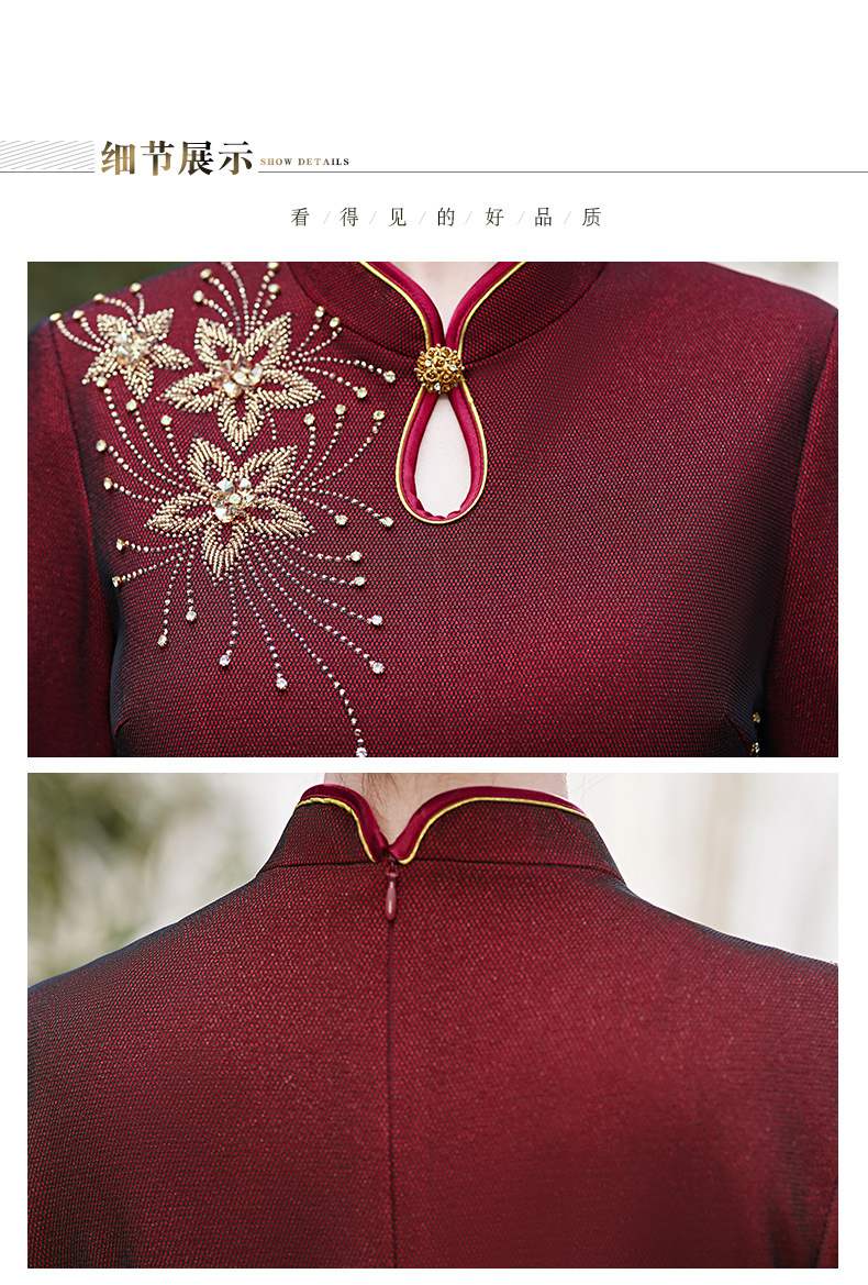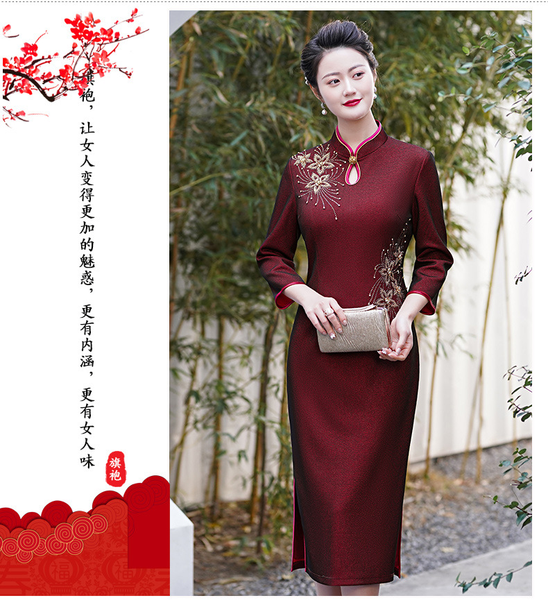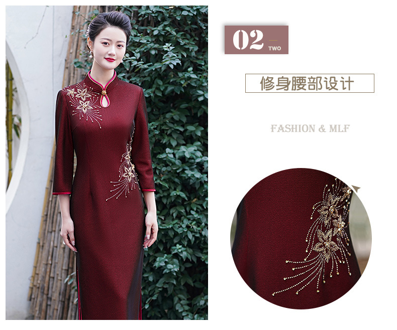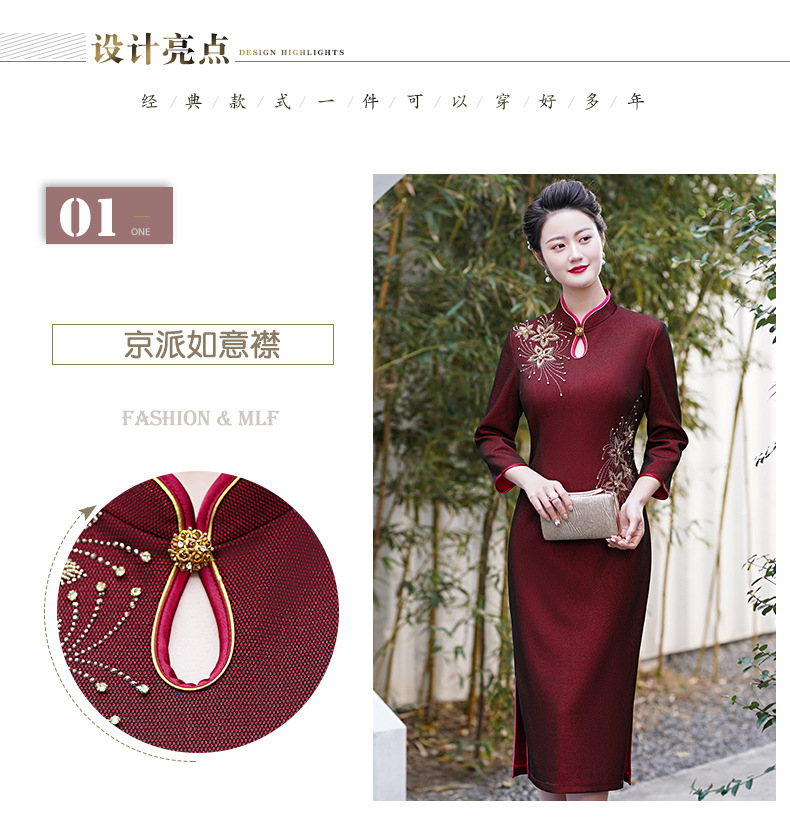 MLY秋冬新款旗袍复合料中长款钉珠旗袍立领宴会礼服
