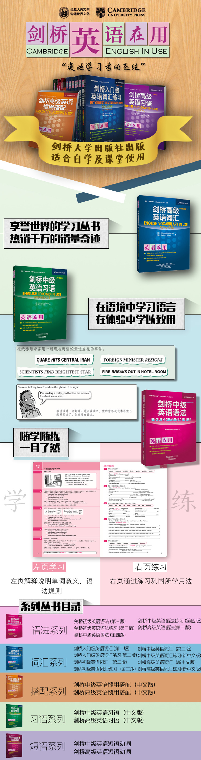《剑桥初级英语语法练习(第三版中文版)》是《剑桥初级英语语法(第三版中文版))的配套练习册,全书共括185道练习题,专为需要加强语法练习的初级英语水平的学生设计,也适用于中级初阶的学生。本书习题形式括对话、电子邮件、短文等,除测试语法知识外,还有很强的趣味性。做习题的过程中,既可巩固语法知识,又可学习口语和写作。