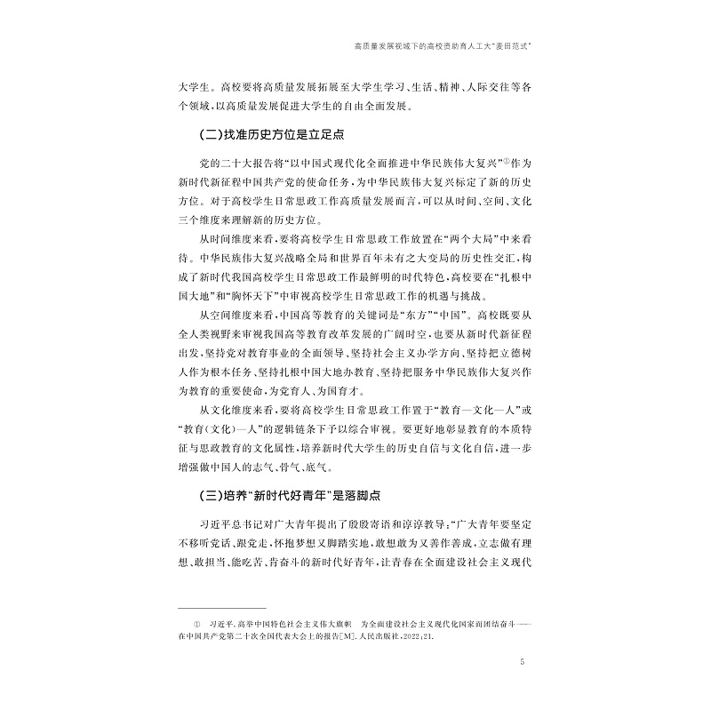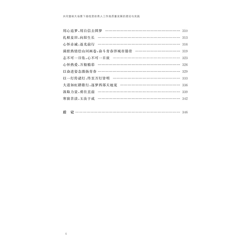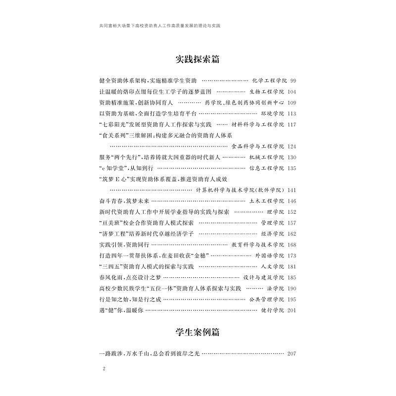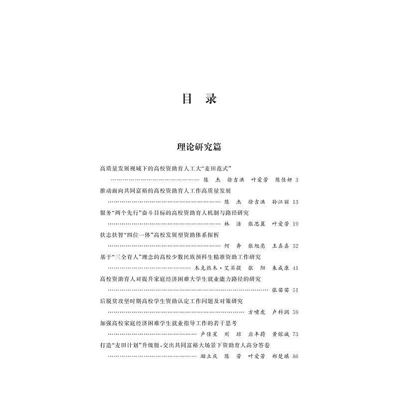 本书依托教yu部高校思想政治工作精品项目“基于共同富裕示范区建设要求的大学生‘麦田计划’资助育人工程项目”和浙江省高校重大人文社科攻关计划规划重点项目“共同富裕大场景下高校资助育人工作高质量发展研究”两个省部级课题项目,以浙江省高质量发展建设共同富裕示范区为时代背景,聚焦共同富裕大场景下高校资助育人工作高质量发展,展示浙江省高校在建设共同富裕示范区伟大实践中的使命、责任与担当,为全国高校资助育人工作高质量发展积累浙江经验、贡献浙江智慧、提供浙江方案。