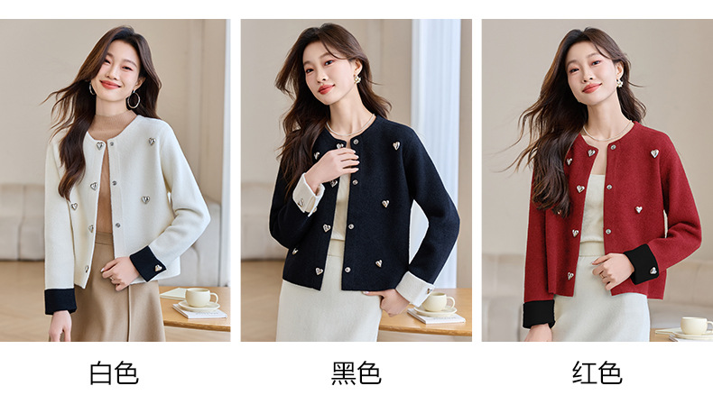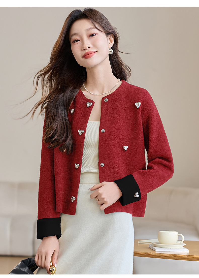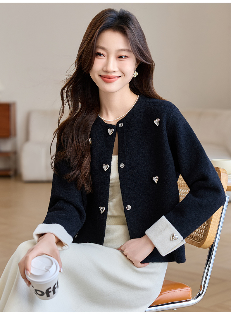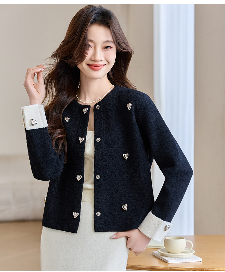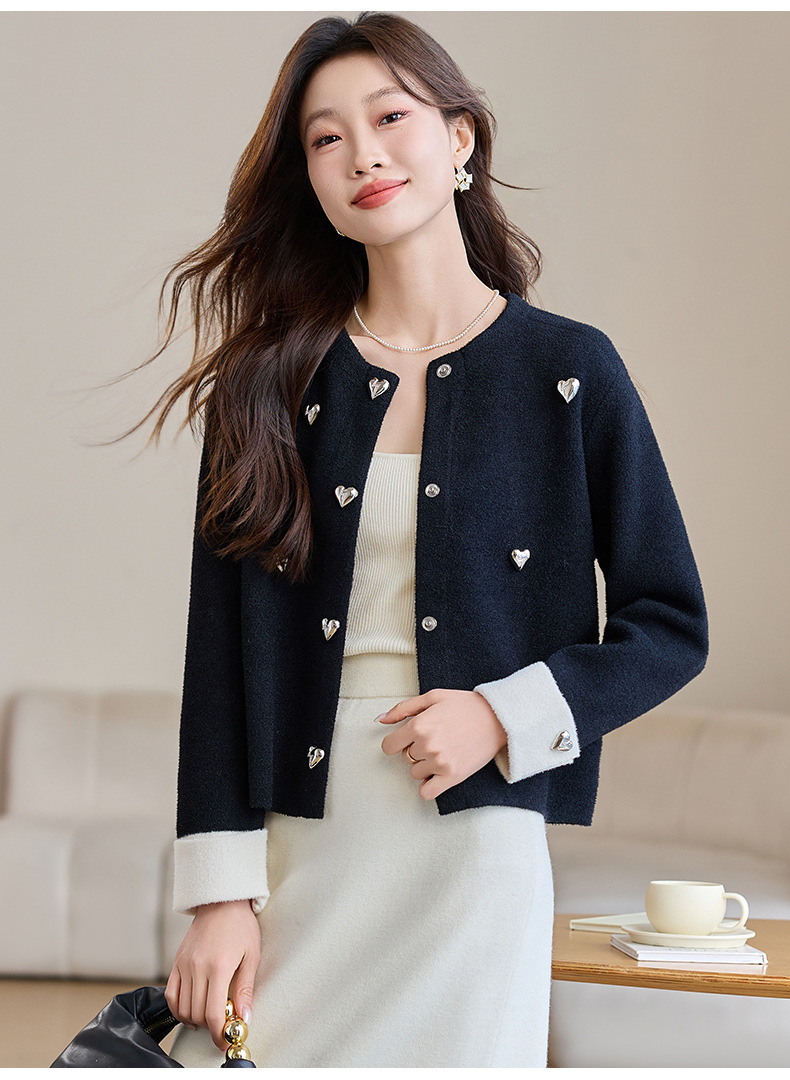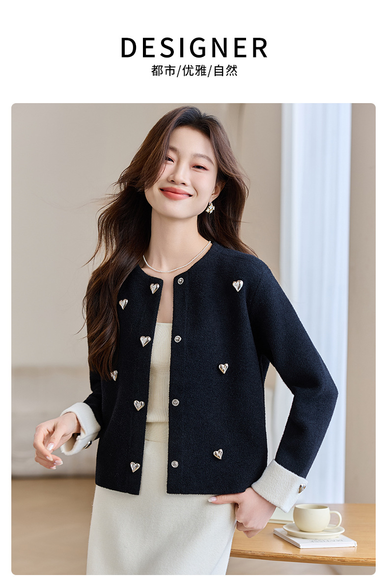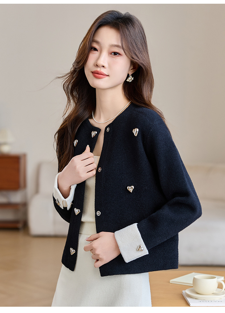 CC-XFY-2500春季新款2025小众设计感拼色气质爱心装饰针织开衫短外套女小香风
