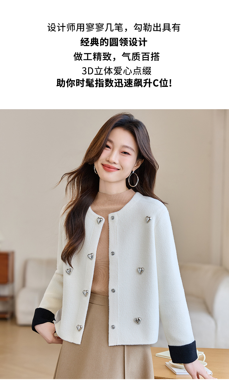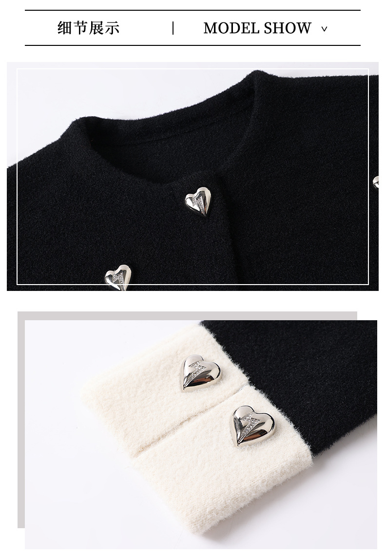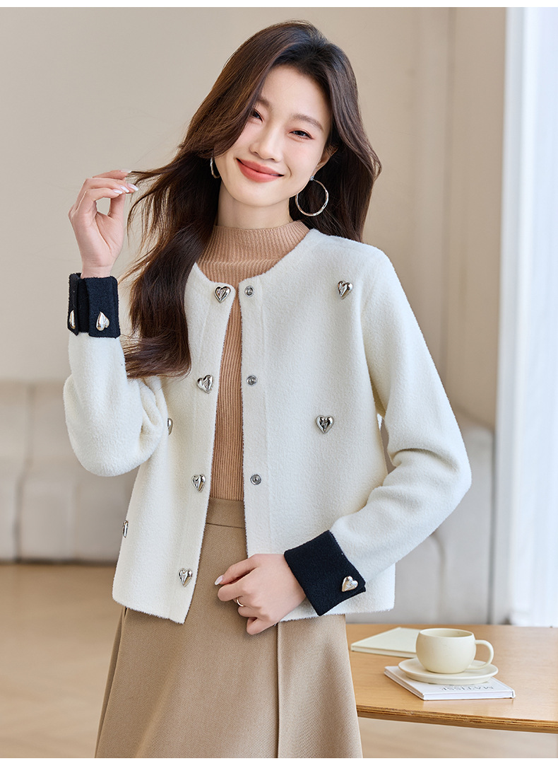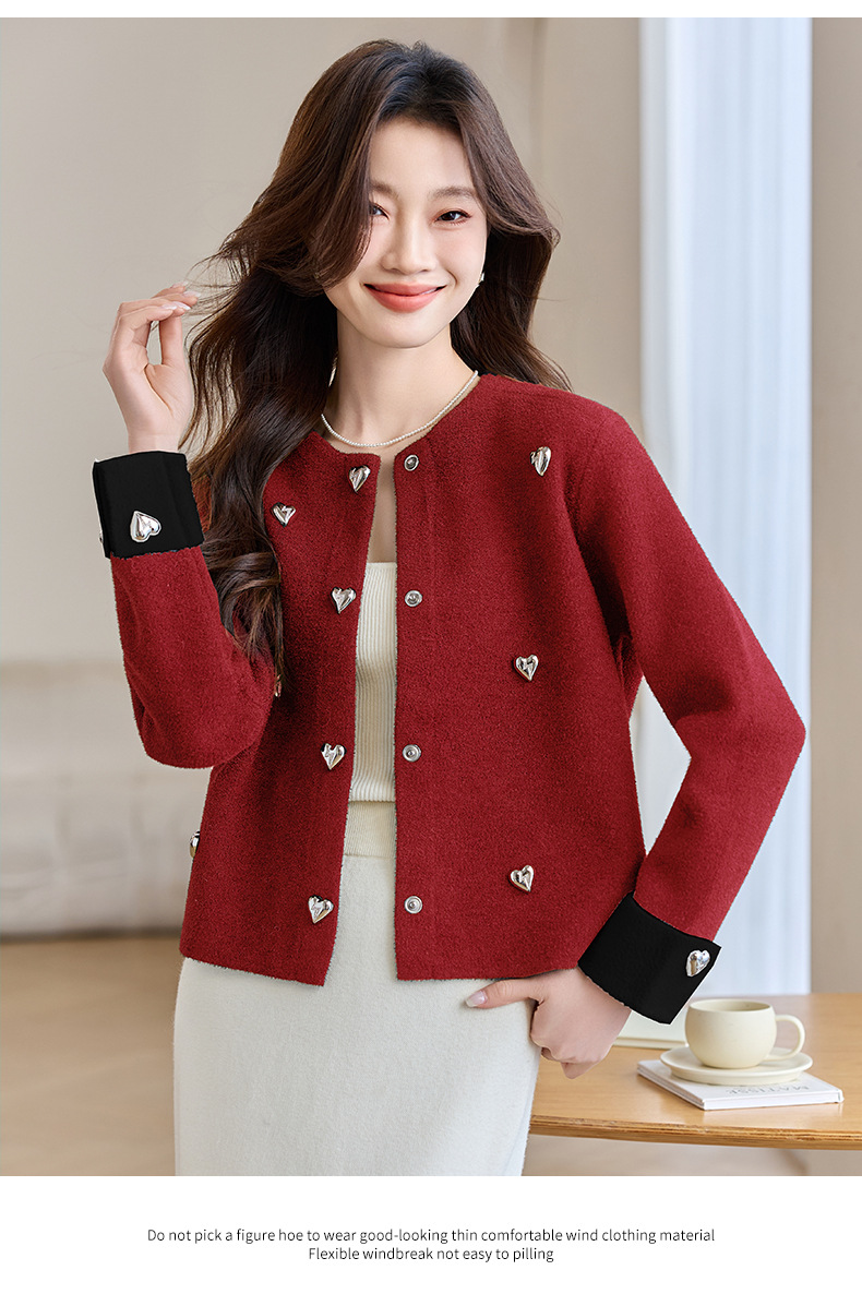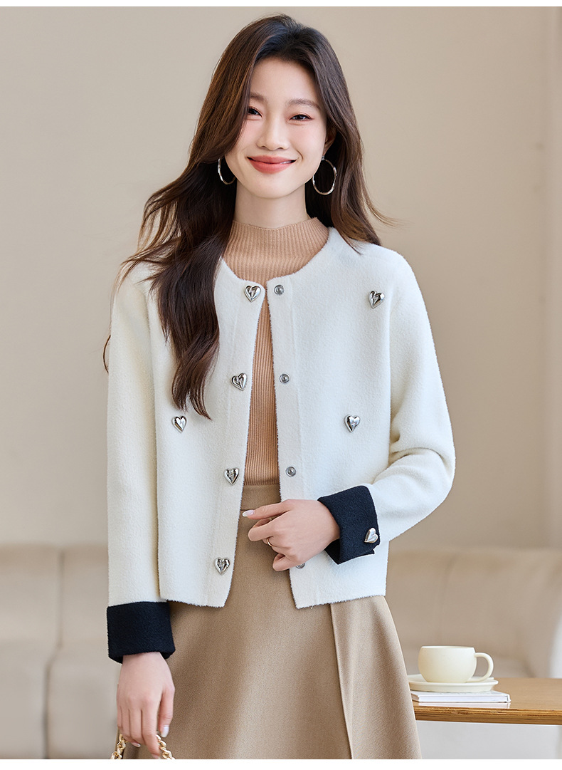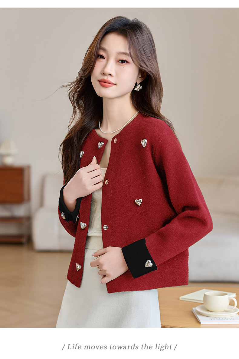 CC-XFY-2500春季新款2025小众设计感拼色气质爱心装饰针织开衫短外套女小香风
