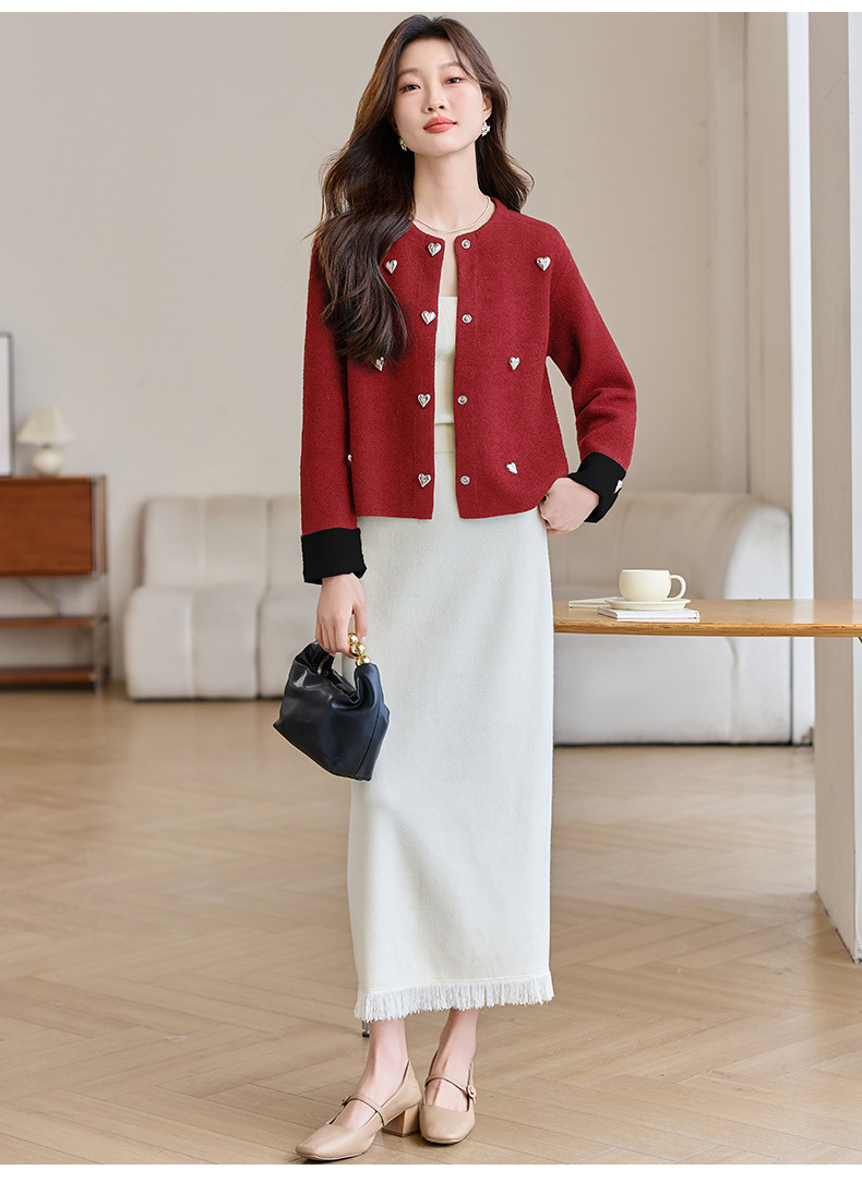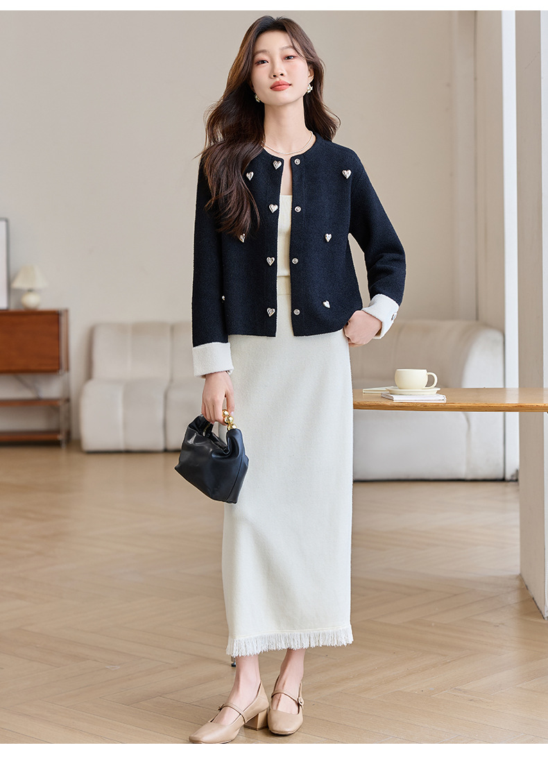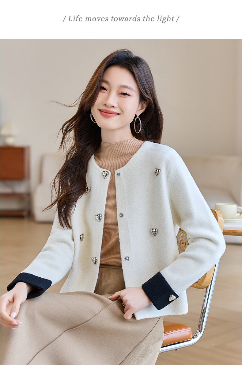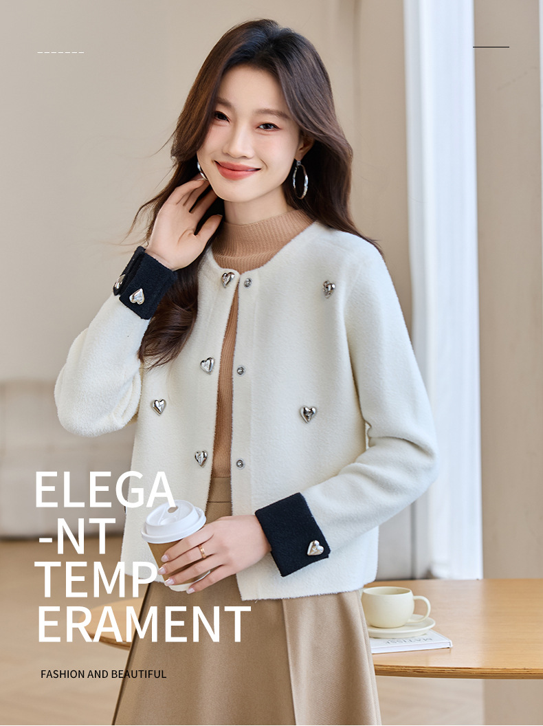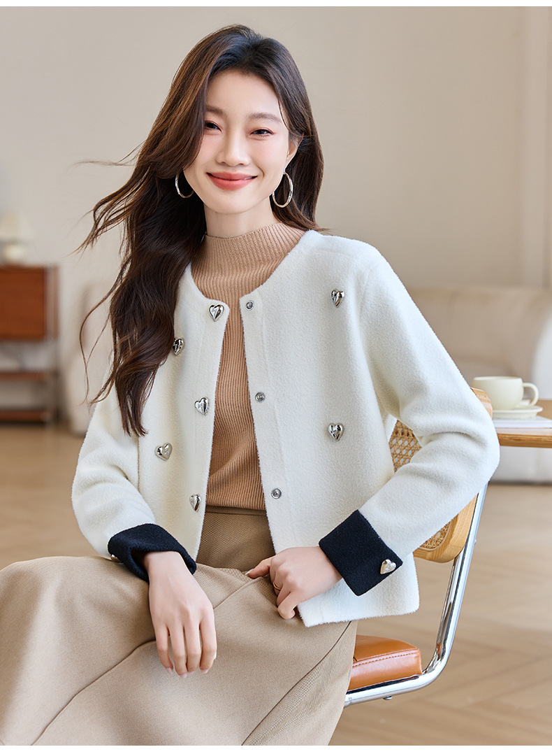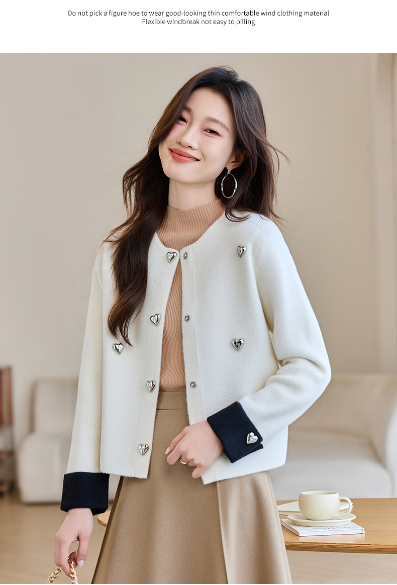 CC-XFY-2500春季新款2025小众设计感拼色气质爱心装饰针织开衫短外套女小香风