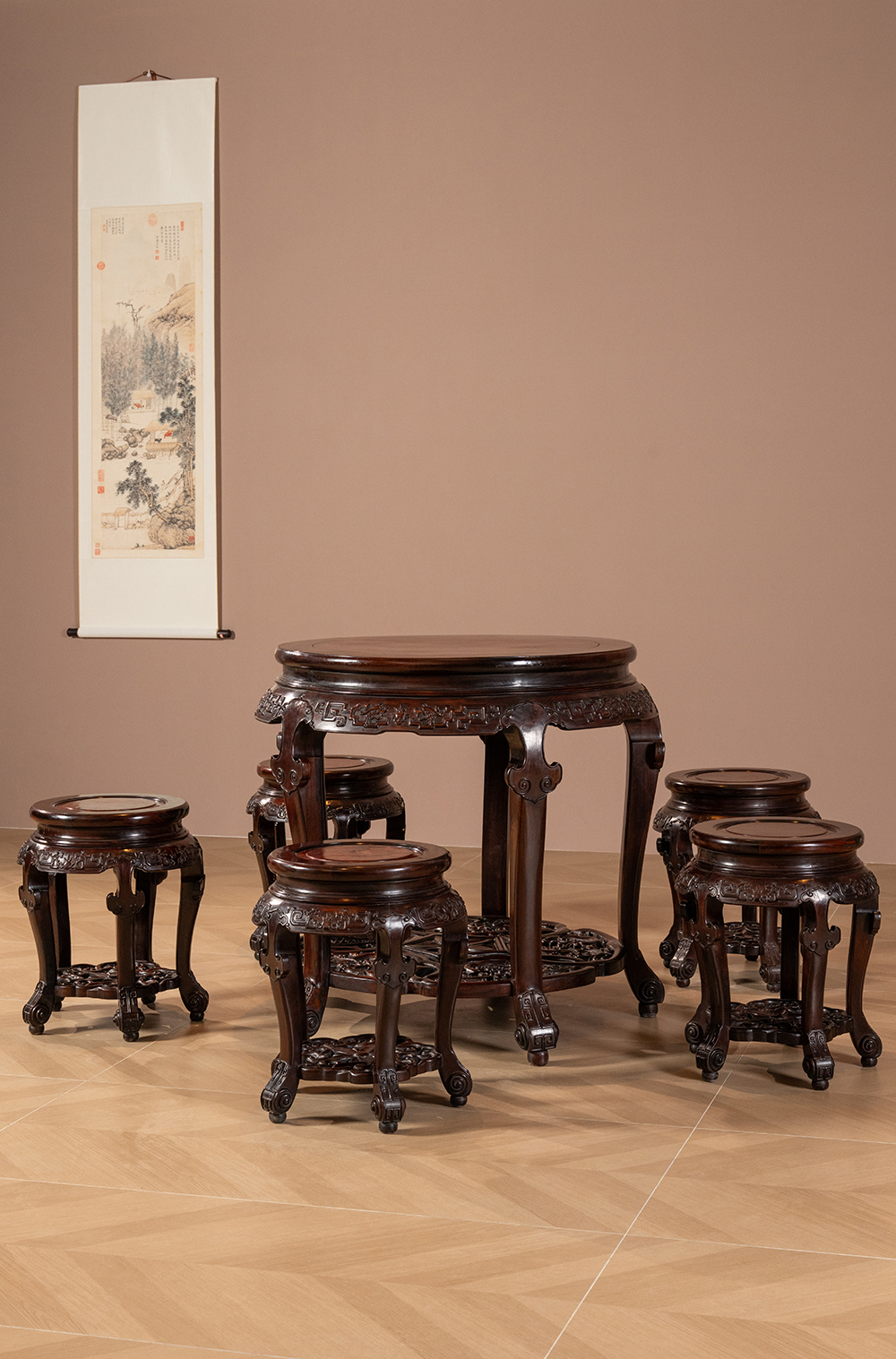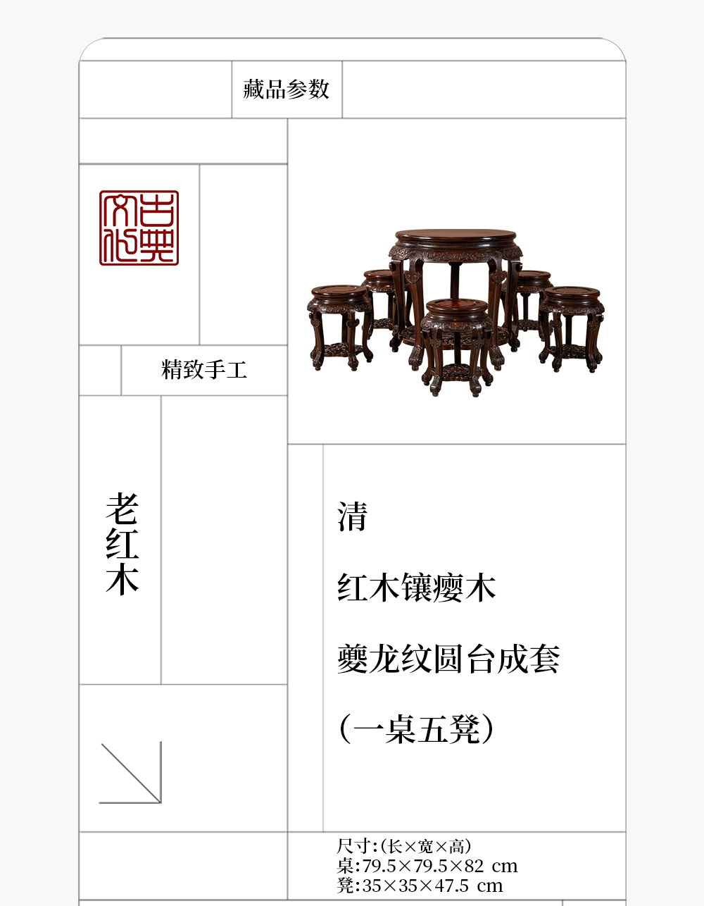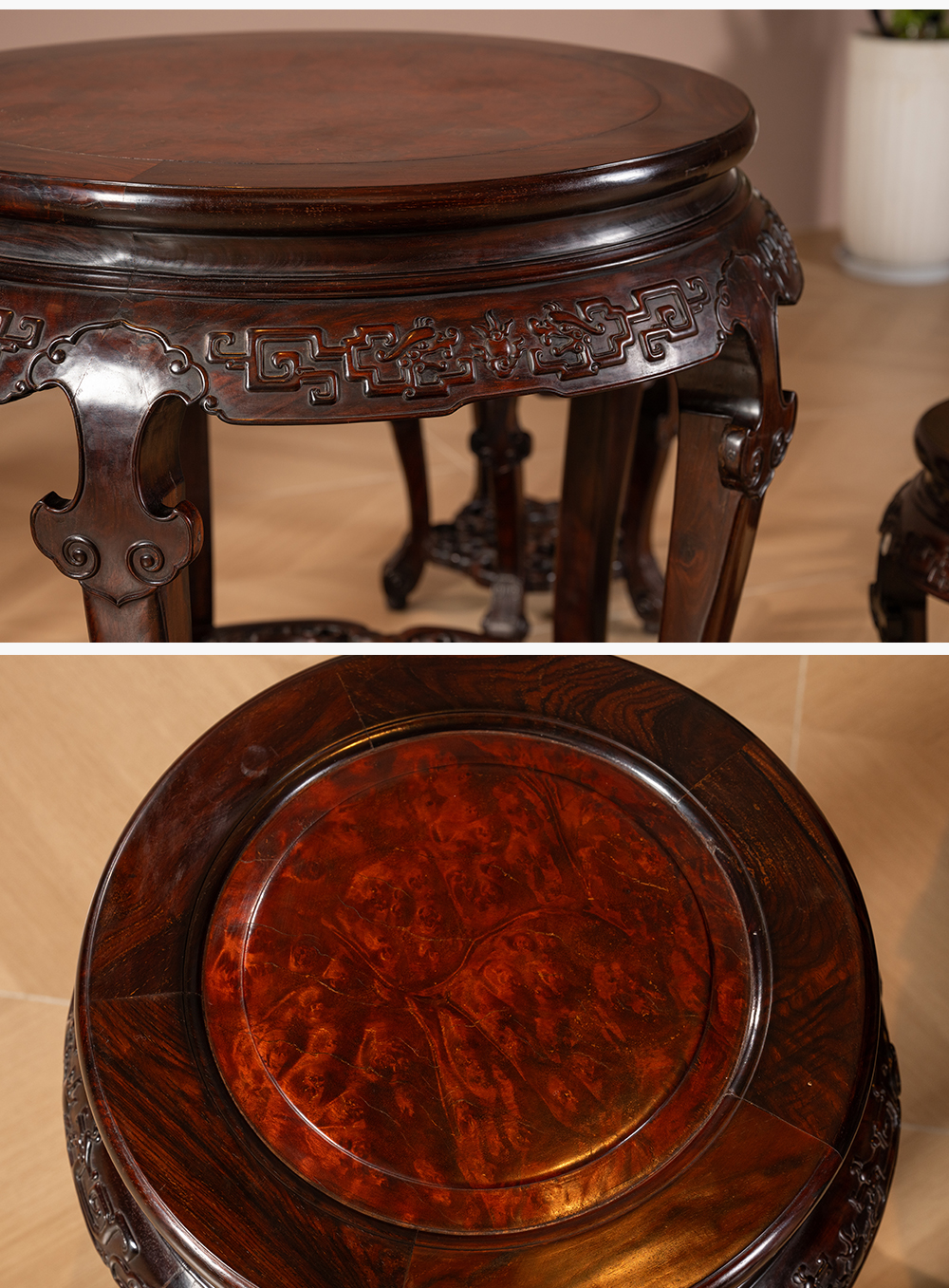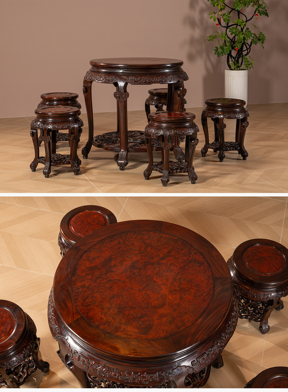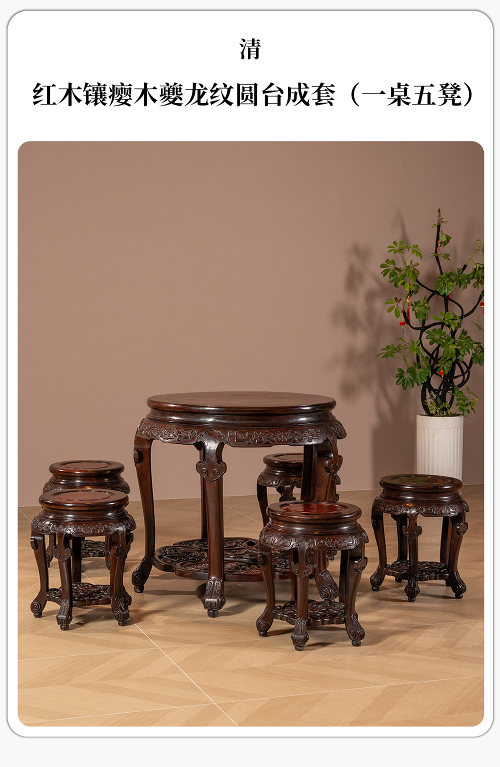 清 红木镶瘿木夔龙纹圆台成套(一桌五凳)