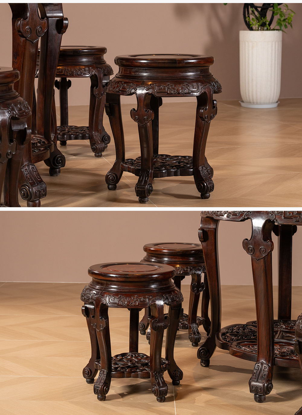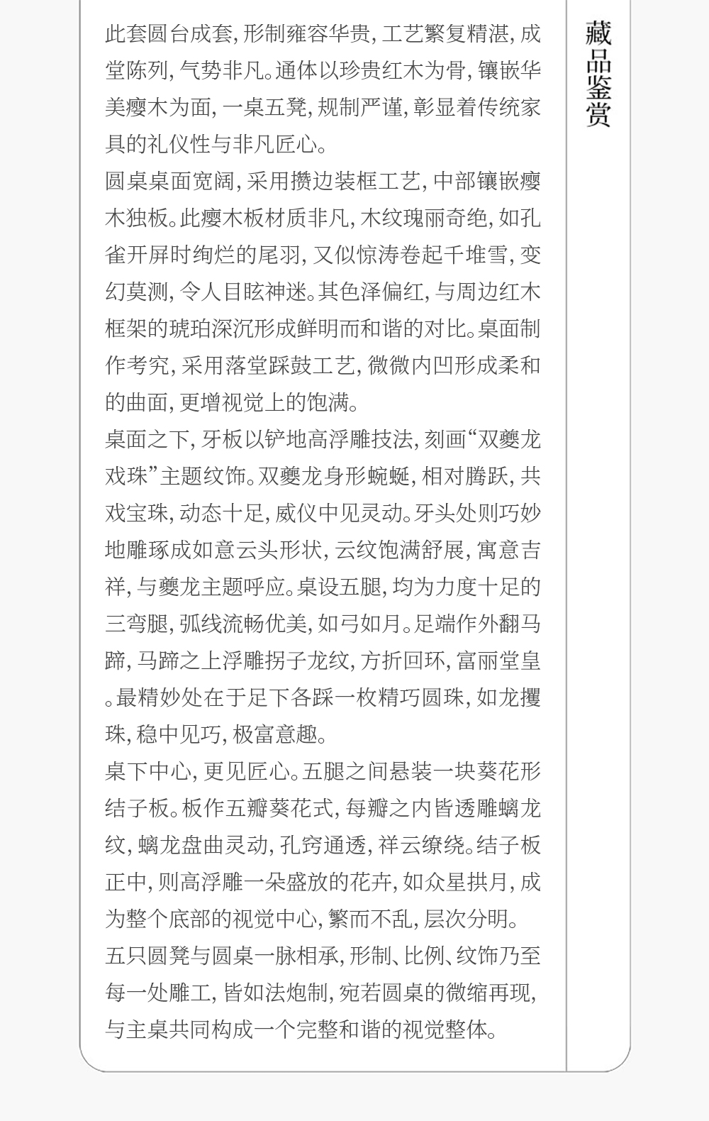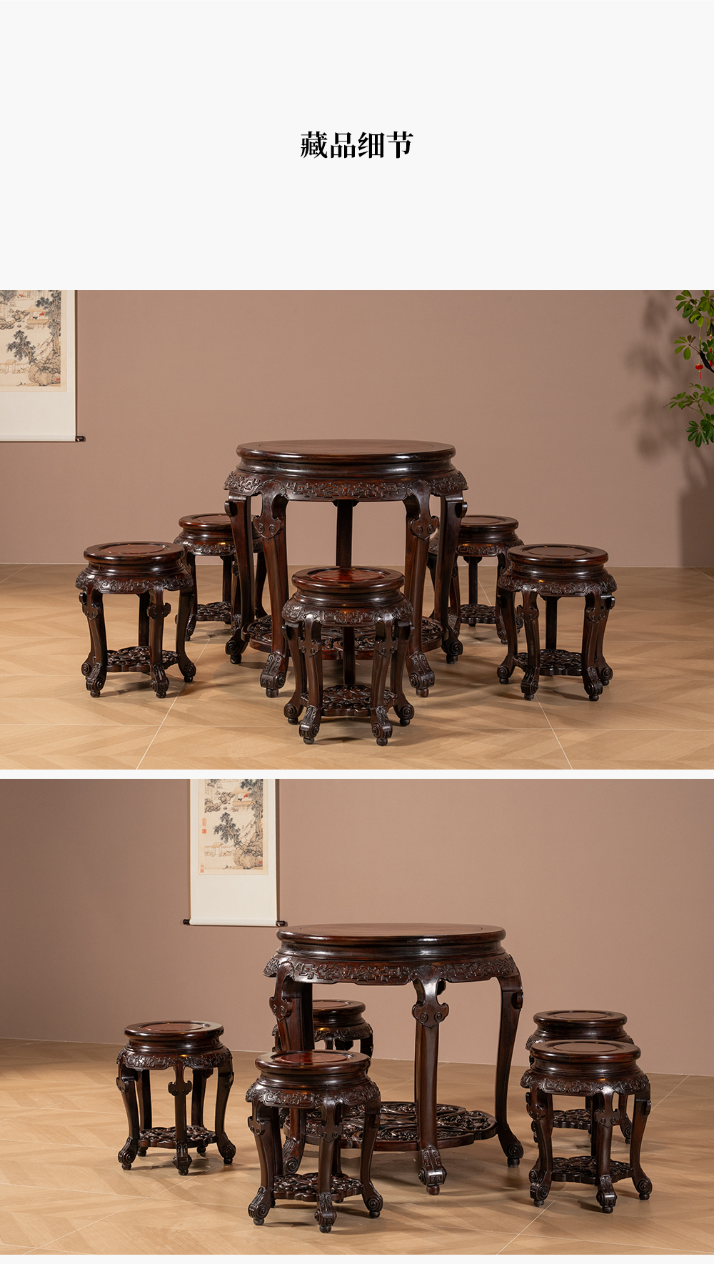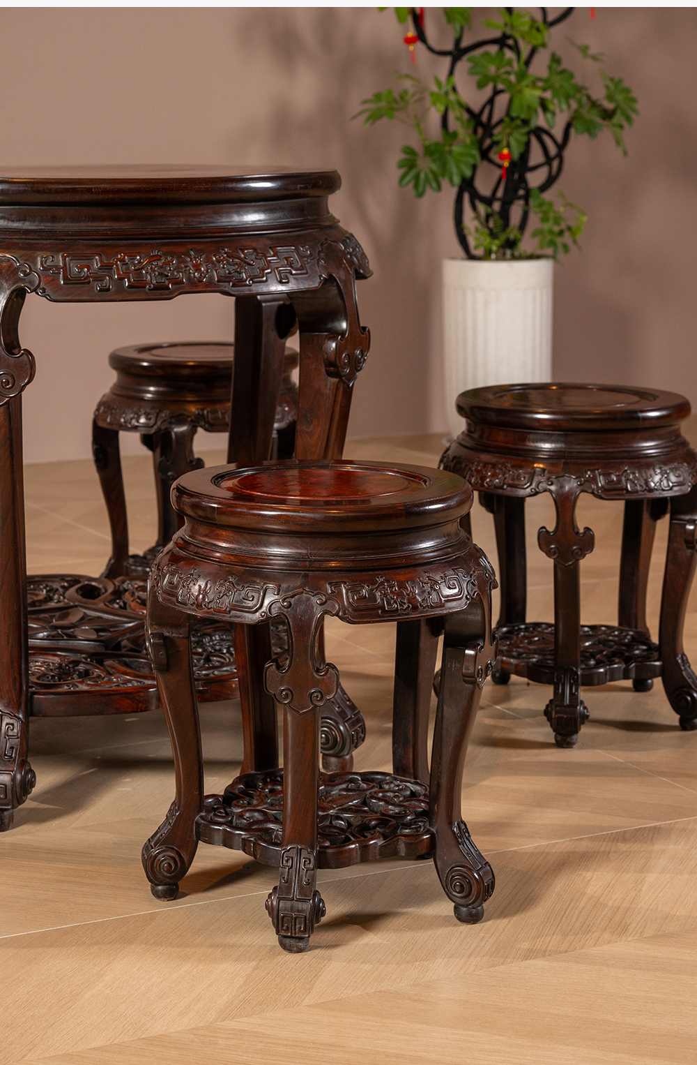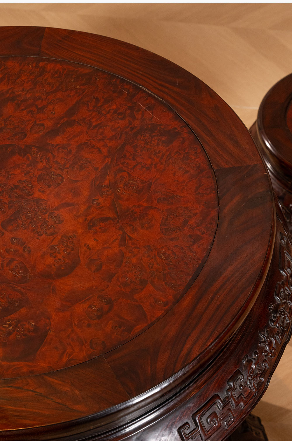 清 红木镶瘿木夔龙纹圆台成套(一桌五凳)