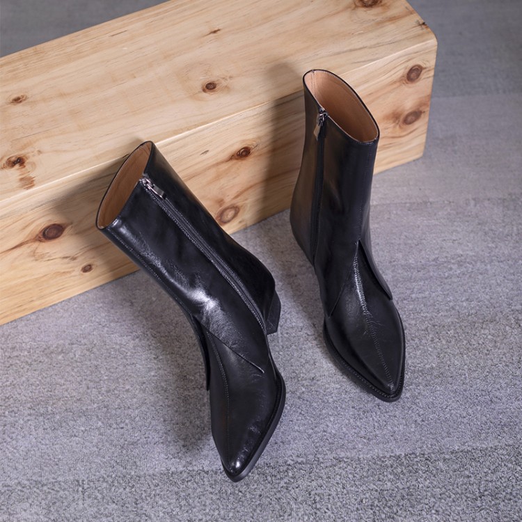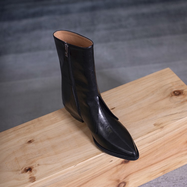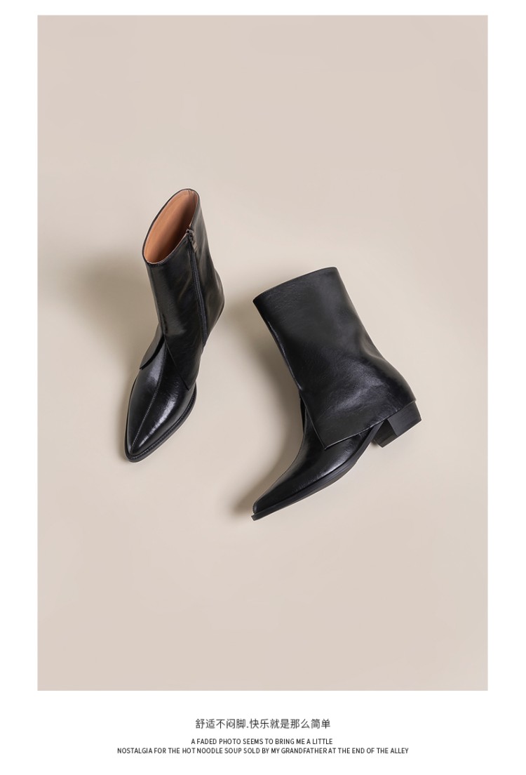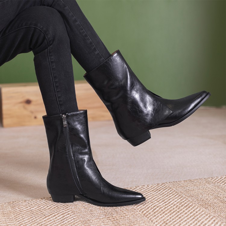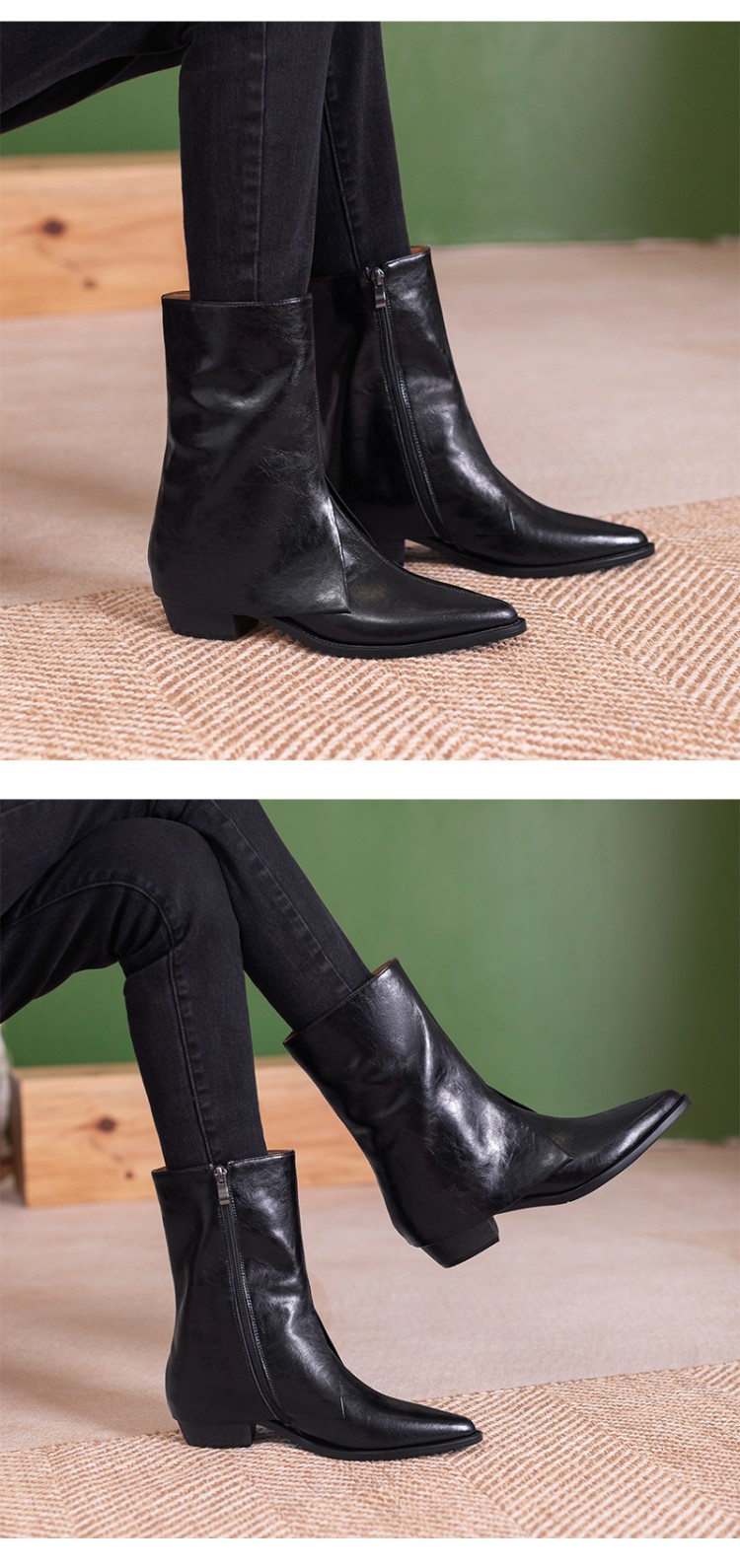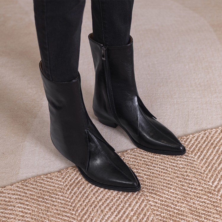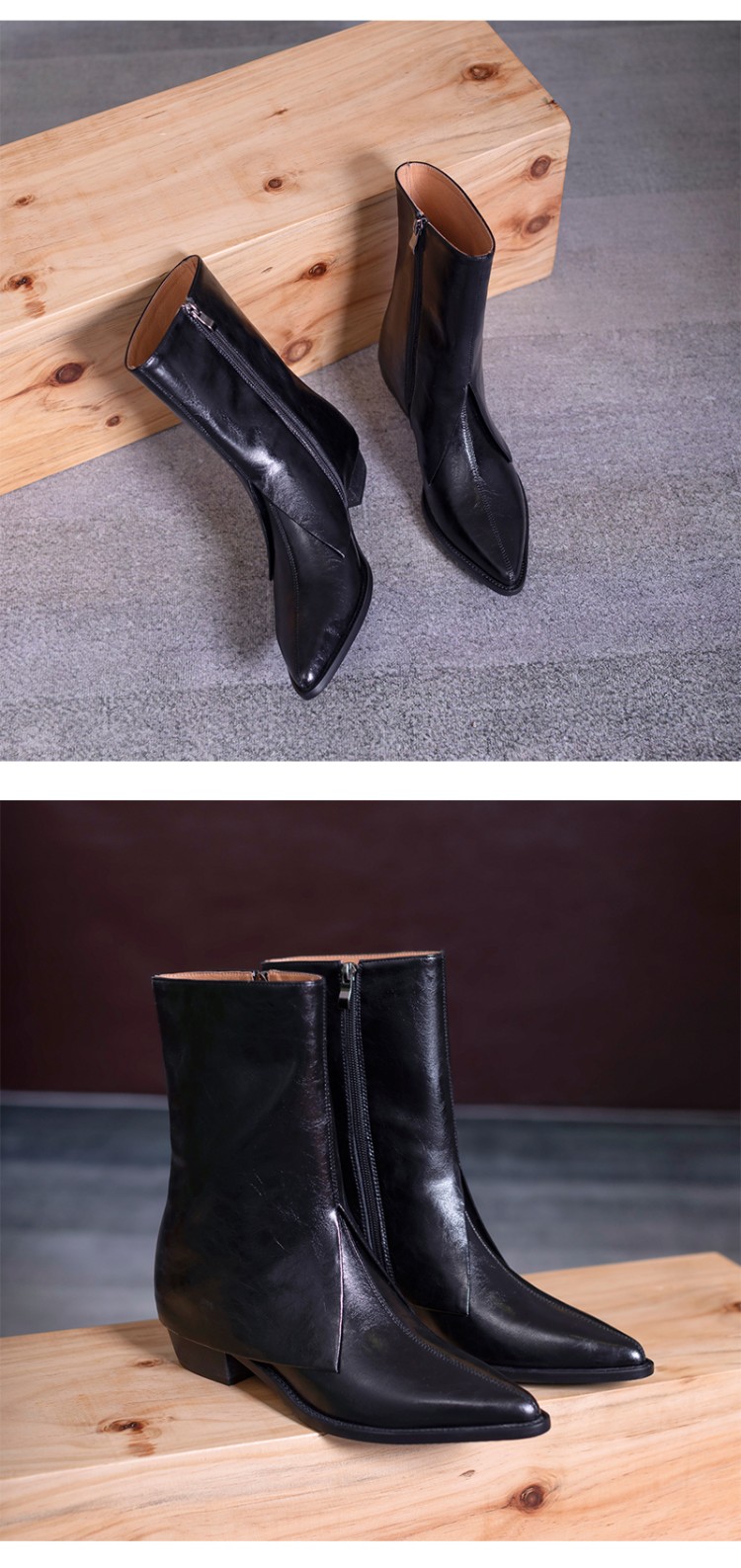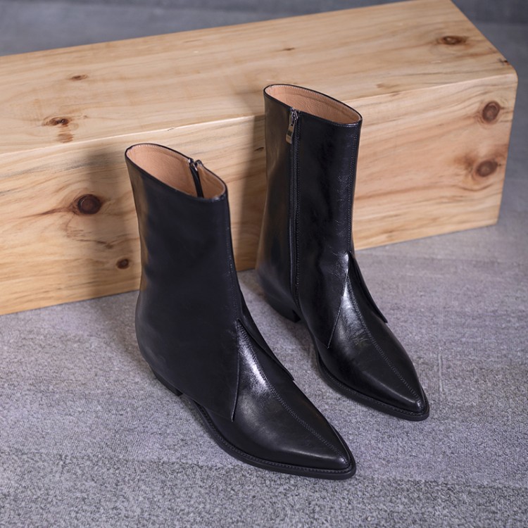【预售5天】裤管靴女秋冬款欧美中跟短靴黑色尖头短筒靴子牛皮粗跟马丁靴168XY&A16860