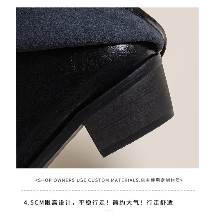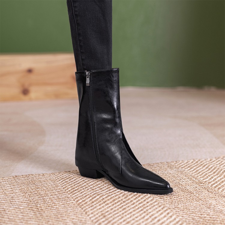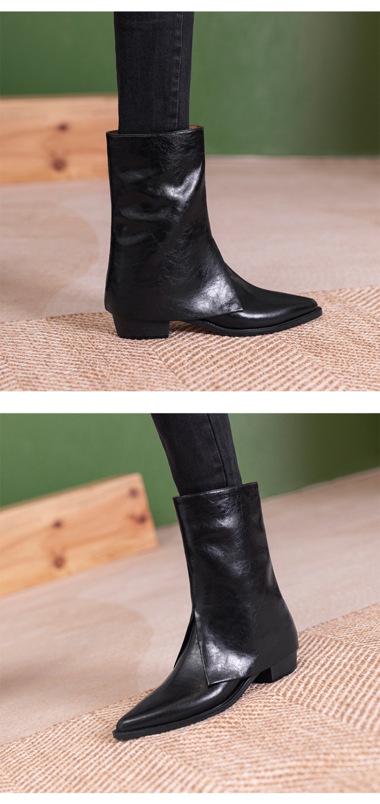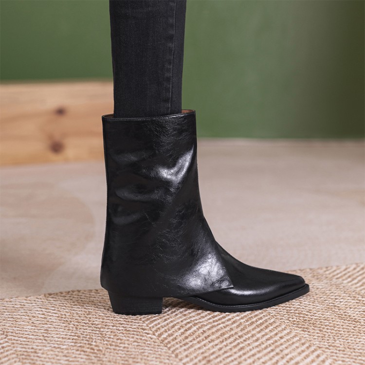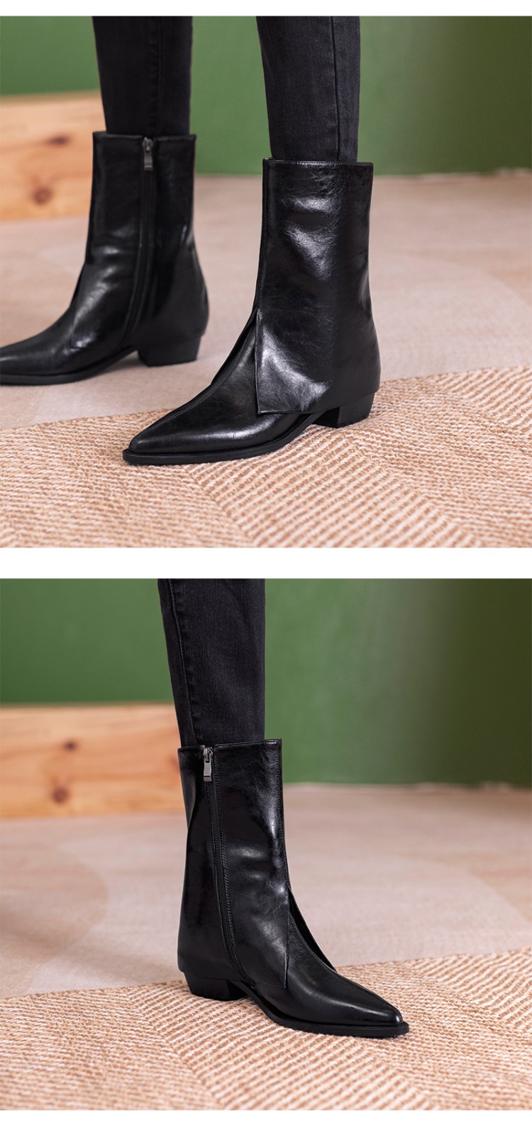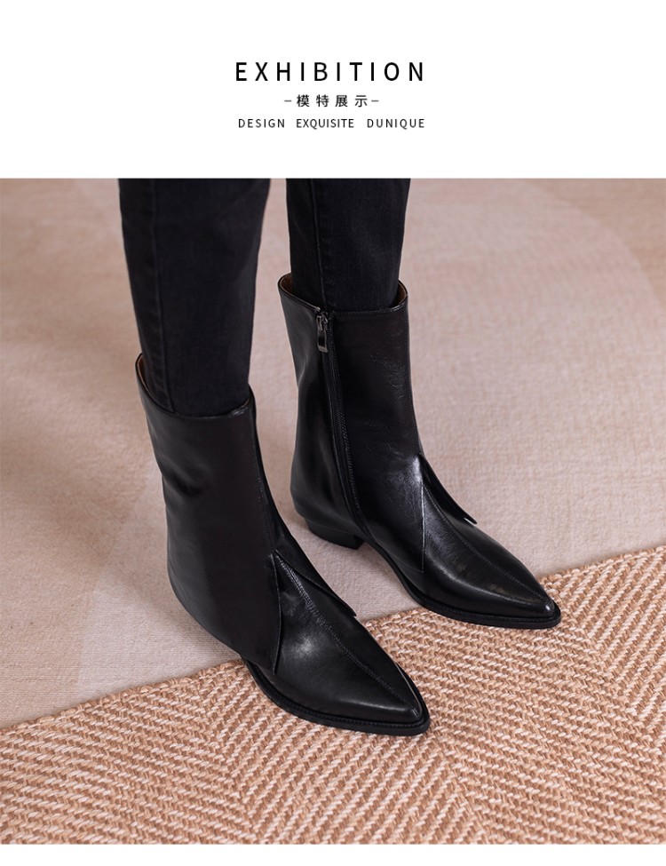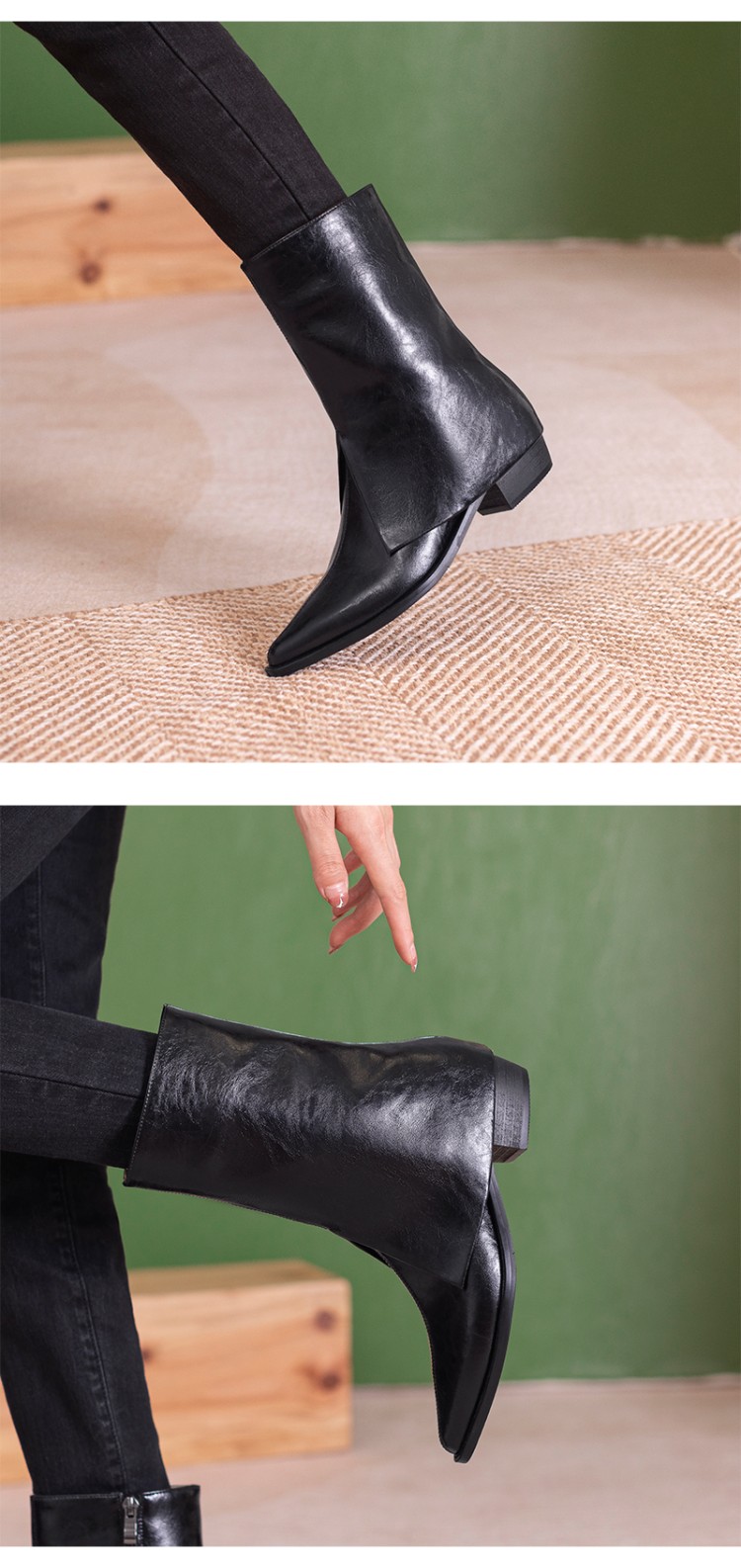 【预售5天】裤管靴女秋冬款欧美中跟短靴黑色尖头短筒靴子牛皮粗跟马丁靴168XY&A16860