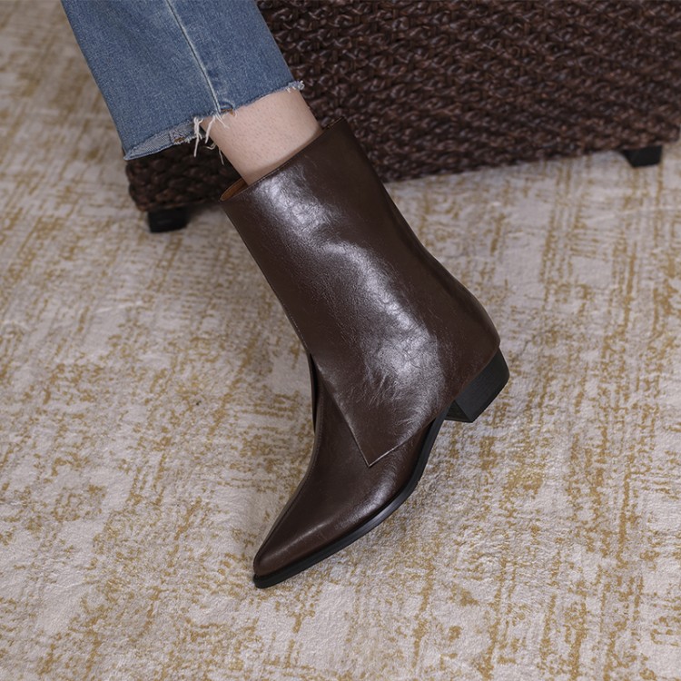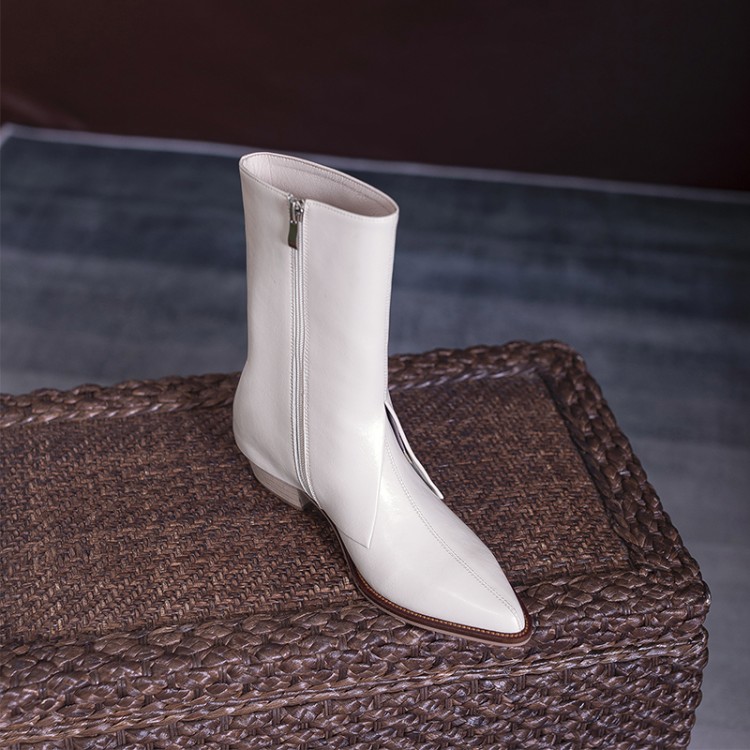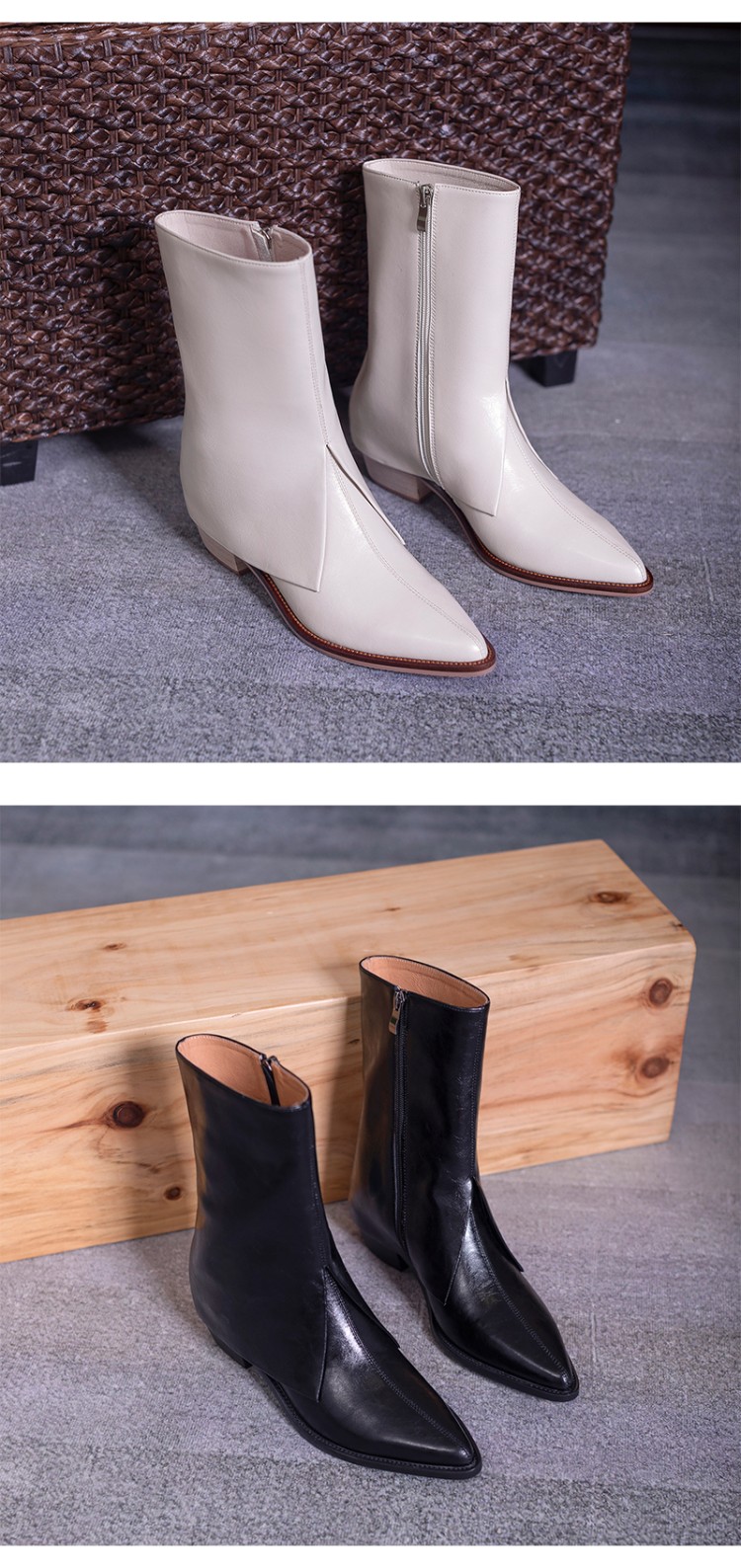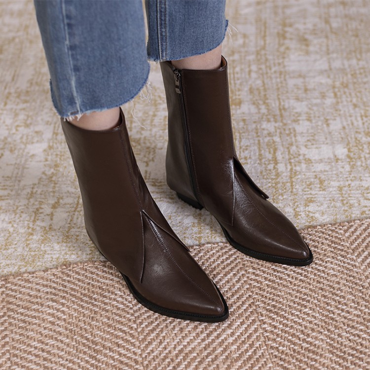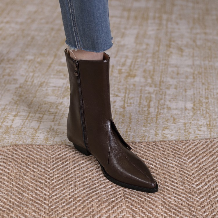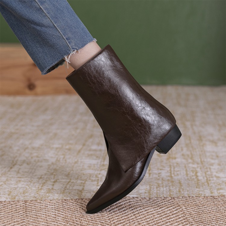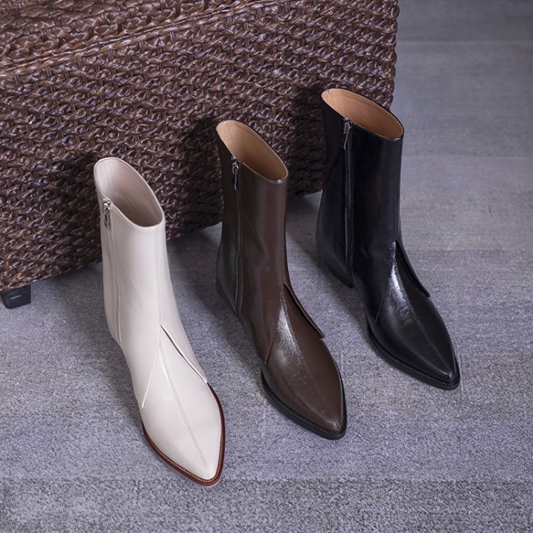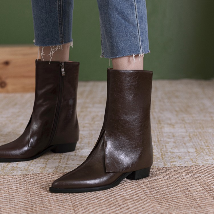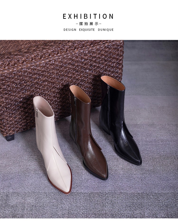 【预售5天】裤管靴女秋冬款欧美中跟短靴黑色尖头短筒靴子牛皮粗跟马丁靴168XY&A16860