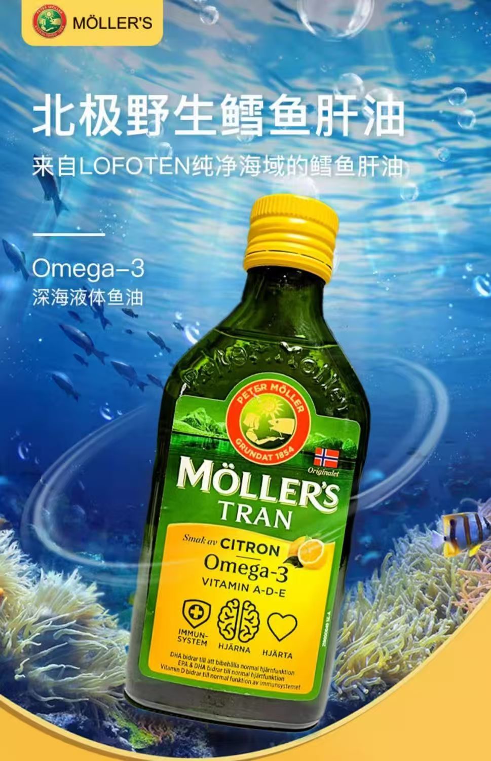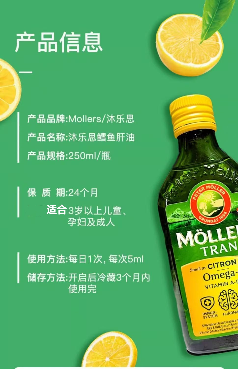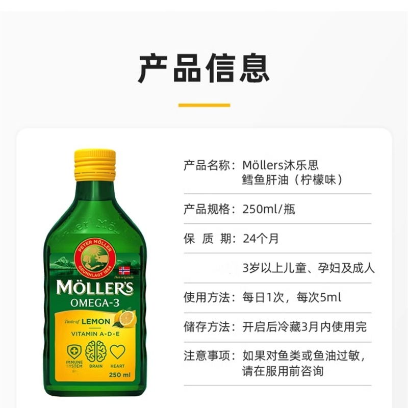 【跨境】挪威Mollers 沐乐思深海鳕鱼肝油DHA 250ml/瓶 柠檬味/苹果味/水果味 青少年学生儿童dha