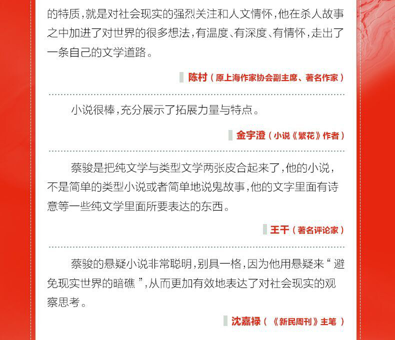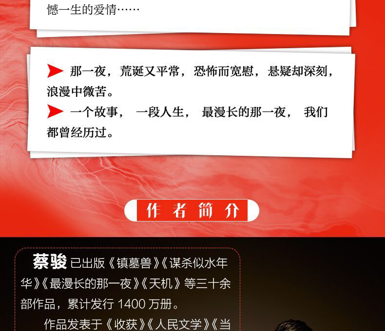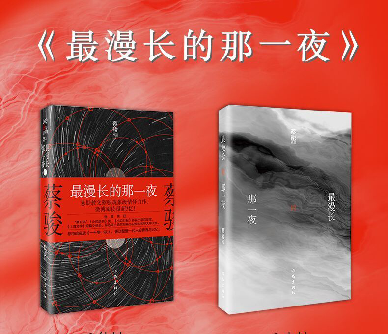《最漫长的那一夜》蔡骏:“每个人一生中都有漫长的那一夜,那是一种在困境中无助且焦虑的状态。而我们这一代中国人,在过去的二十年间依次长大,有的人失去了很多,有的人干脆直接老去,有的人至今仍然活不明白。我希望这本书可以给这些人力量。无论你是70后、80后,还是90后,无论今夜多漫长,让我们一起度过。”