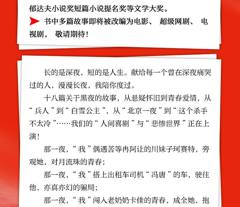 ★选篇荣获“茅台杯”《小说选刊》奖、《小说月报》百花文学双年奖、《上海文学》短篇小说奖、郁达夫小说奖短篇小说提名奖等文学大奖。众多故事即将被改编为电影、超级网剧。