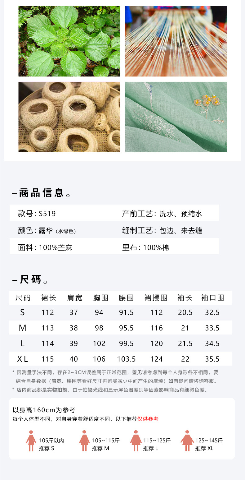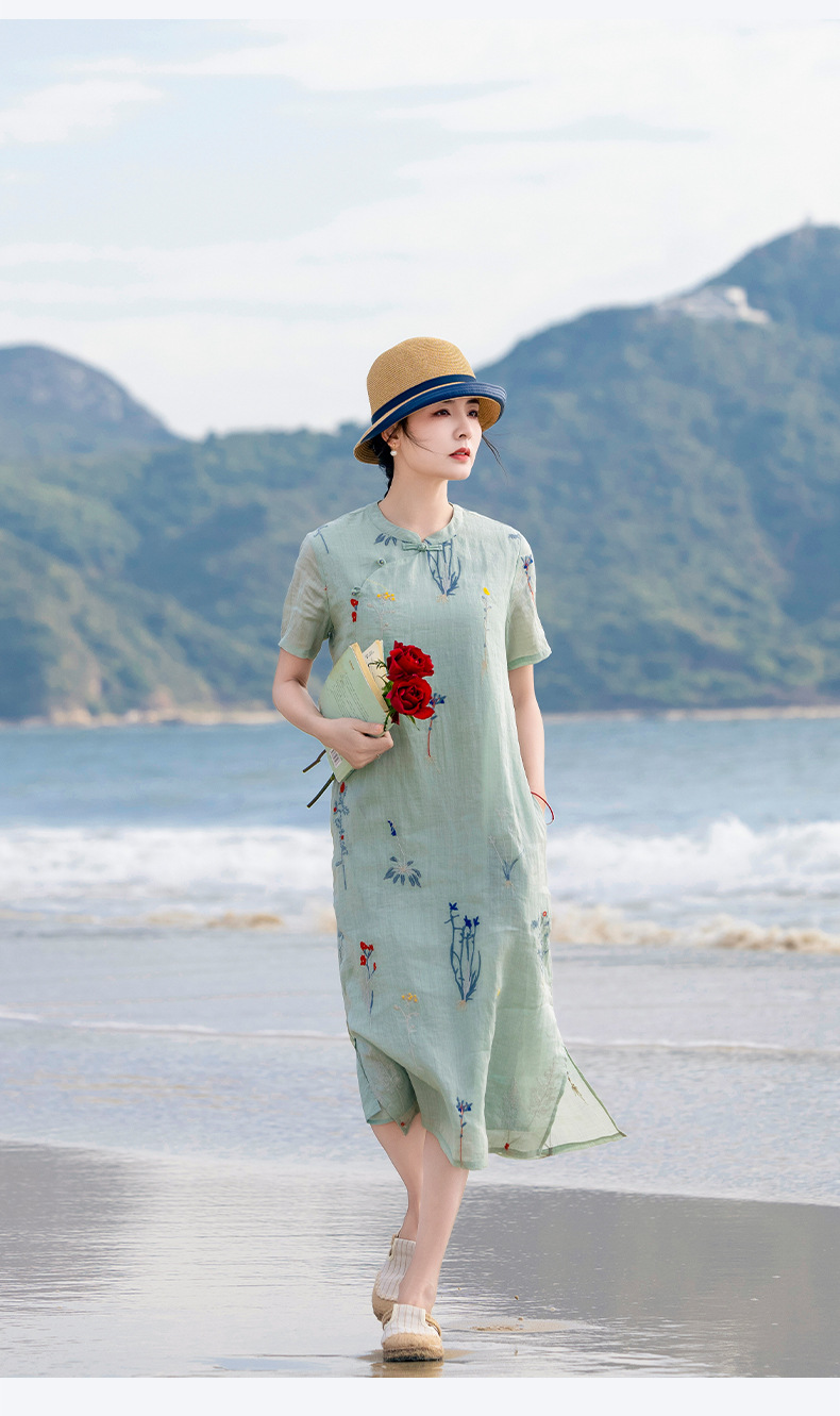 HM-S519草本植物苎麻刺绣中国风盘扣立领改良旗袍裙文艺风连衣裙夏季新款
