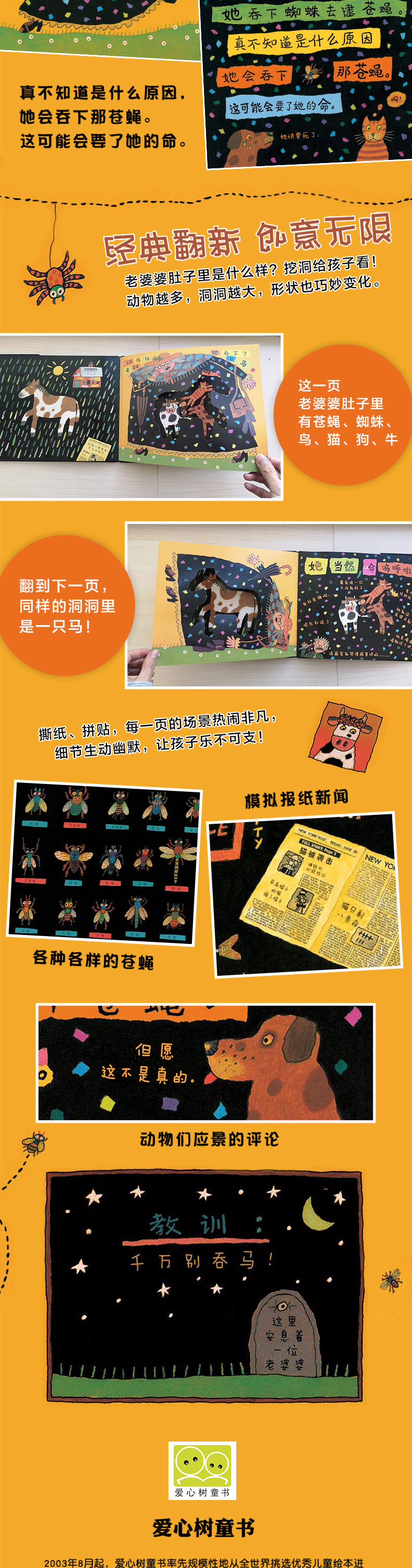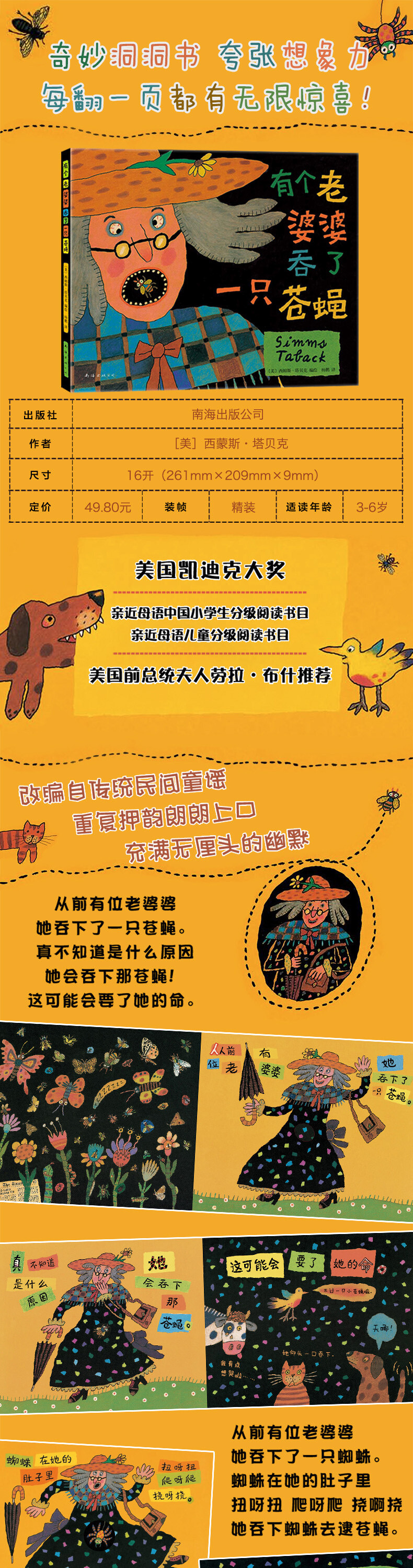 每个人都知道一个老婆婆吞了苍蝇、蜘蛛、小鸟等等一大堆东西的故事,但谁曾见过老婆婆的肚子里是啥样的?西姆斯·塔贝克用创造性的艺术手法,给小读者们带来了生动跳跃的视觉体验,赋予这首老民谣以鲜活的新生命。——《出版人周刊》