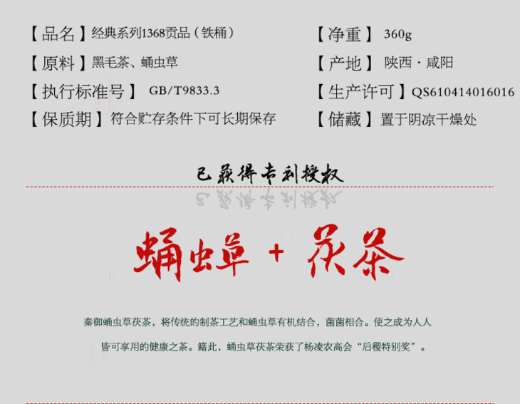 秦御蛹虫草茯茶1368贡品铁盒