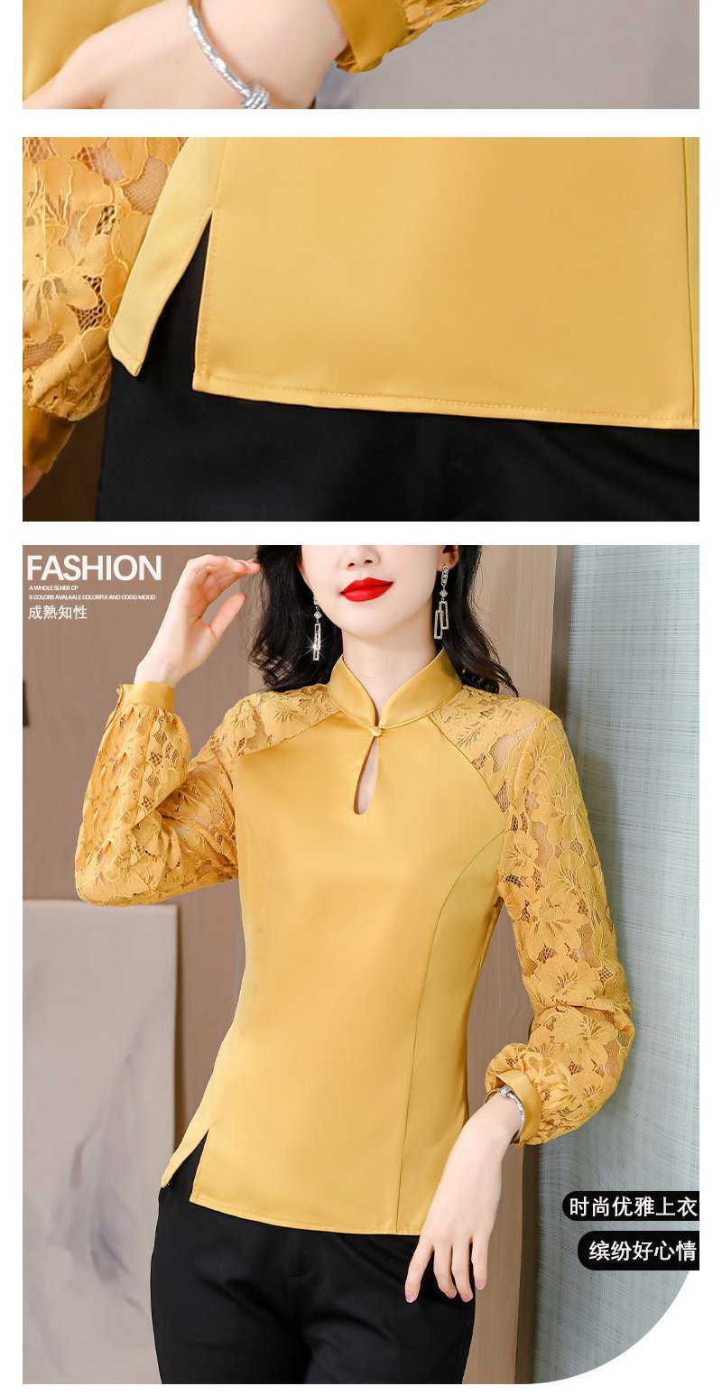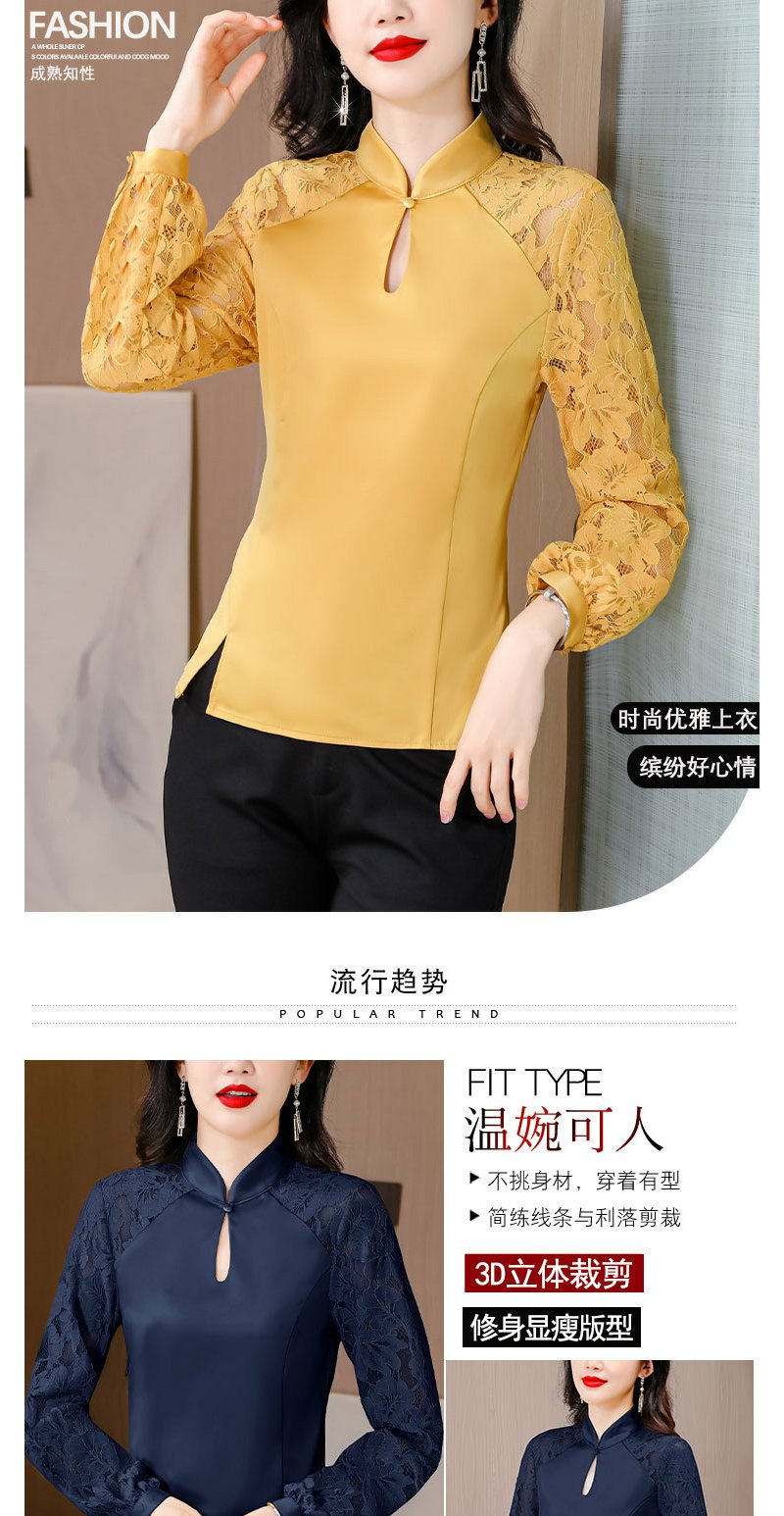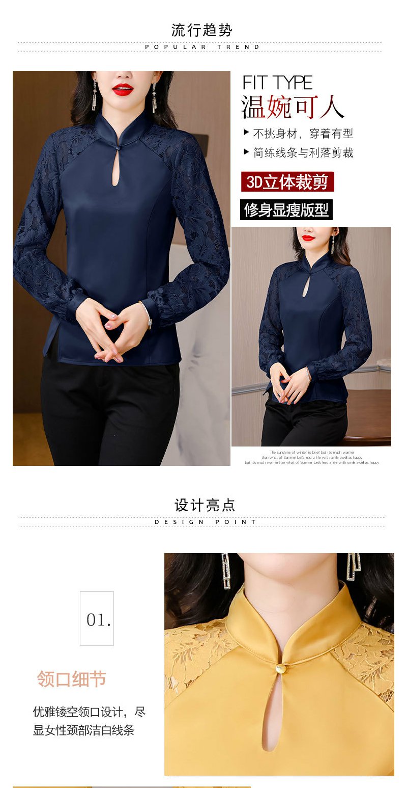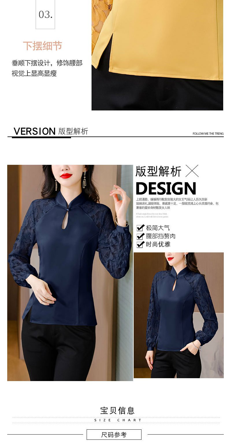 KQL-6932中国风盘扣蕾丝拼接上衣女2024春设计感立领显瘦国风修身长袖衬衫