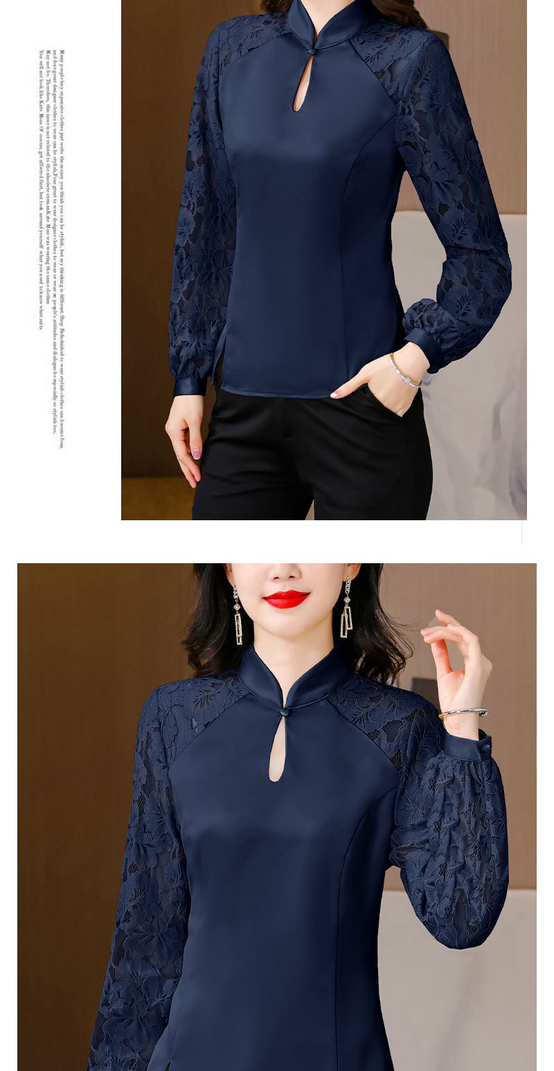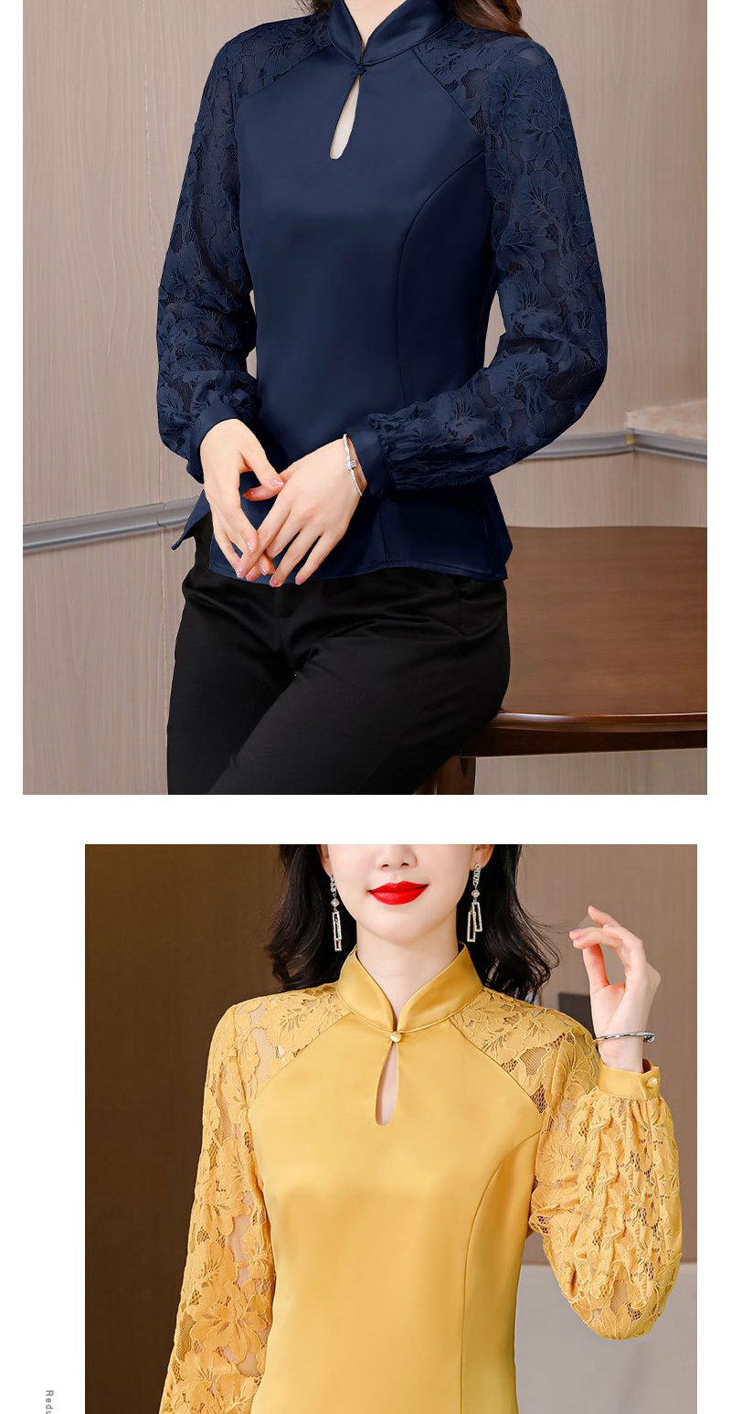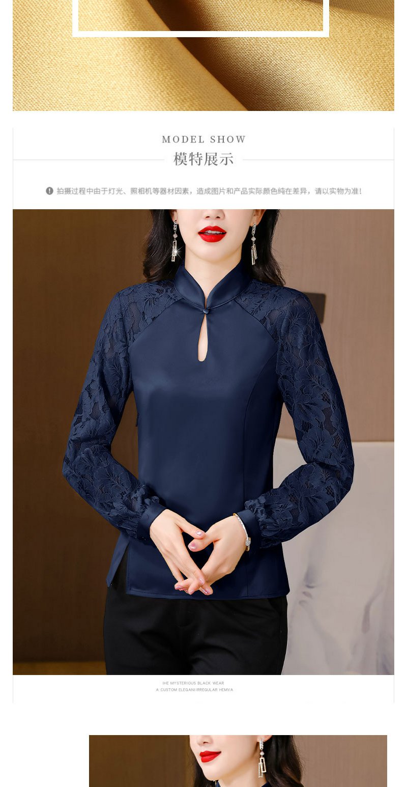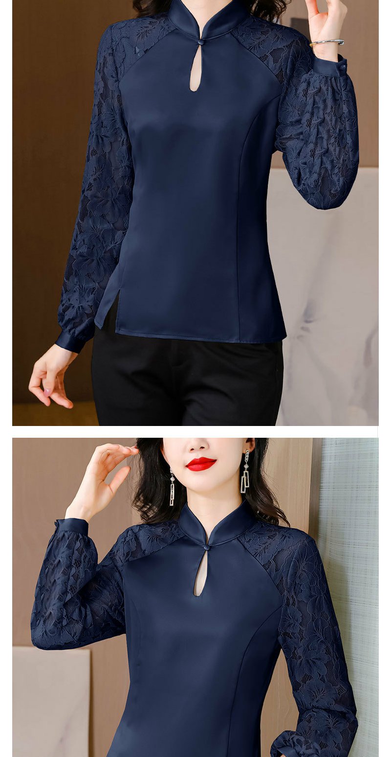 KQL-6932中国风盘扣蕾丝拼接上衣女2024春设计感立领显瘦国风修身长袖衬衫