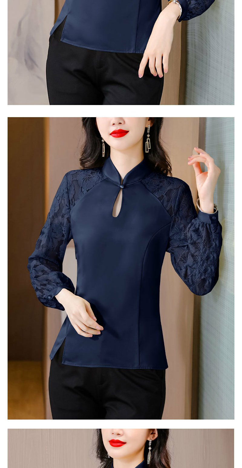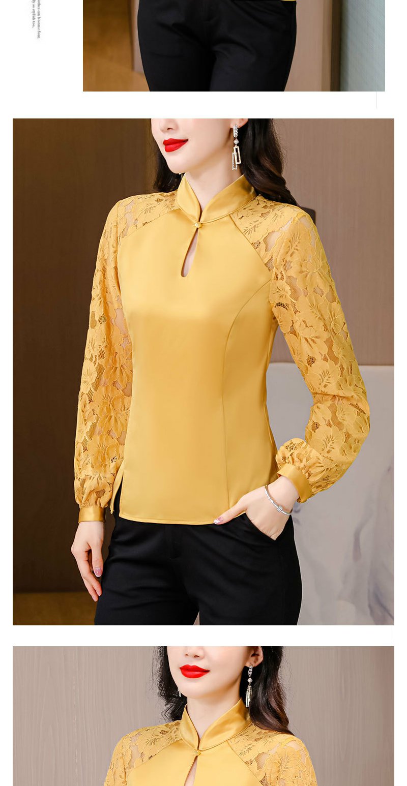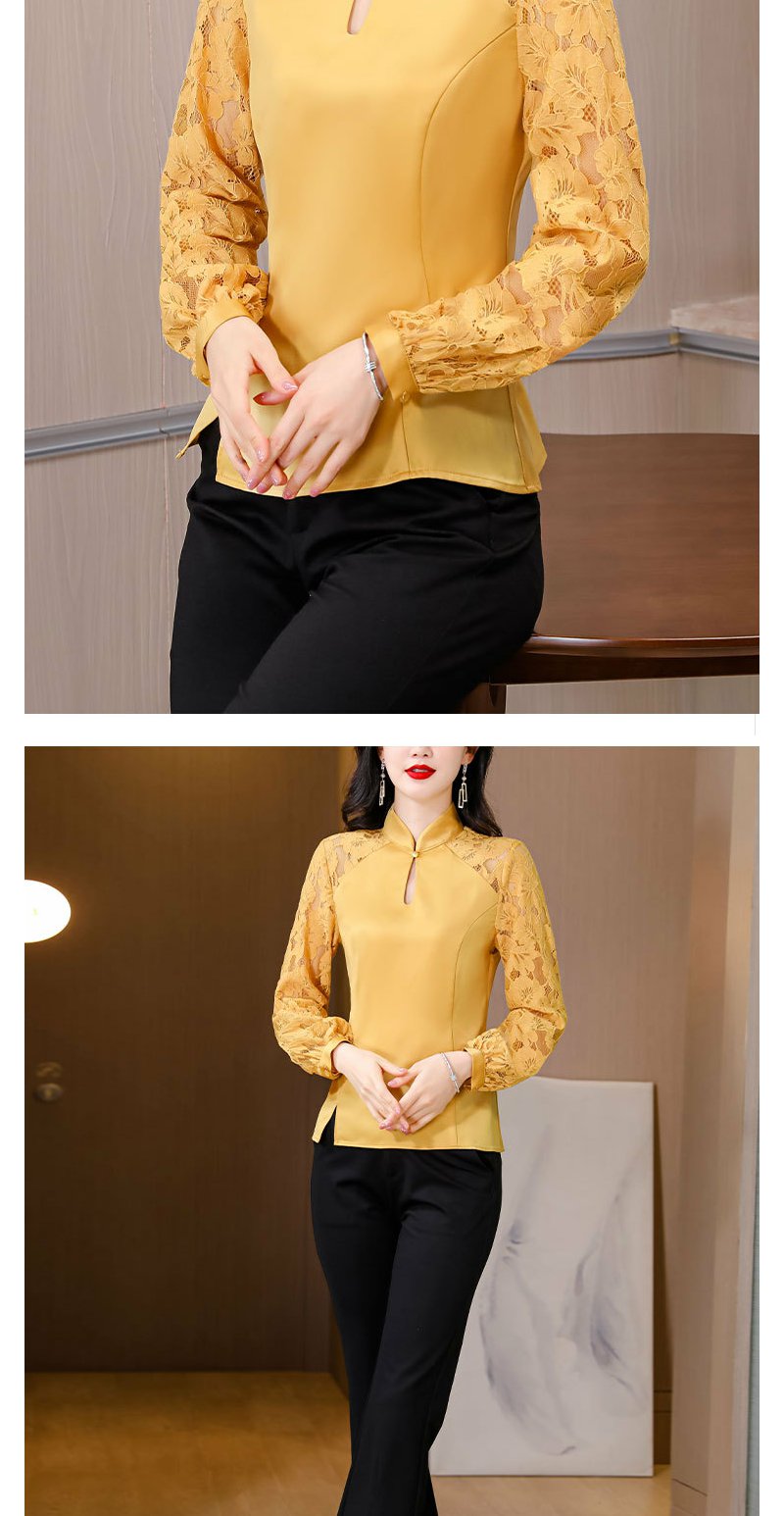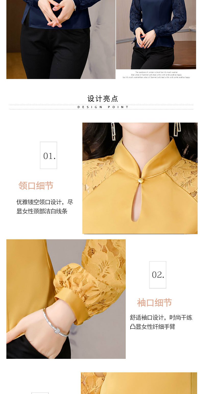 KQL-6932中国风盘扣蕾丝拼接上衣女2024春设计感立领显瘦国风修身长袖衬衫
