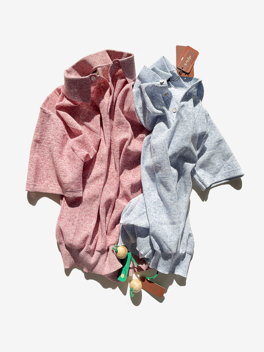 直肩设计与长度齐肘的衣袖相得益彰,尽显轻盈自在之感。
