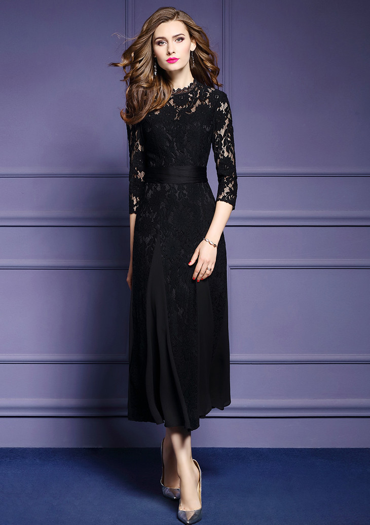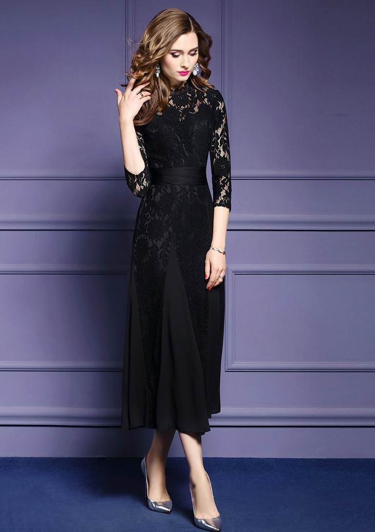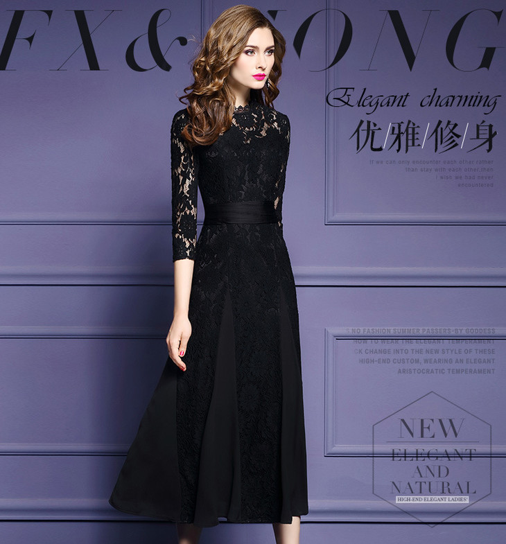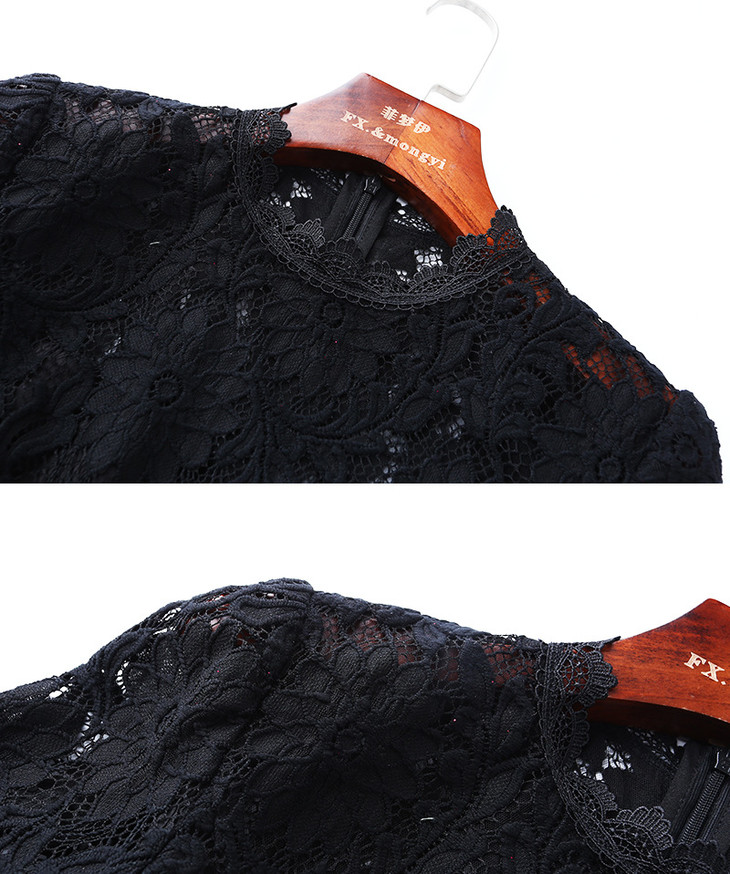 FMY-12405秋装新款黑色镂空绣花连衣裙气质优雅显瘦a字长裙