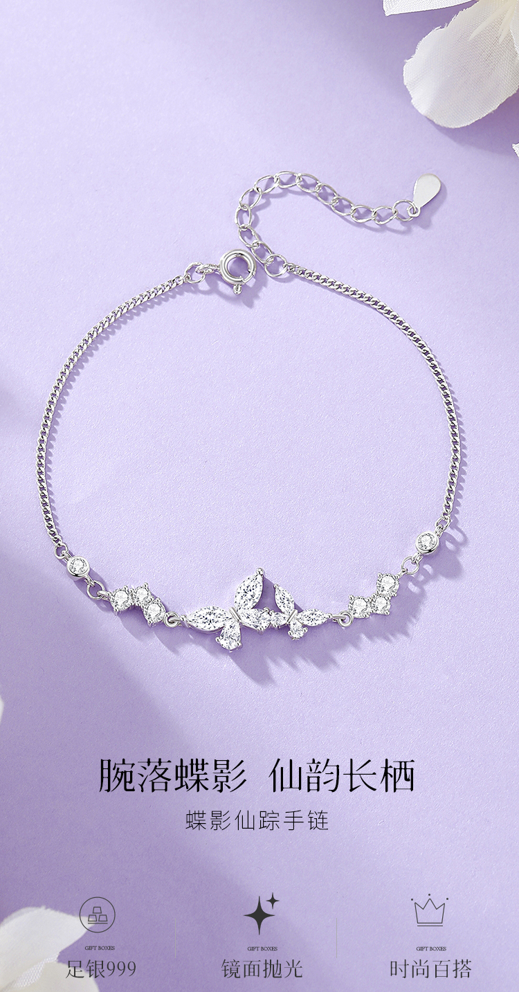 Winy 足银999蝶影仙踪手链配证书送女朋友/老婆/闺蜜生日节日礼物