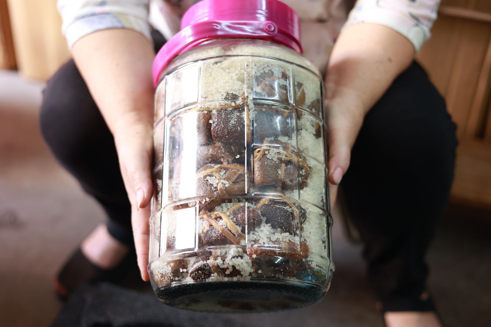 制作三宝扎的过程很简单,但是很考验耐性。首先要备好这三宝以及盐,而且它们的品质也有一定的要求。在玻璃器皿的底层撒一层粗盐,再放一层三宝扎,再撒一层粗盐,如此反复,直到放完三宝扎为止。做完后拿盖子密封,将其放置在阴凉通风处,腌制3年后食用,腌制时间越长,功效越好。用粗盐腌制的三宝扎,即使放十几年也不会变质。
