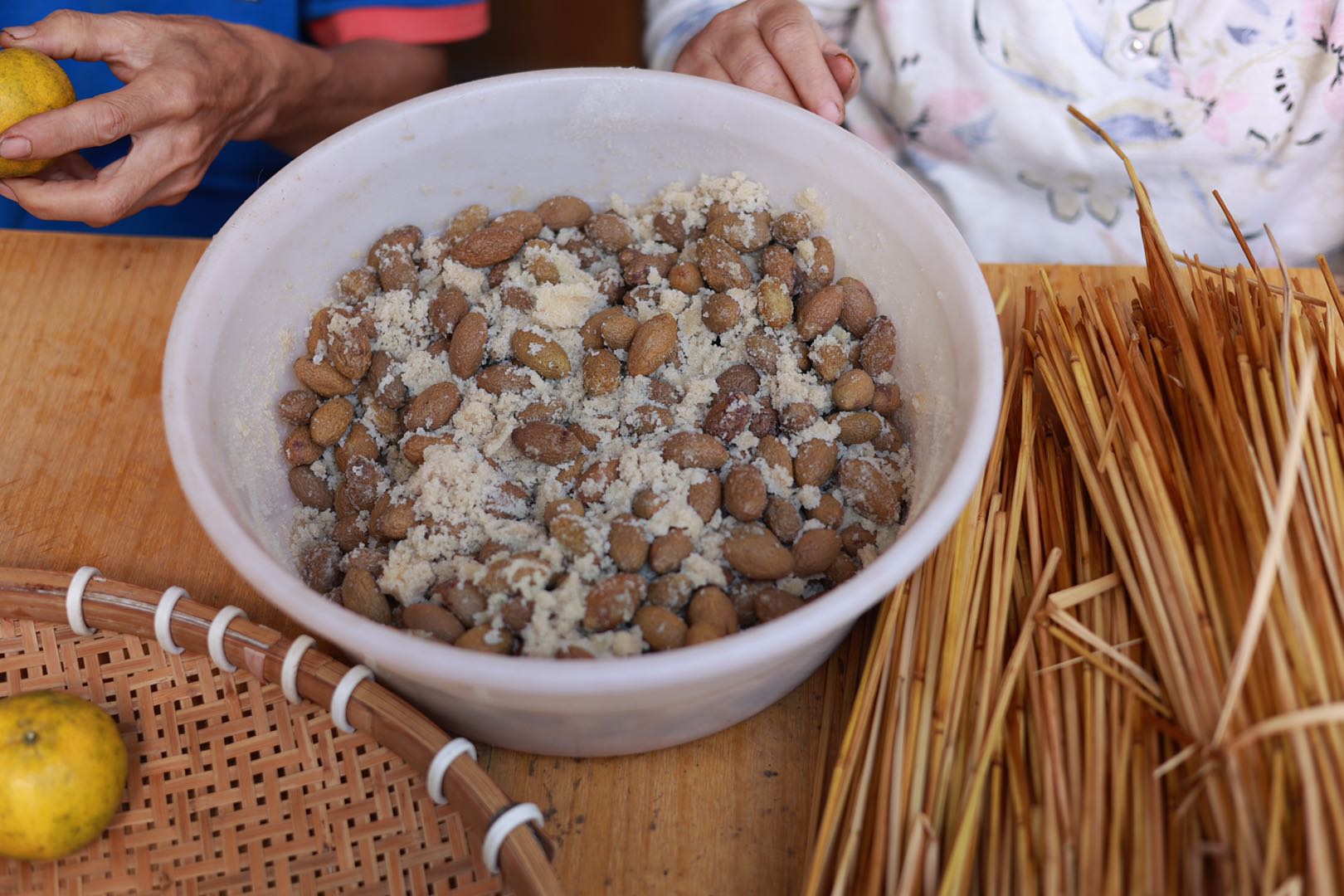 指的是新会陈皮、咸榄、禾秆草这三宝,,三宝扎的原料中,陈皮选用道地新会陈皮、用新会陈皮包裹着咸榄,再用糯米禾秆草绑起来,然后用粗盐进行腌制。