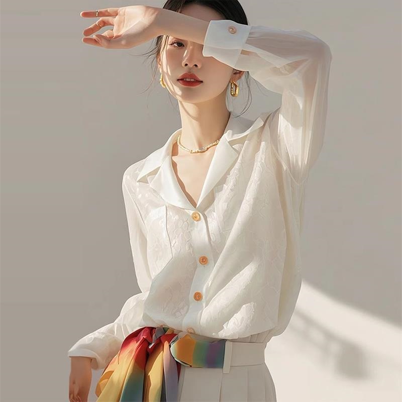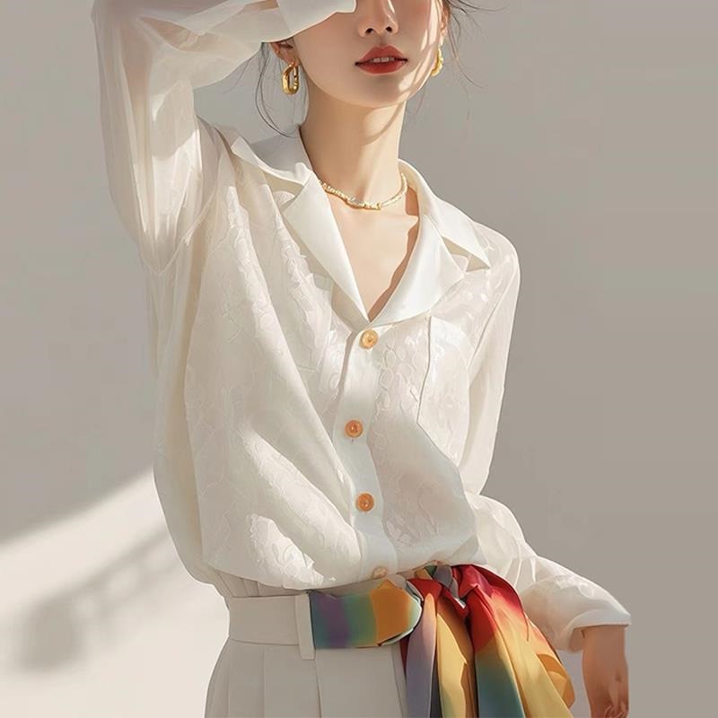 雀说 欧货提花白色长袖衬衫女春季新款独特漂亮上衣洋装通勤衬衣5ZF-1019