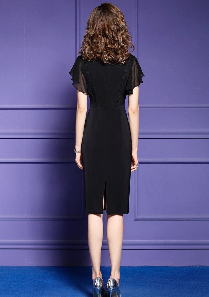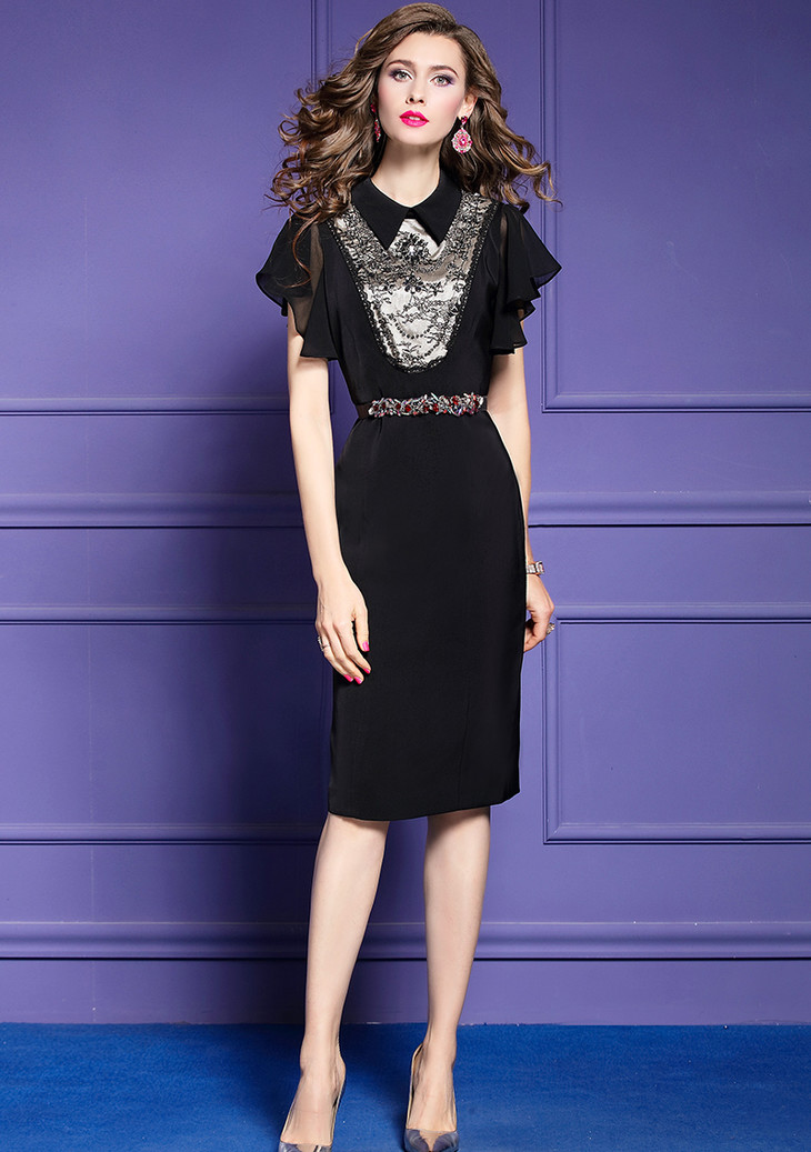 FMY-F20XL29984夏季款翻领气质修身中长款纯色钉珠连衣裙