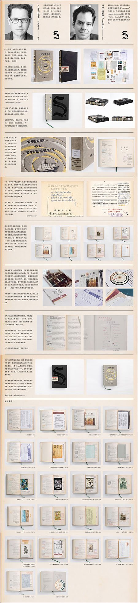 《S.》内含特意做旧的古书《忒修斯之船》,泛黄内页、霉斑、咖啡渍等均故意为之,所有附件既是书中人穿越时空留下的一手资料,也是你参与这一趟阅读冒险的重要线索。阅读《S.》的过程,更像是一个游戏、一次探险,你必须亲身参与谜题,让悬疑解谜的线索自书页中迸跳而出,由平面而立体,才能体会到 乐趣……