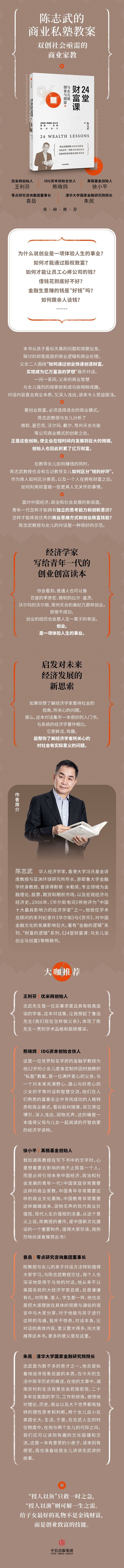 陈志武的商业私塾教案,创新型社会亟需的商业家教——“授人以鱼”只救一时之急,“授人以渔”则可解一生之需。对待子女也一样,给子女蕞好的礼物不是金钱财富,而是创业致富的技能。《24堂财富课》为中国的商业家教做出很好示范。