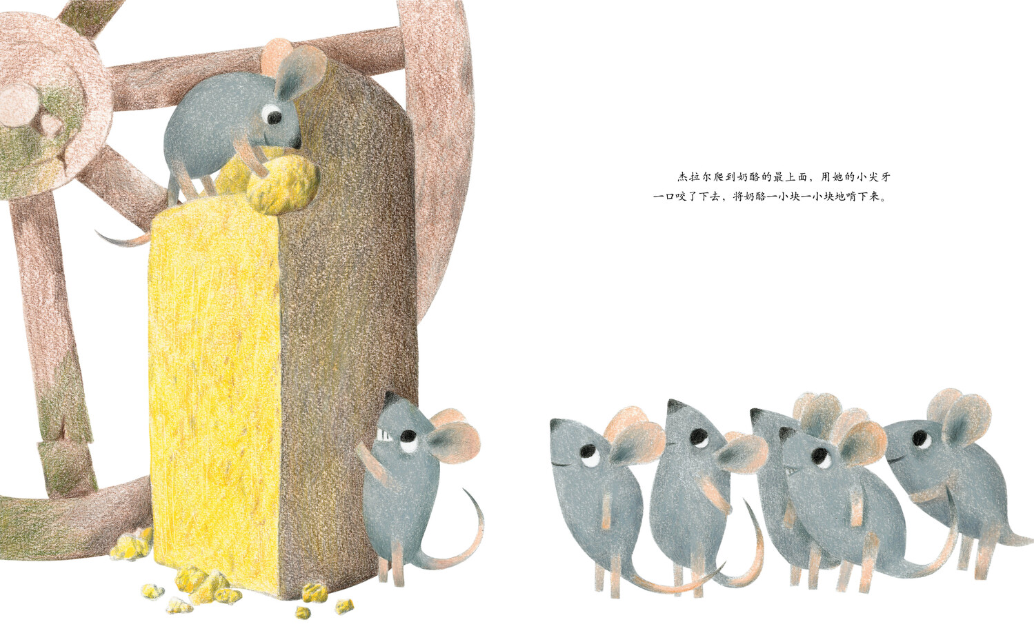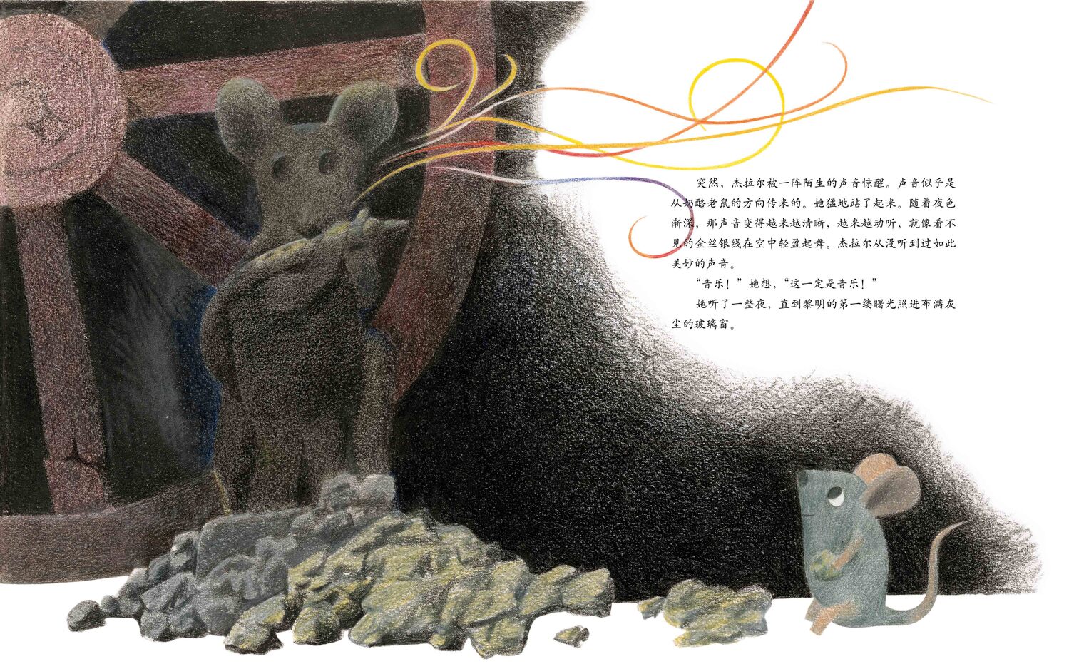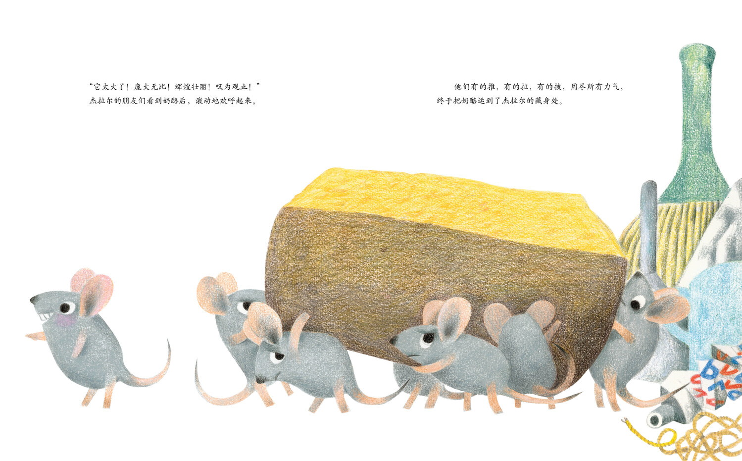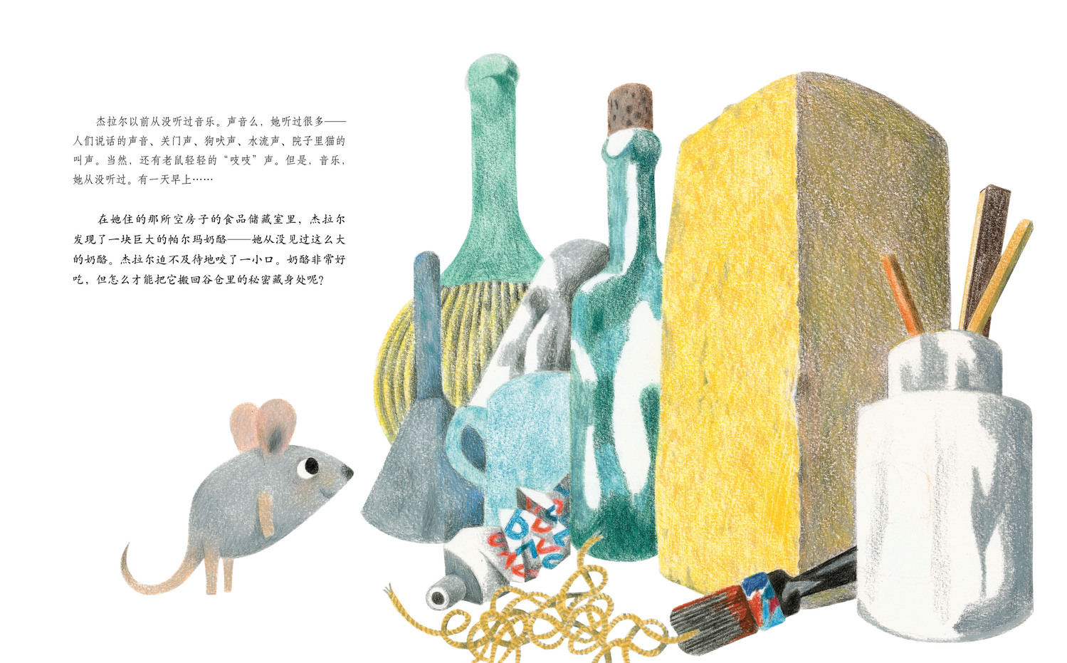 杰拉尔发现了一块巨大的奶酪,她把奶酪啃成小块,准备分给朋友们。啃着啃着,一只手持长笛的奶酪老鼠出现了!这天夜里,杰拉尔被奶酪老鼠演奏的声音唤醒。夜越深,那声音越动听,像看不见的金丝银线在空中轻盈起舞。“音乐!这一定是音乐!”杰拉尔心想。在这之前,她从未听过音乐。可是有一天,杰拉尔的朋友们要求吃掉这块奶酪,因为哪里都找不到食物了。吃掉“奶酪”,就意味着音乐消失。杰拉尔该怎么办呢?
