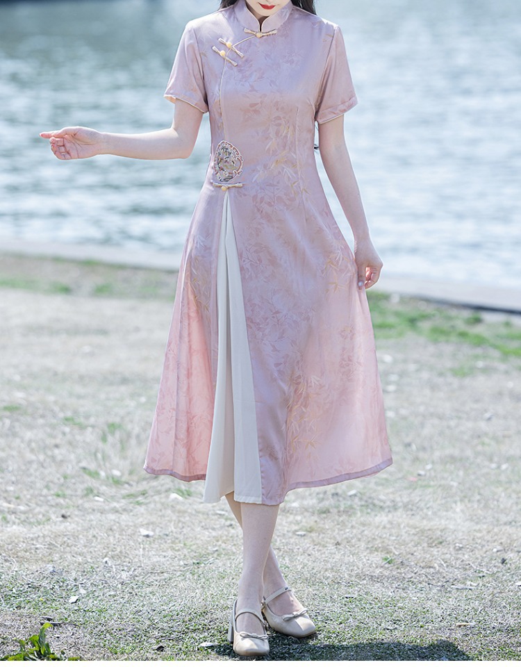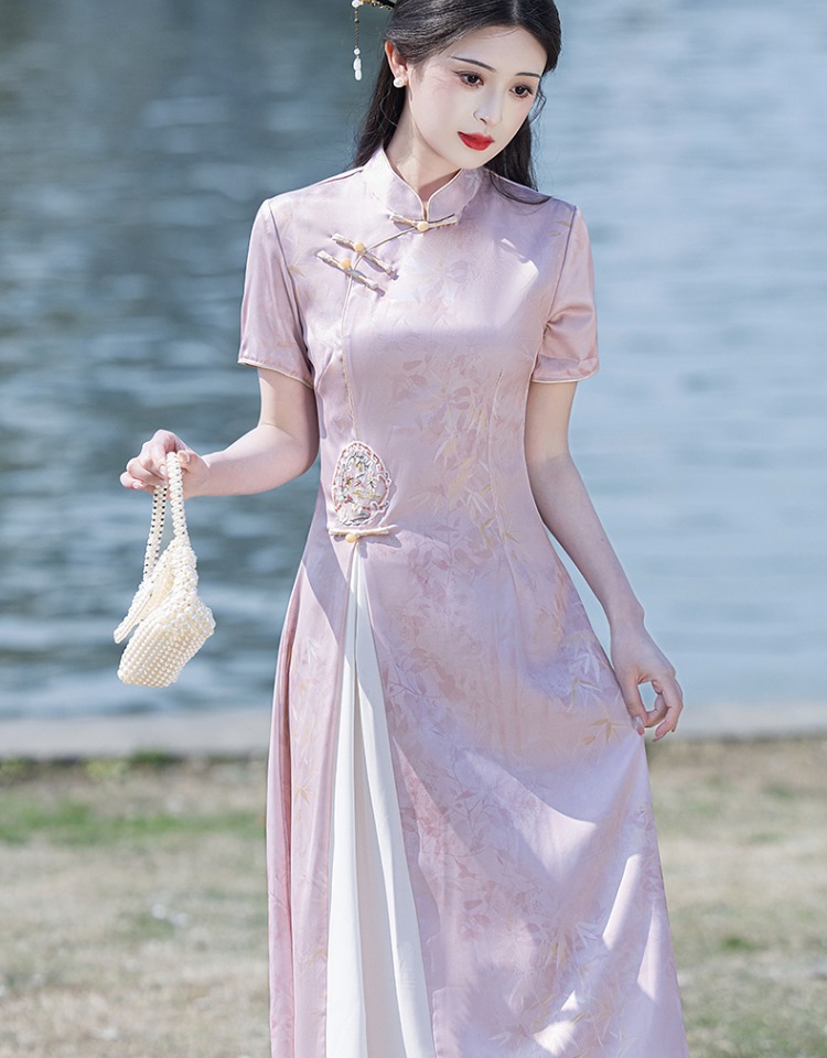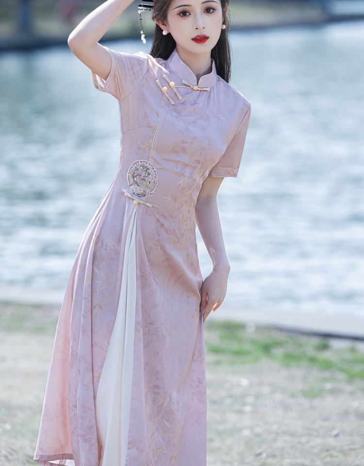 LSB3689粉色奥黛旗袍2025新款高考旗开得胜女夏季新中式日常订婚礼服裙 商品图0