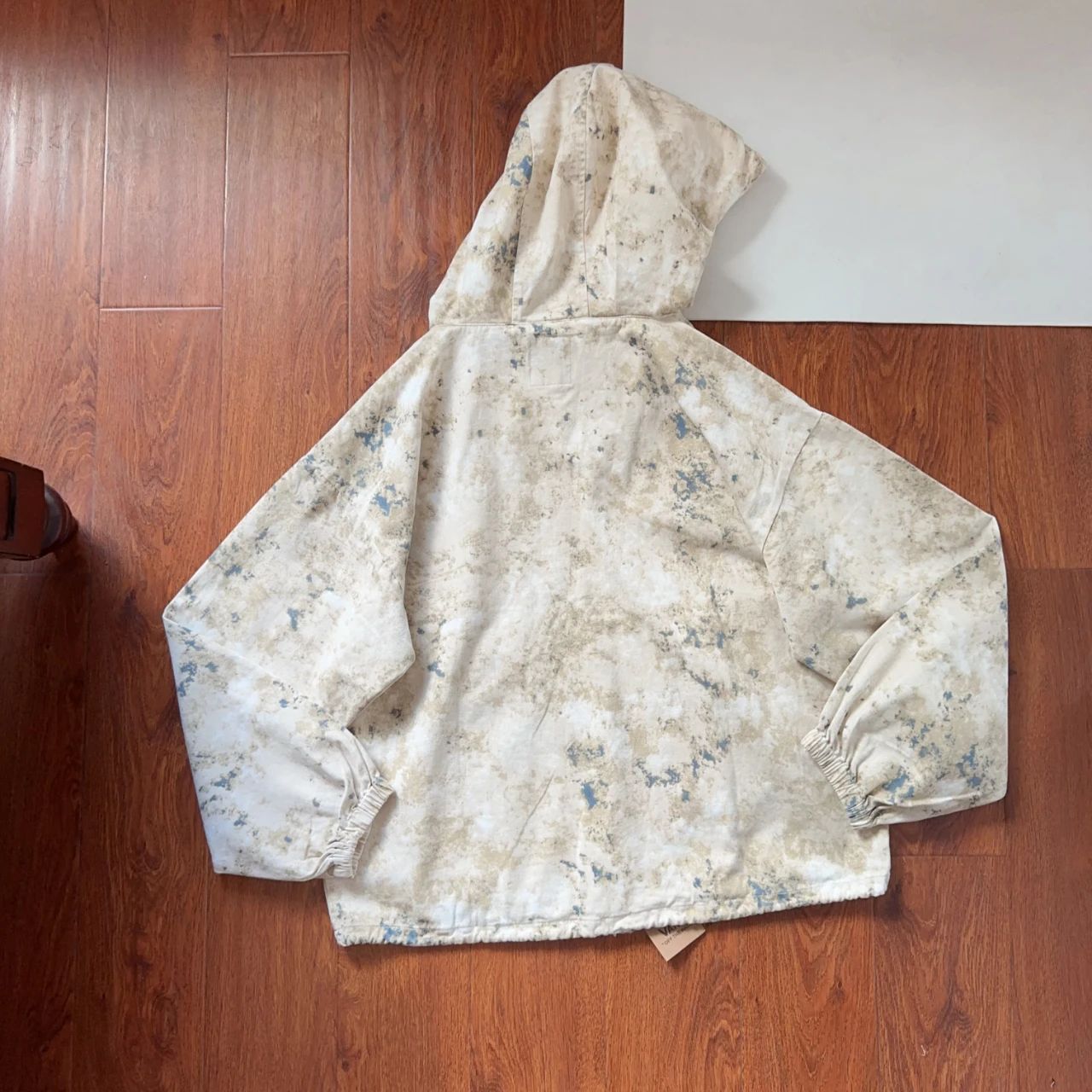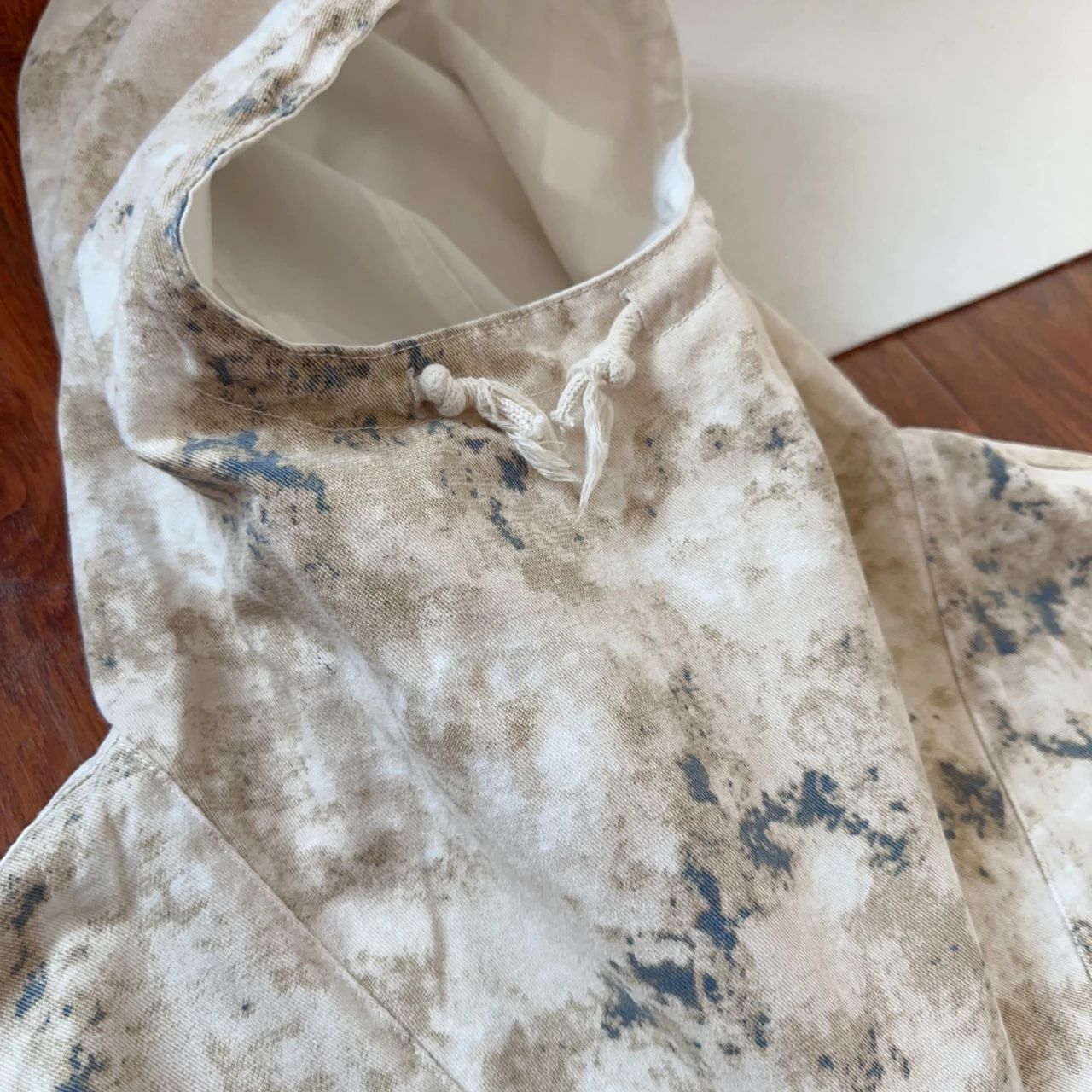 类似帆布的肌理面料,100棉,单面扎染工艺。水洗+固色,使得衣服手感更舒适,色泽自然不杂乱,不掉色。