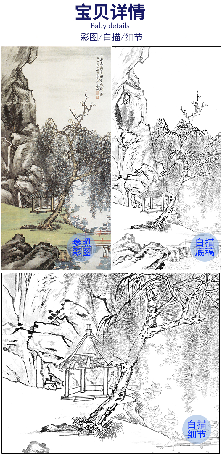 竖幅工笔画山水白描底稿-金城-《独坐观荷》-多种白描尺寸可选-JS02