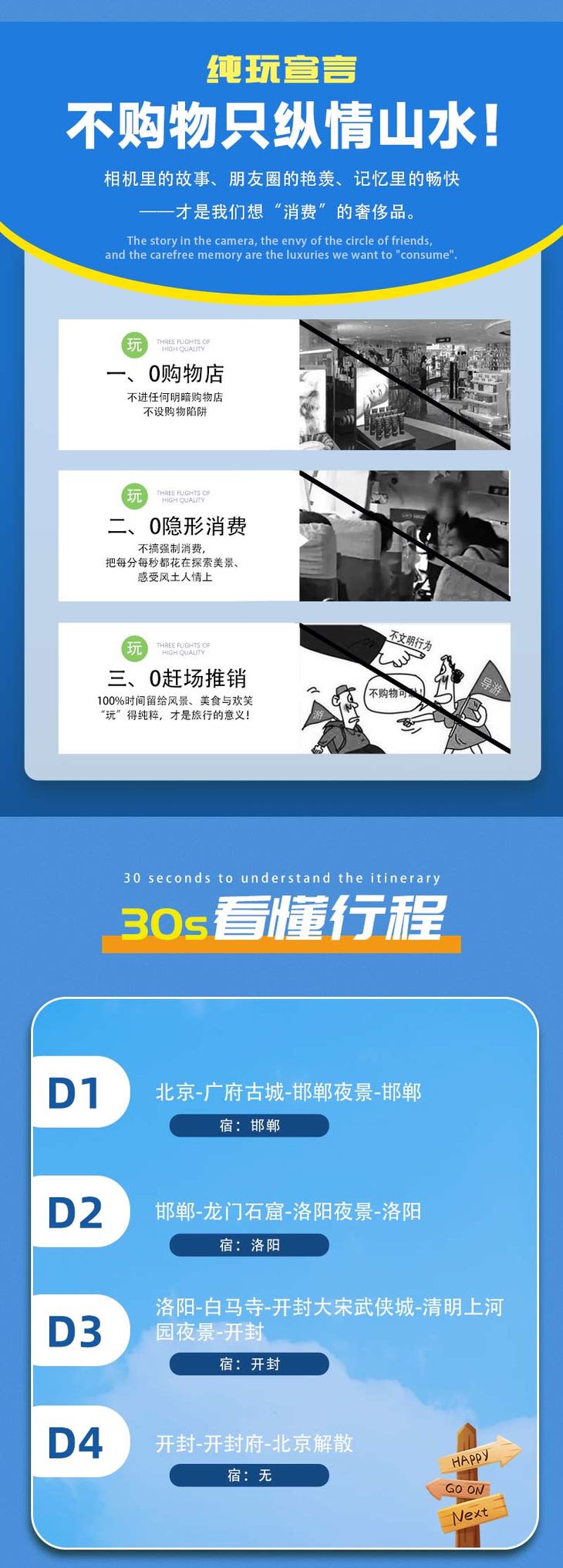 【门票】:龙门石窟需提前官网预约行程当天中午时间段门票,白马寺需预约行程当天最早时间段门票,清明上河园门票120元,《东京梦华》演出票需提前自行预约,开封府门票65元(团体59元),大宋武侠城门票100元(团体95元)。(门票价格供参考,以景区实际政策为准)。
