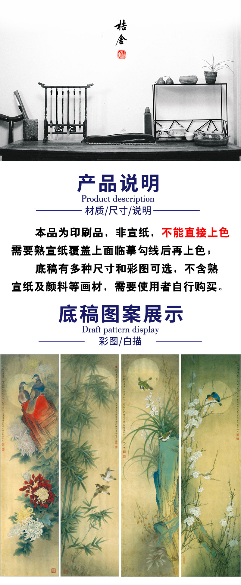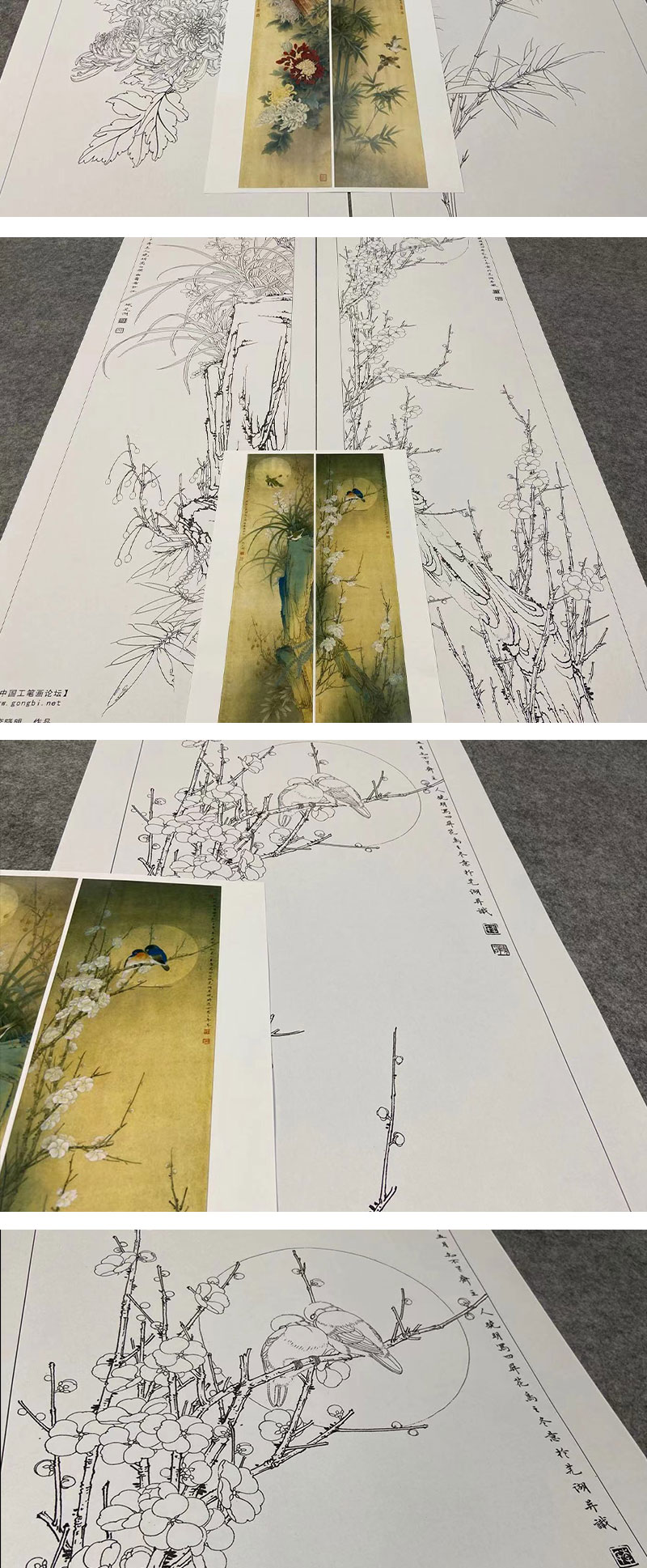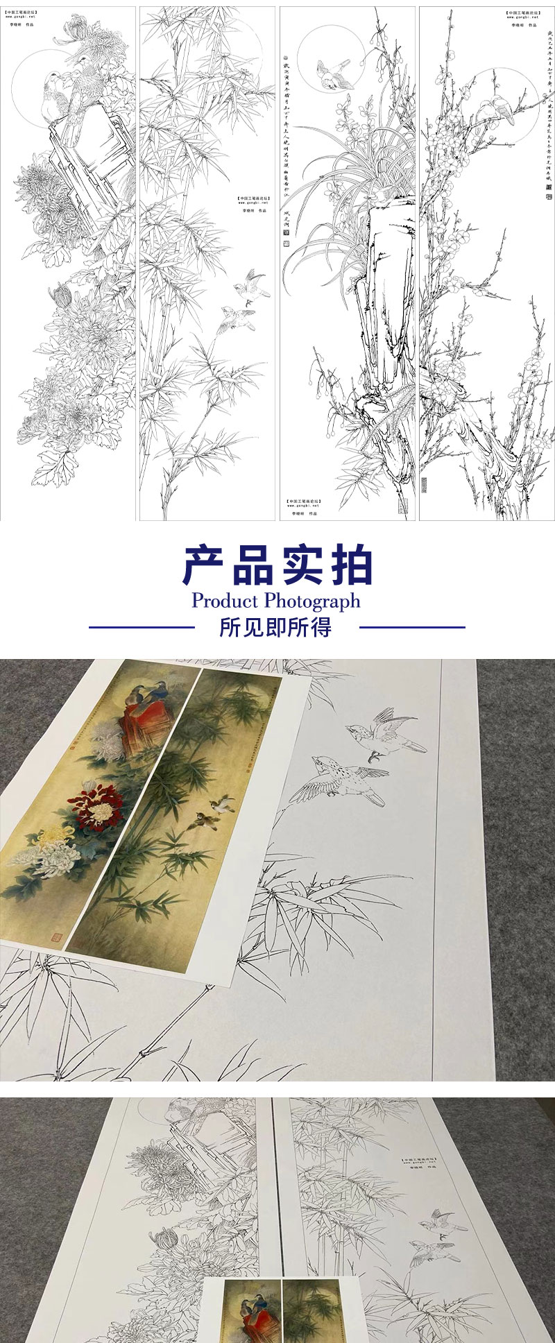 【四条屏】李晓明工笔画白描底稿《梅兰竹菊》临摹勾线花鸟线稿KA32