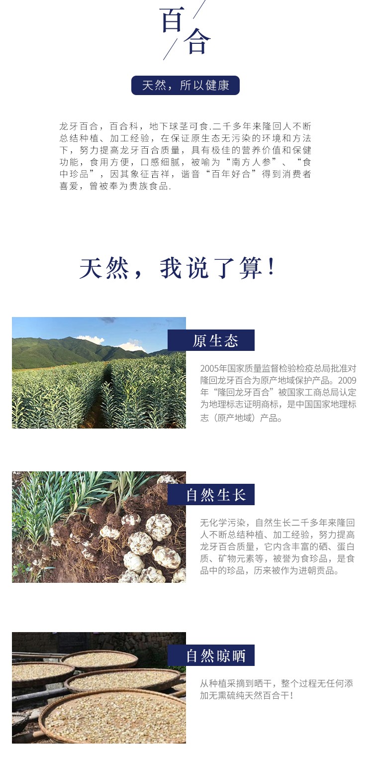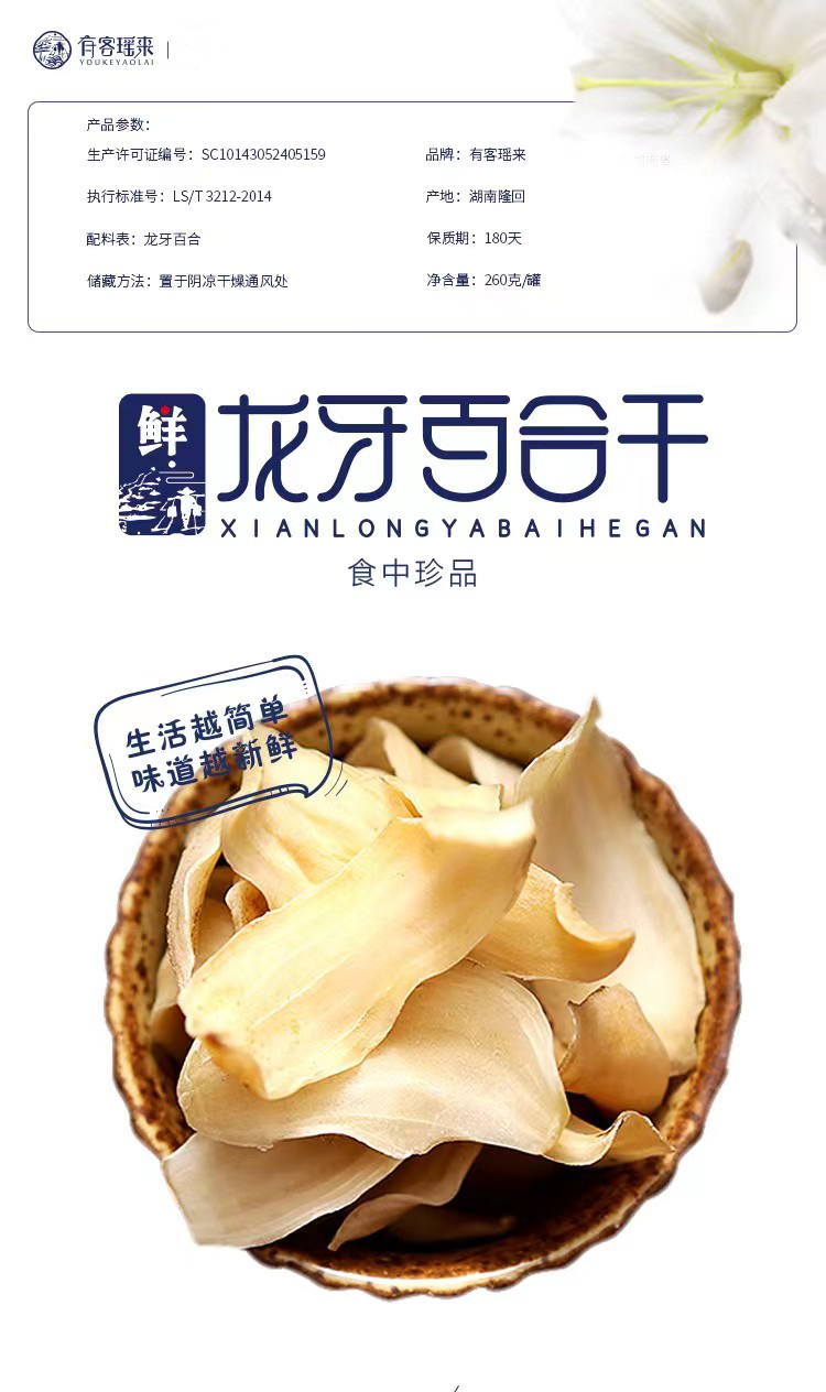 | 【品名】有客瑶来龙牙百合干 【规格】260g/罐 【保质期】180天 【储存方式】置于阴凉干燥通风处 【产地】湖南隆回 【发货地】湖南隆回 【发货快递】中通、申通 【不发货区域】新疆、西藏、港澳台地区不发 【补邮费地区】黑龙江、吉林、辽宁、北京+3元/件,内蒙古、甘肃、青海、宁夏、海南+7元件。 【发货时效】48小时,周末节假日顺延 |