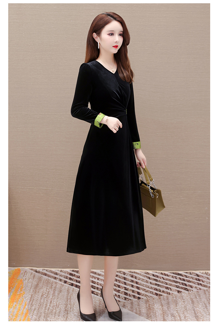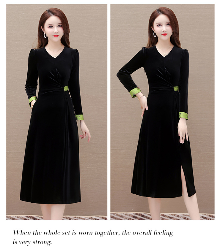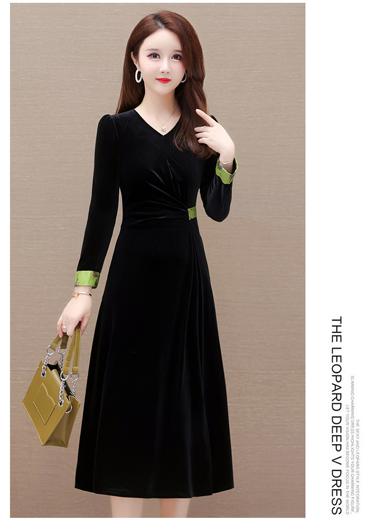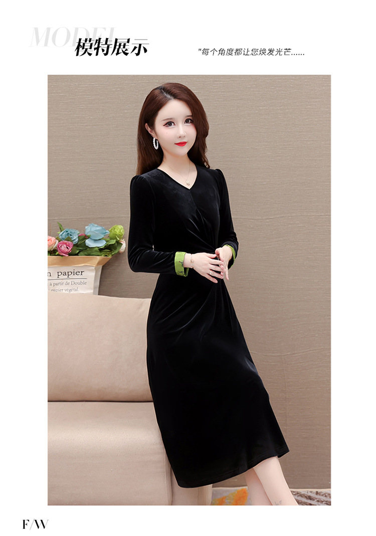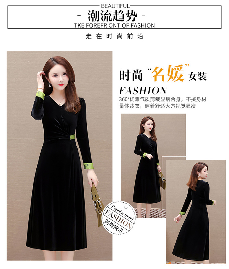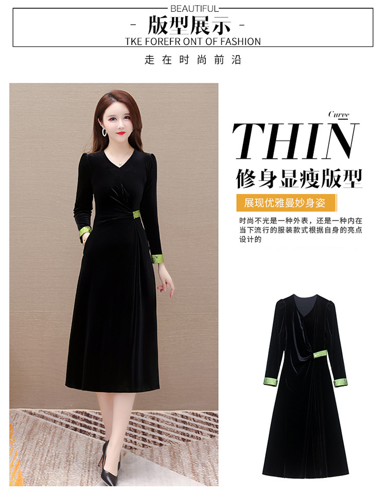 QYM 23X8327-Y金丝绒连衣裙中长裙拼色开衩A字裙 商品图2
