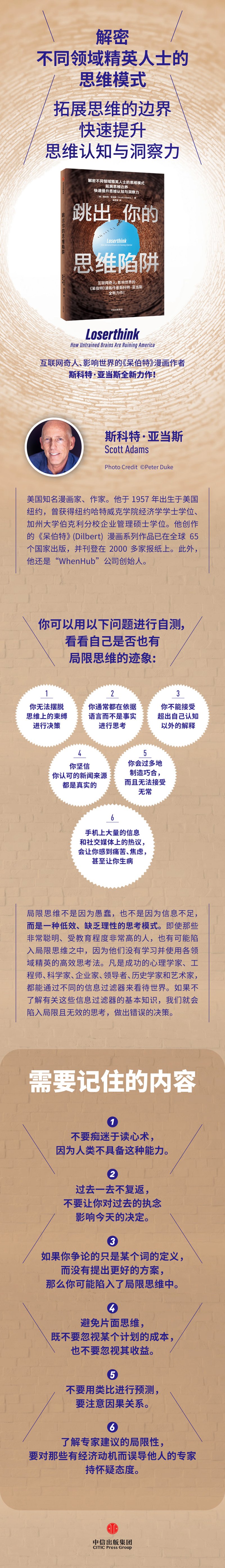 我们知道,思维决定行动,行动决定你的成败。 每个人每时每刻都在使用自己的大脑,但很多人并未学会如何理性有效地思考。从小到大,没人教给我们如何正确思考,每个人都因其成长环境及背景,拥有属于自己的特定的思维模式。 如果你目前频繁使用网络以及相关社交平台,那么你会在海量信息的轰炸下产生很多荒谬且徒劳的推理,比如:“我能推断出你在想什么”“我的想法必然是正确的”“你肯定是错误的”……你难免会受到他人言论的误导,被自己的思维定式所干扰。 风靡全球的职场漫画“呆伯特系列”的作者斯科特·亚当斯对这些形形色色的思维现象进行了研究,在他看来,当下我们中有很多人都掉进了被他称为“局限思维”(Loserthink)的陷阱中,我们会自以为是、是非不分、以偏概全……在这种思维模式下,我们被各种幻想和徒劳无益的思维所束缚,不仅缺乏认识世界、理性行事的能力,还因此做出了很多错误的决策。 局限思维让我们偏激,让我们低效,让我们愚蠢,也让我们丧失了清醒思考的能力。斯科特建议读者,通过系统的思维训练,让自己习得心理学家、艺术家、历史学家、工程师、领导者、科学家、企业家、经济学家的思考技巧,谨慎甄别所谓的“专家”之言,学会在任何问题面前保持清醒理性的思考,这样才有能力跳出危险的思维陷阱,做出更高效更睿智的决策。