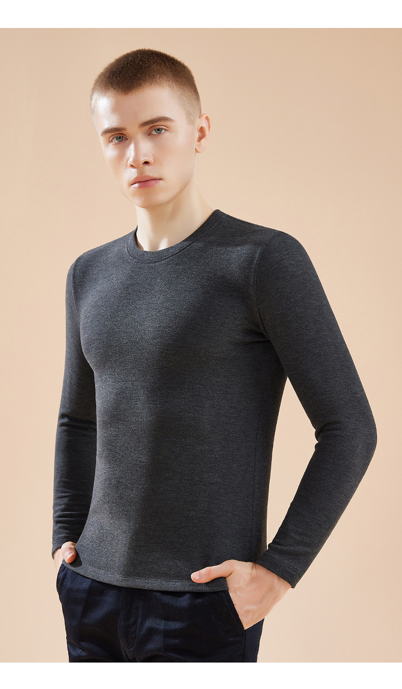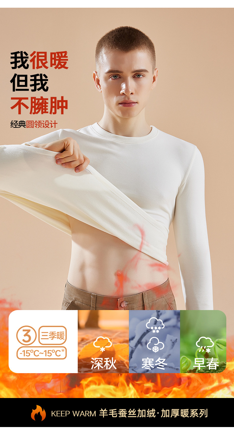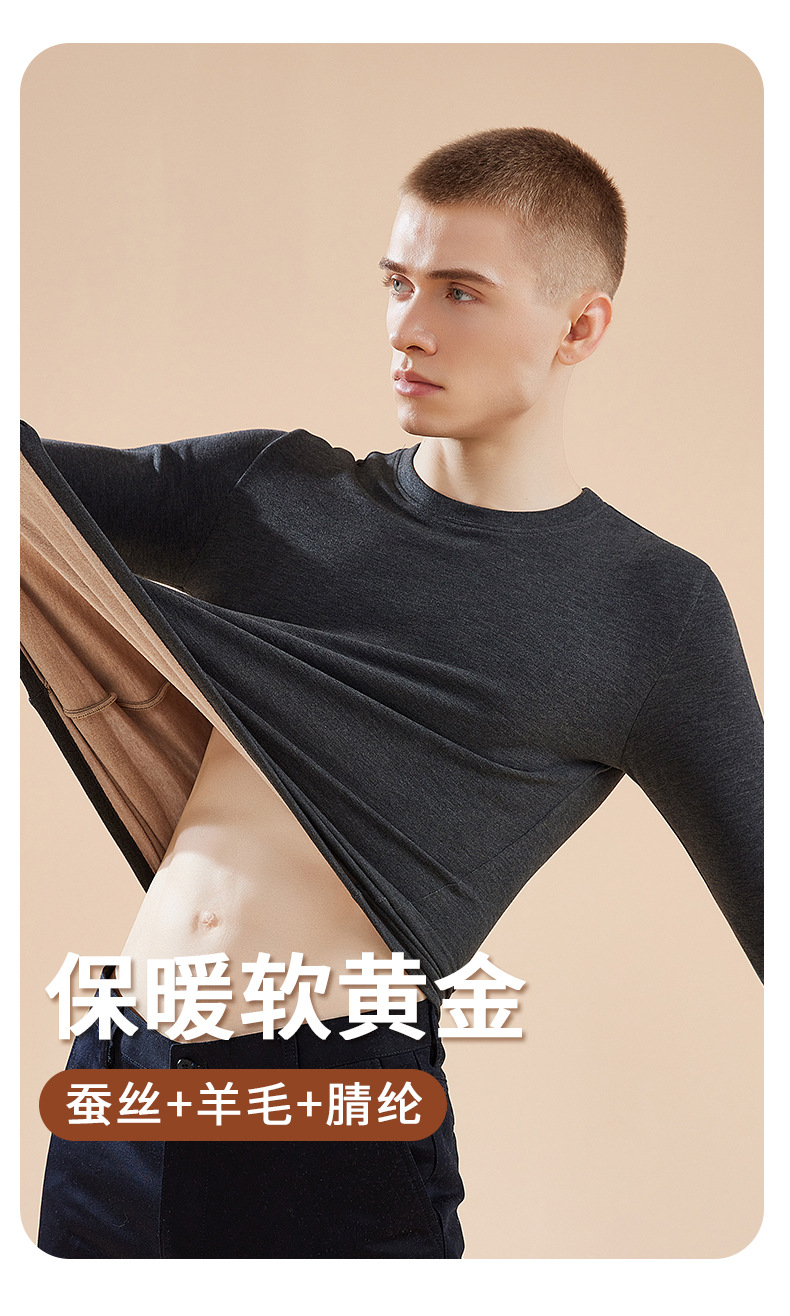 「自j」全新升级【铂金会员119/天猫159/差价40】(15453)洛诗琳发热腈纶圆领保暖上衣男士2025秋冬加绒加厚内搭打底衫蚕丝内衣含羊毛秋衣