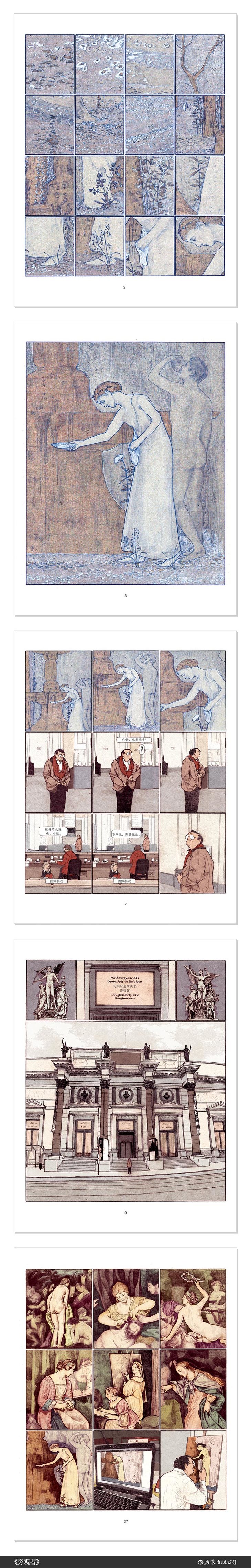 该书是作者读研期间的毕业设计,画风和表达方式耐看又有自己的味道。清淡和谐的配色受到大师温瑟·麦凯(《小尼莫》)和埃尔热(《丁丁历险记》)影响,溢出温柔和生命力;彩铅的触感区别于主流CG画风,让画面显得细腻柔和;此外,本书所有场景均取材于比利时和巴黎的著名美术馆,作者如人肉相机般将著名艺术品一一复刻,显出超强的绘画功底与对精美画面的执念,更将古典绘画与现代社会融为一炉。而用相同分镜对同一场景、不同动作的反复刻画则增强了情绪,将时间凝固于细碎的画格中,让读者跟着作者的节奏一帧一帧进行阅读,感受着主角的孤独、疏离和情感流动。