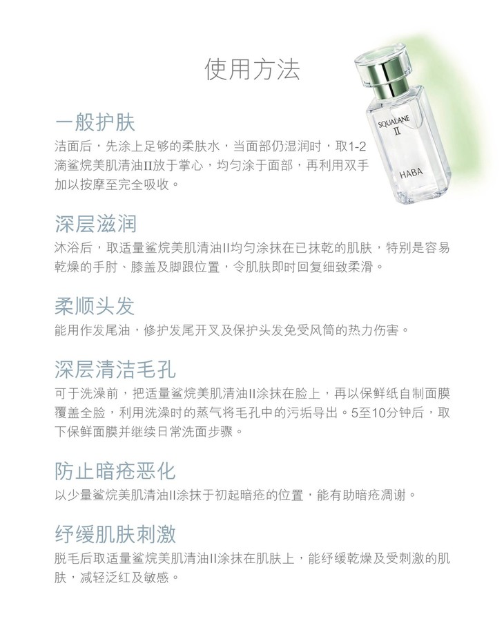 HABA鲨烷精纯美容油30ml 二代👍敏感肌红血丝的救星,过敏急救褪红,修复红血丝,温和补水💦,呵护脆弱肌,适合各类肤质人群。鲨烷美容油主打温和无添加✅,纯度高达99.9%,超强修复维稳,可以从表层迅速渗透底层,给细胞补氧,加速新陈代谢,修复受损,促进胶原蛋白和弹力纤维的生成⬆,增加细胞的后续吸收力。二代鲨烷美容油是从多种植物萃取而成,使用感比一代更清爽哦。